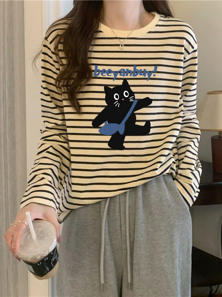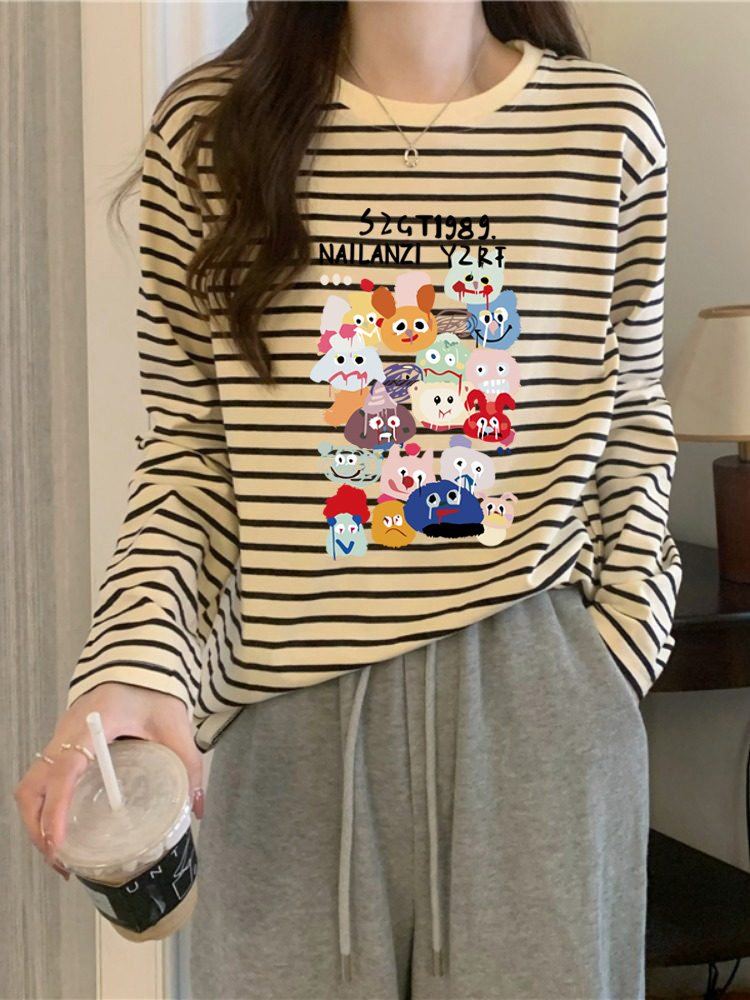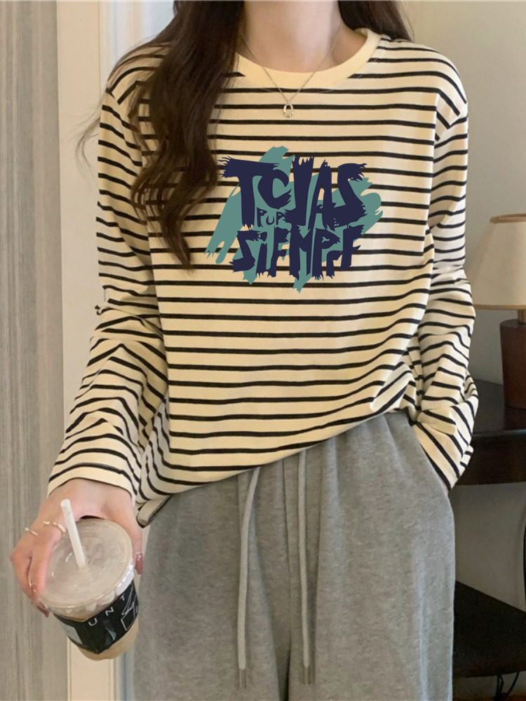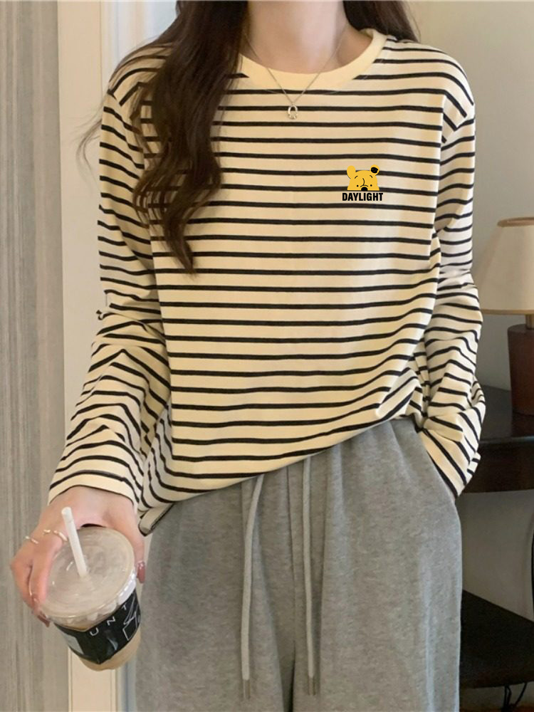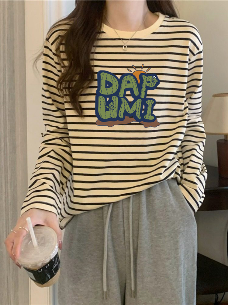 2025 New Striped Long Sleeve T-Shirt Women's Korean Style Loose Casual Fashion Easiest for Match Cotton Top Spring Autumn Winter