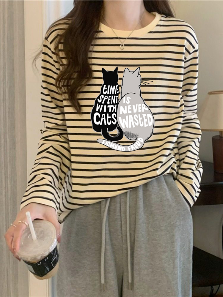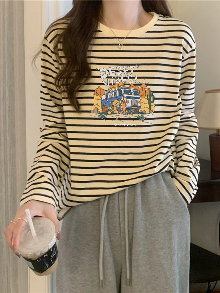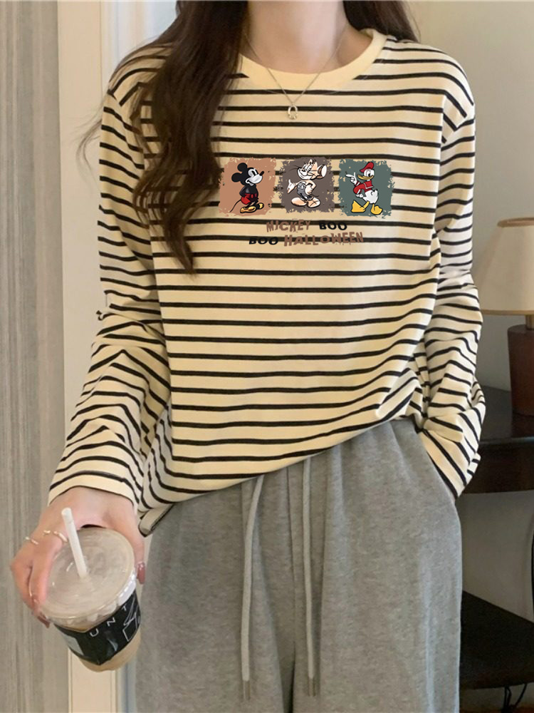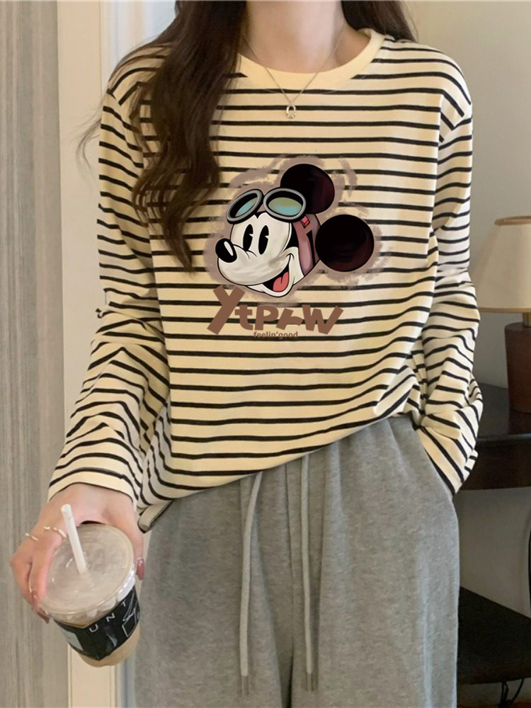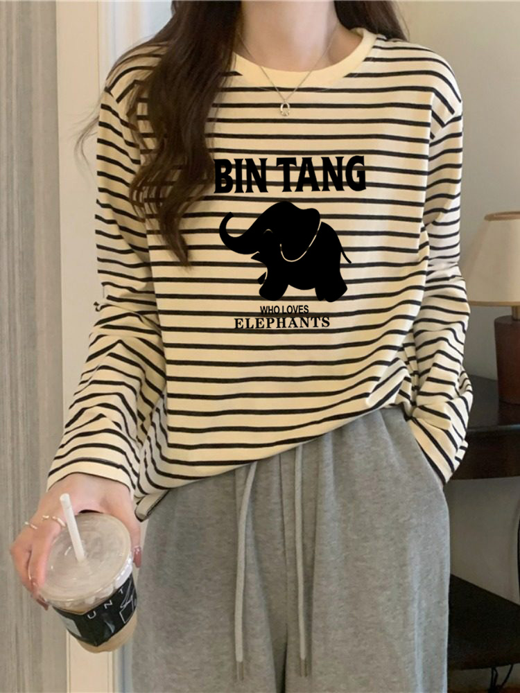 2025 New Striped Long Sleeve T-Shirt Women's Korean Style Loose Casual Fashion Easiest for Match Cotton Top Spring Autumn Winter