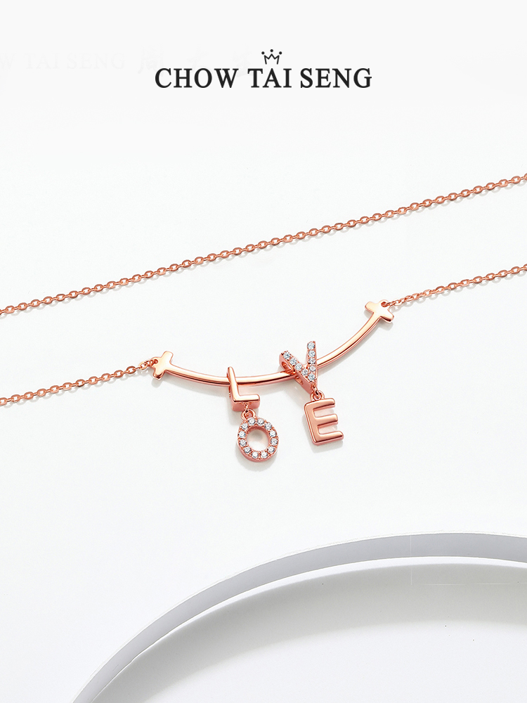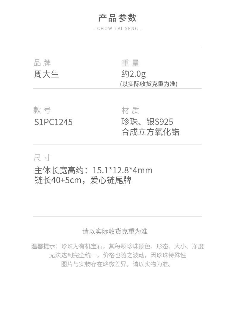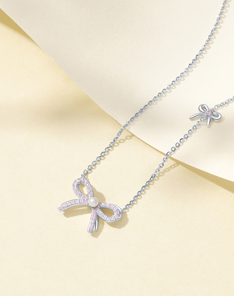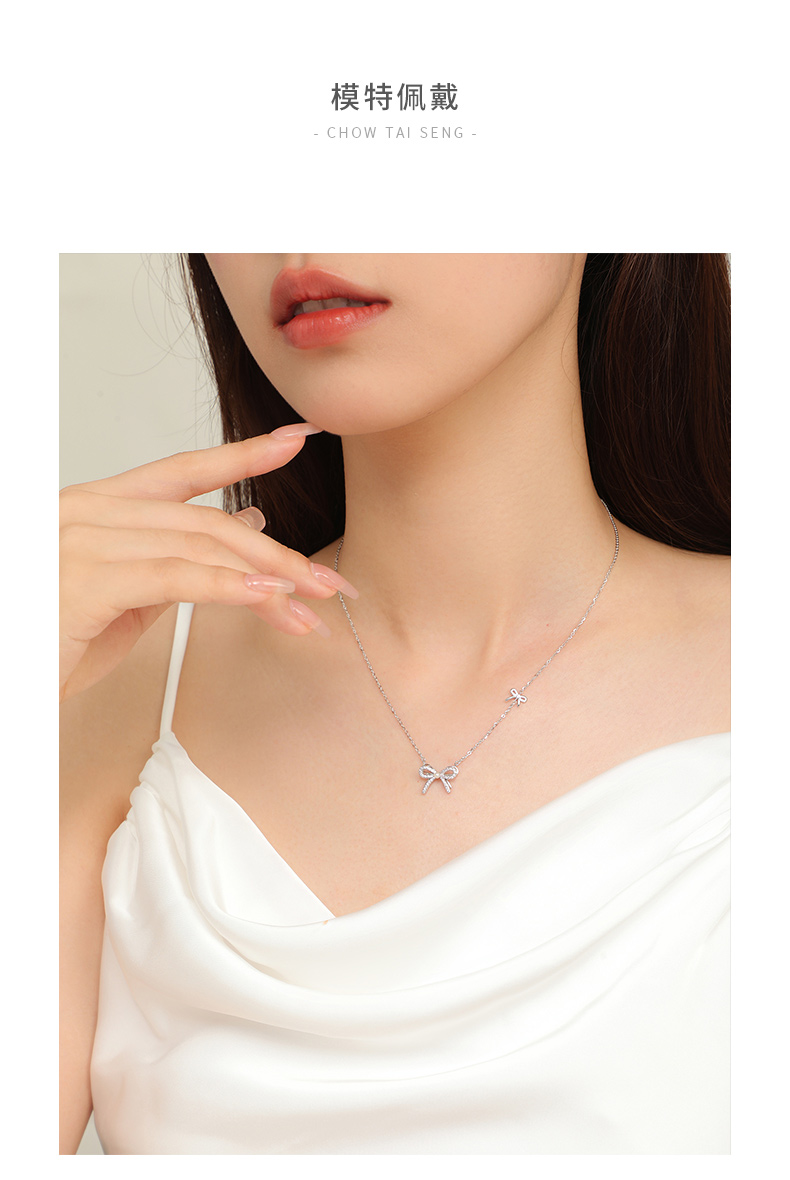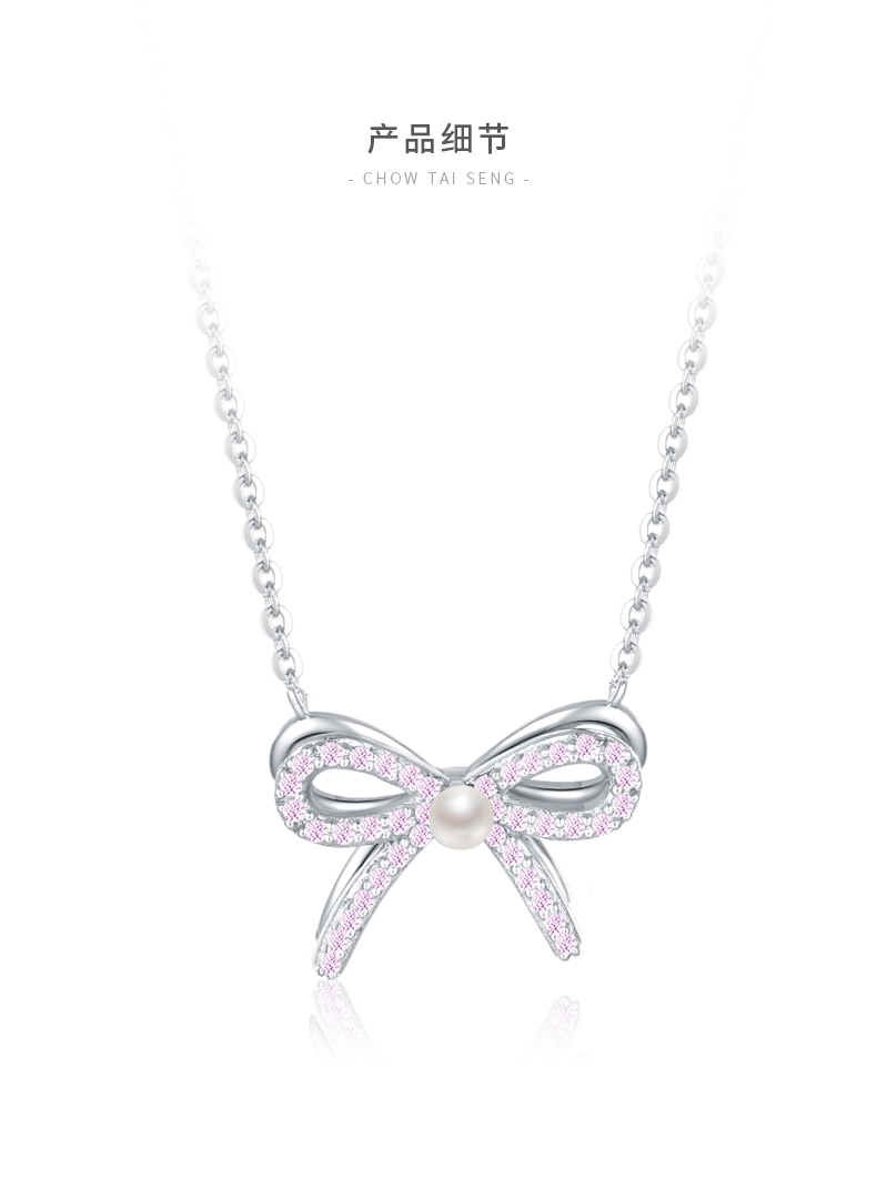Chow Tai Sang S925 Silver Bowknot Pearl Necklace, Light Luxury and High-End Clavicle Chain, Birthday and Christmas Gift for Girlfriend