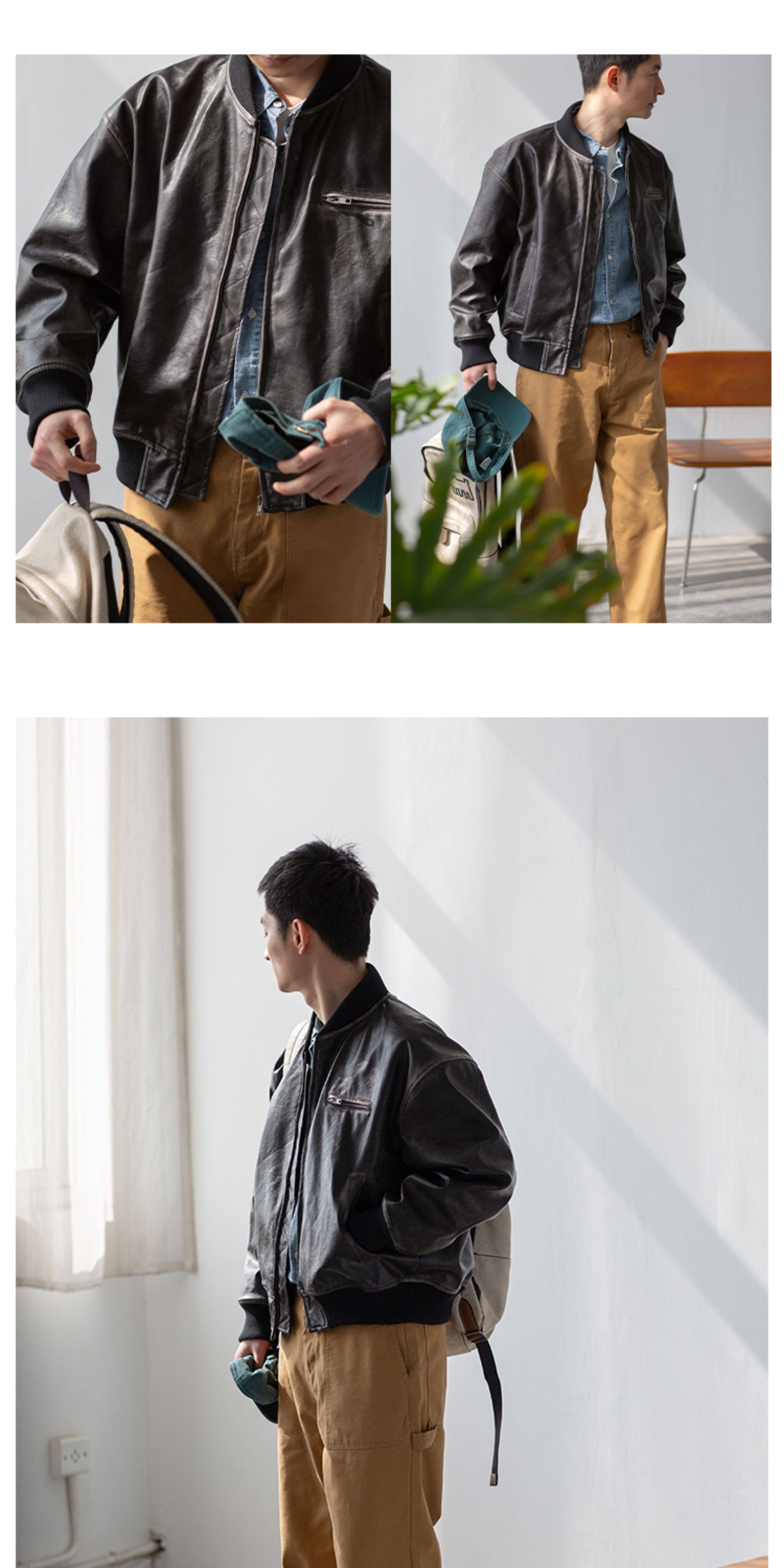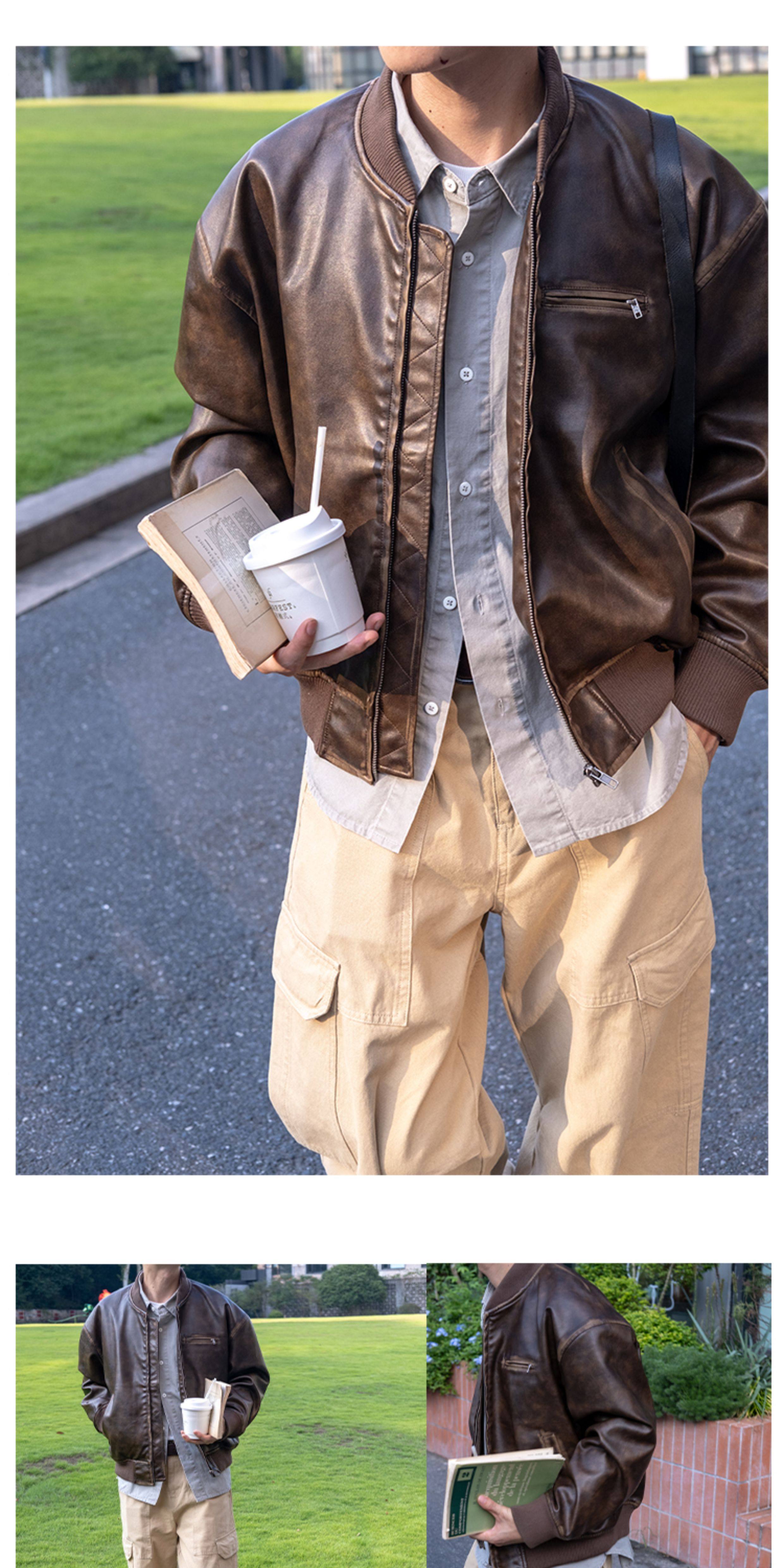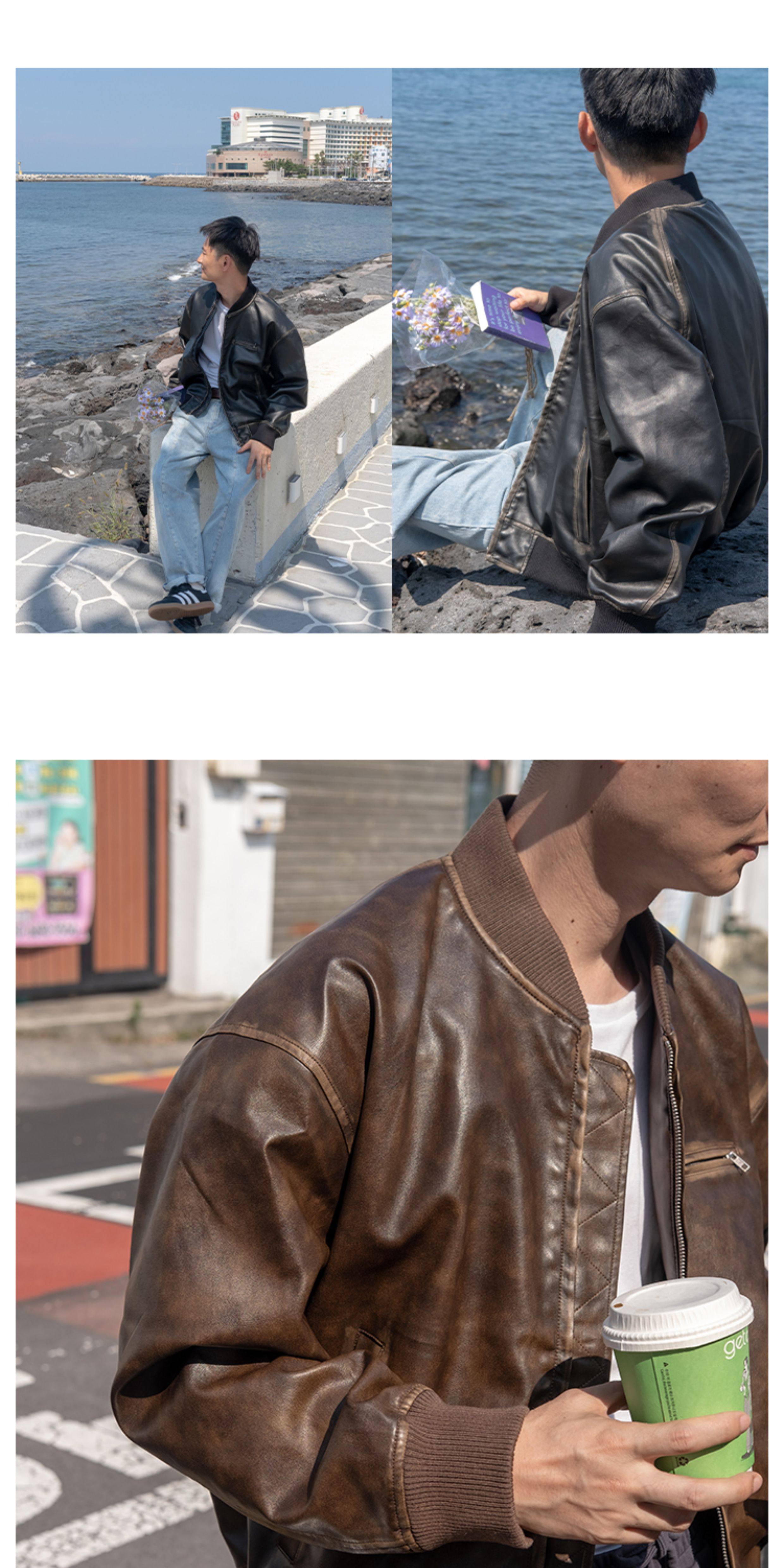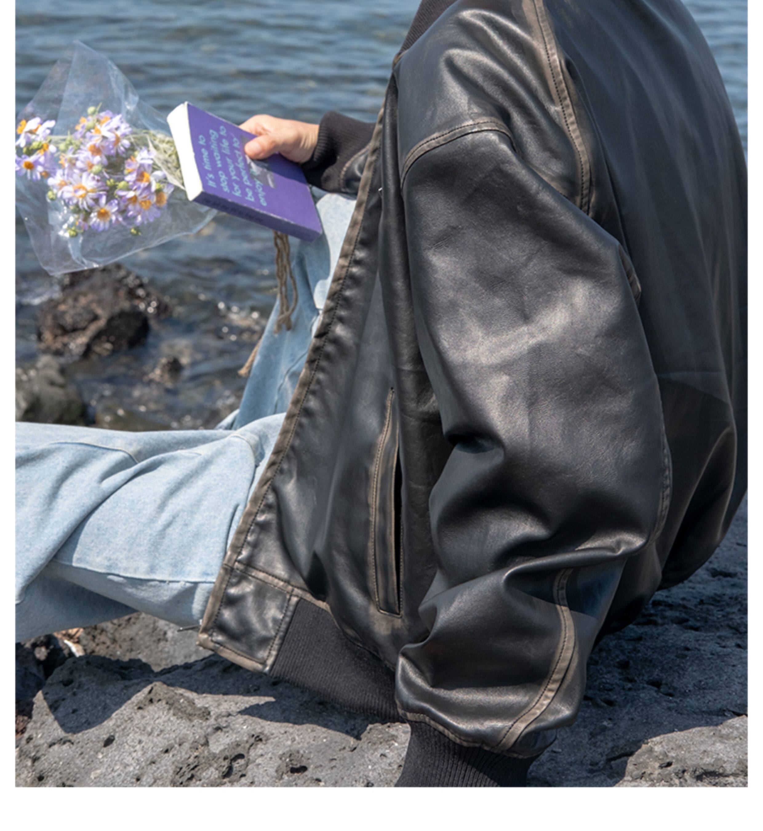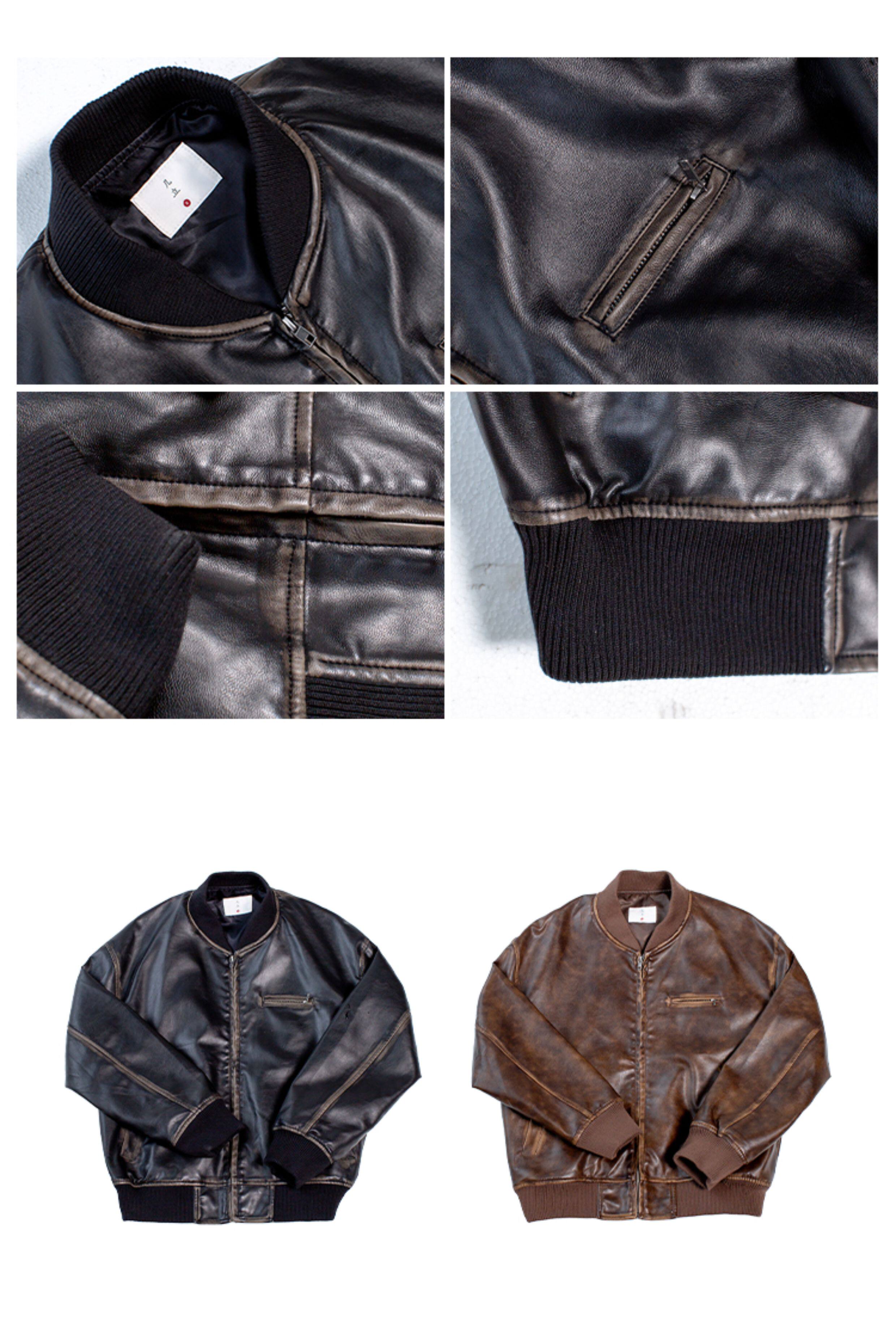 【Use Time to Feel】Jili Two-Tone Color-Washed Vintage Baseball Collar Pu Leather Jacket