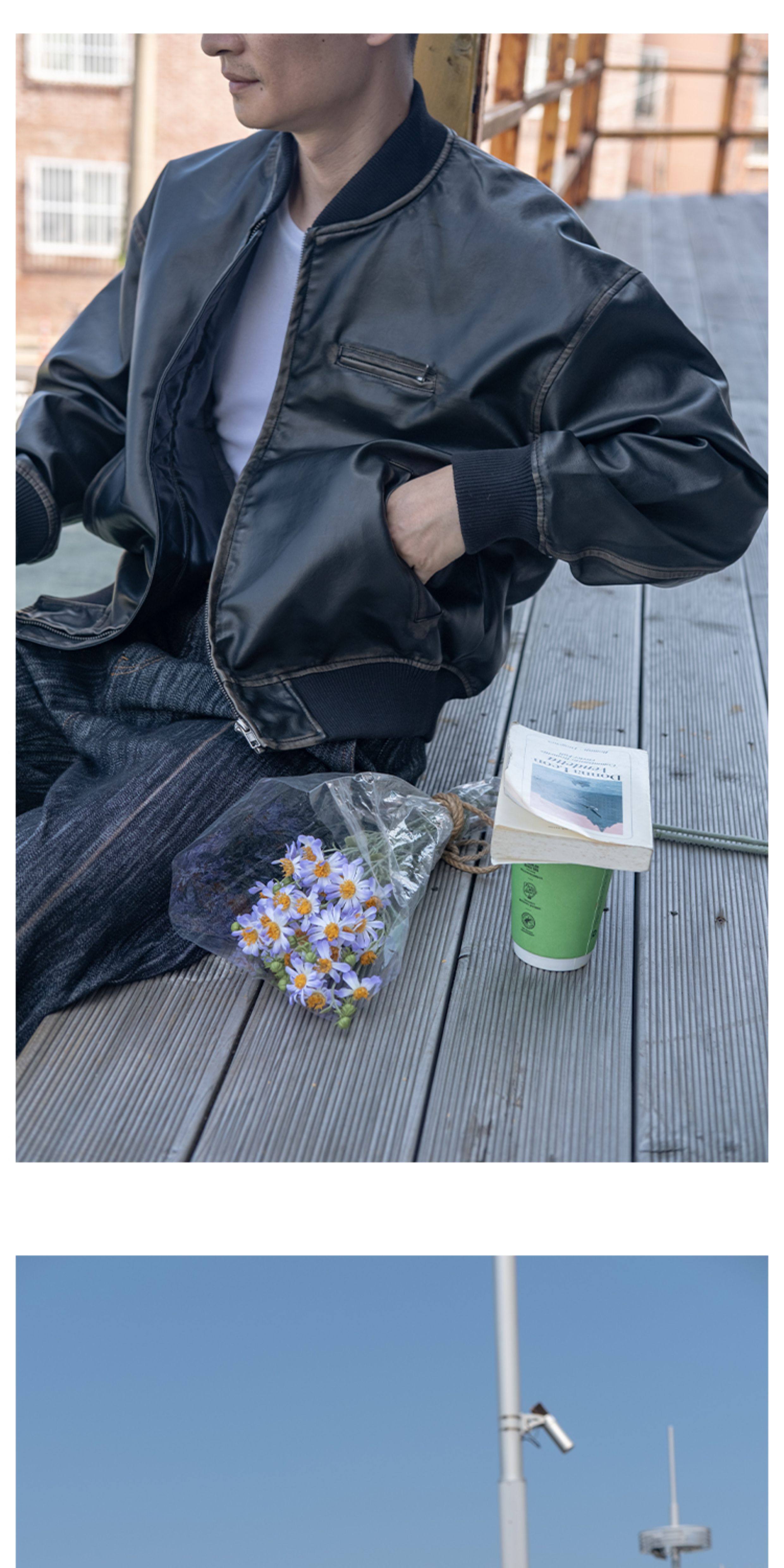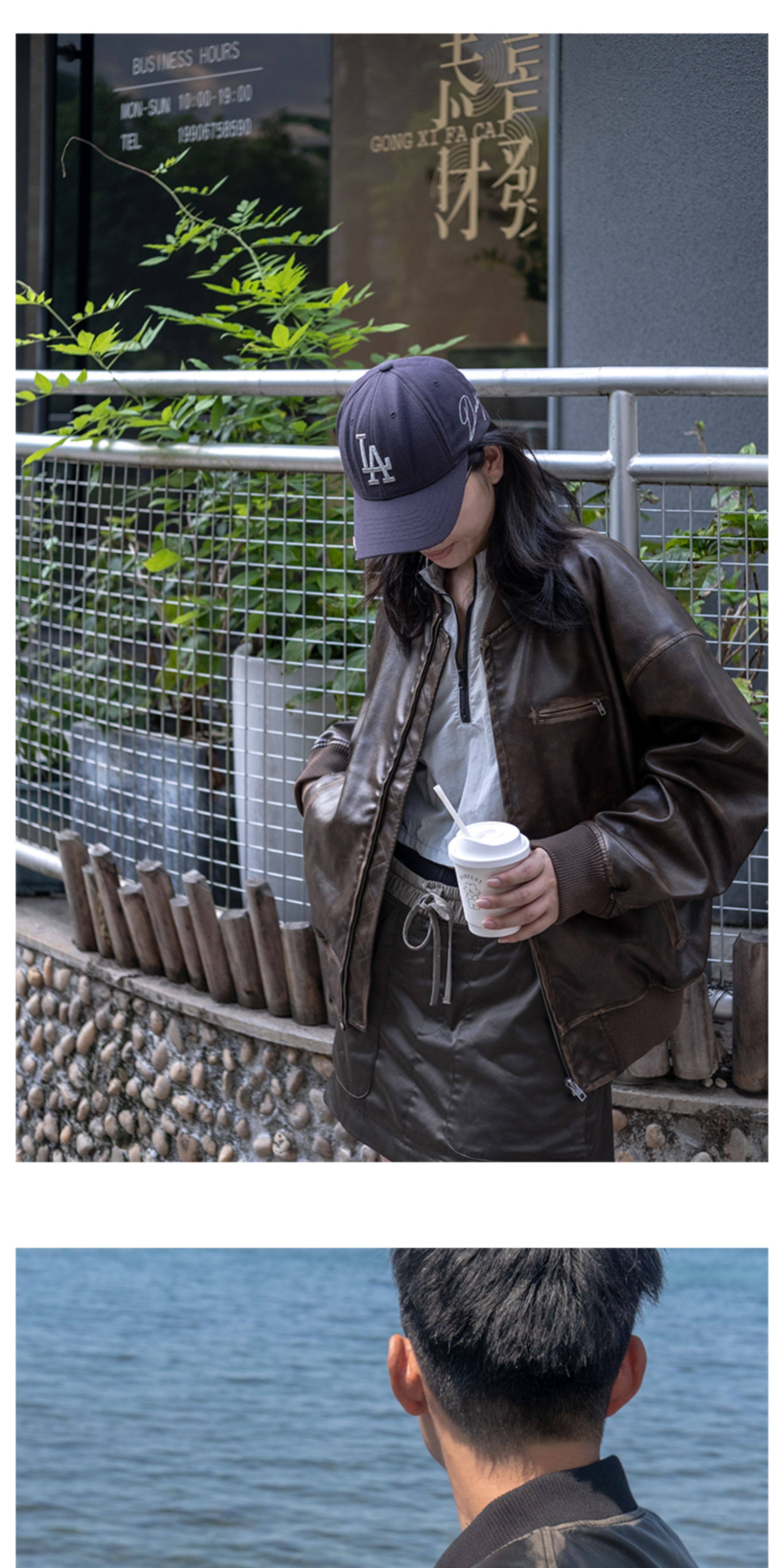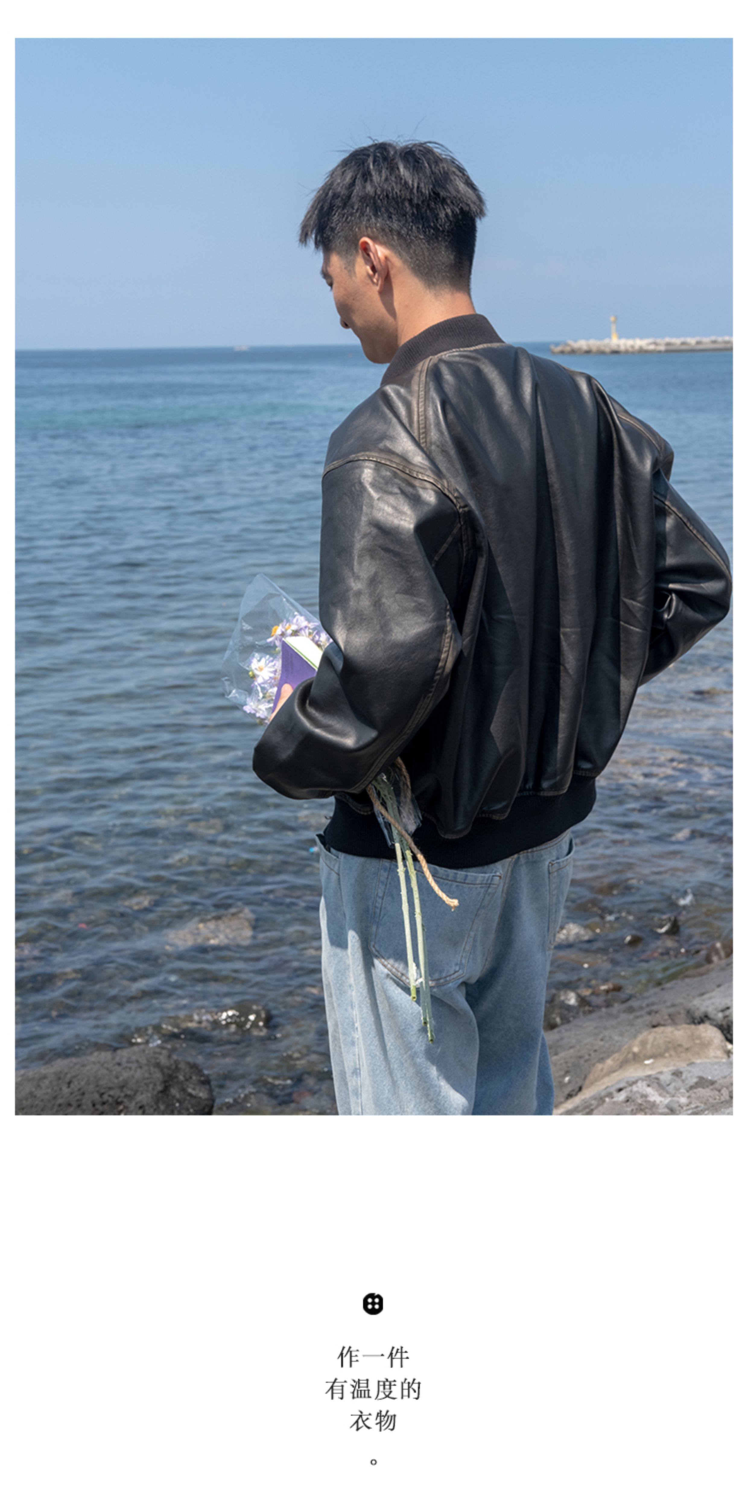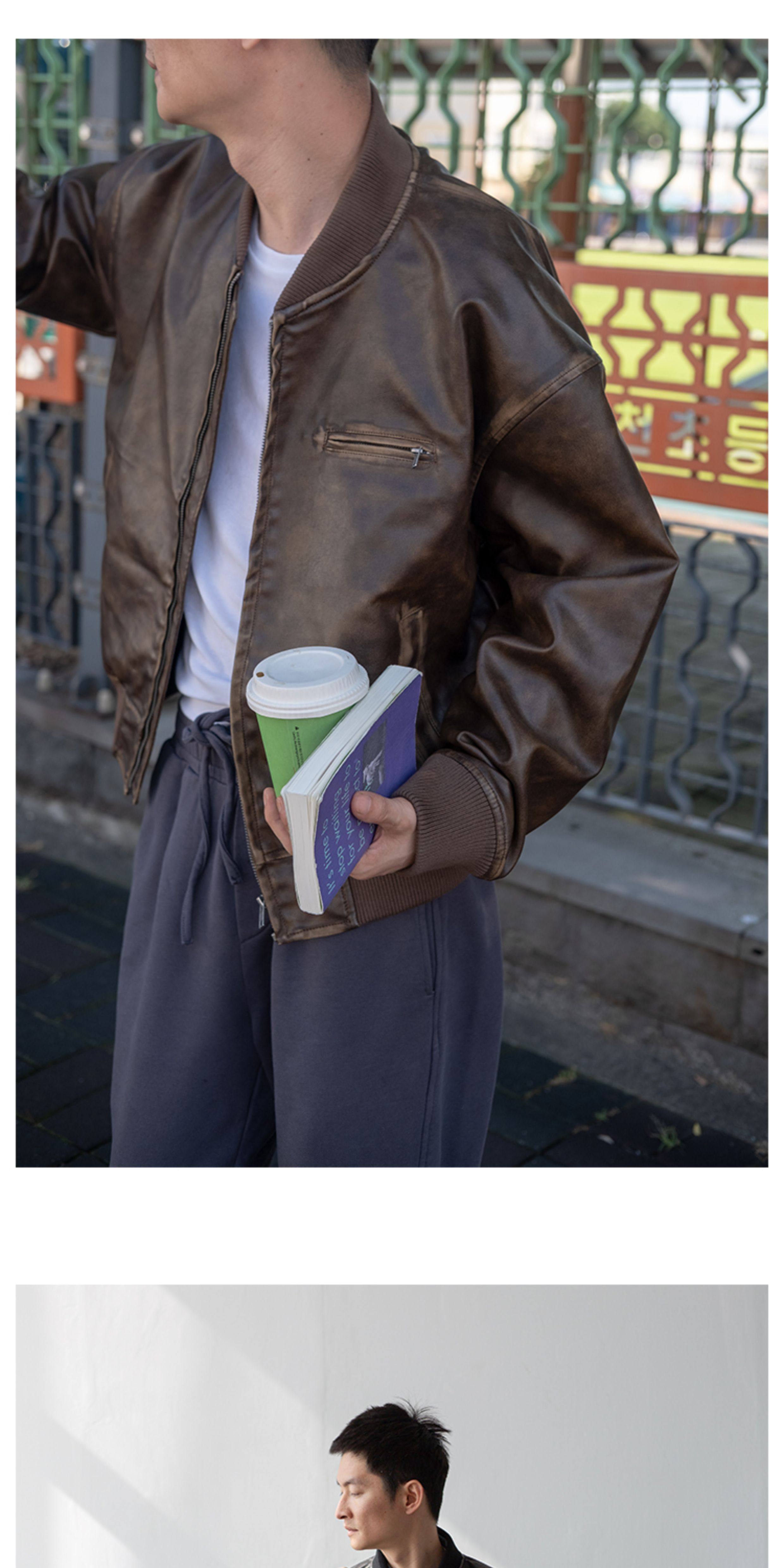 【Use Time to Feel】Jili Two-Tone Color-Washed Vintage Baseball Collar Pu Leather Jacket