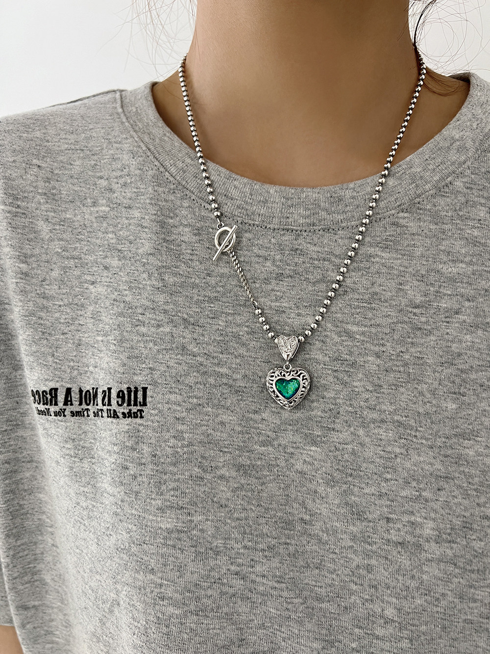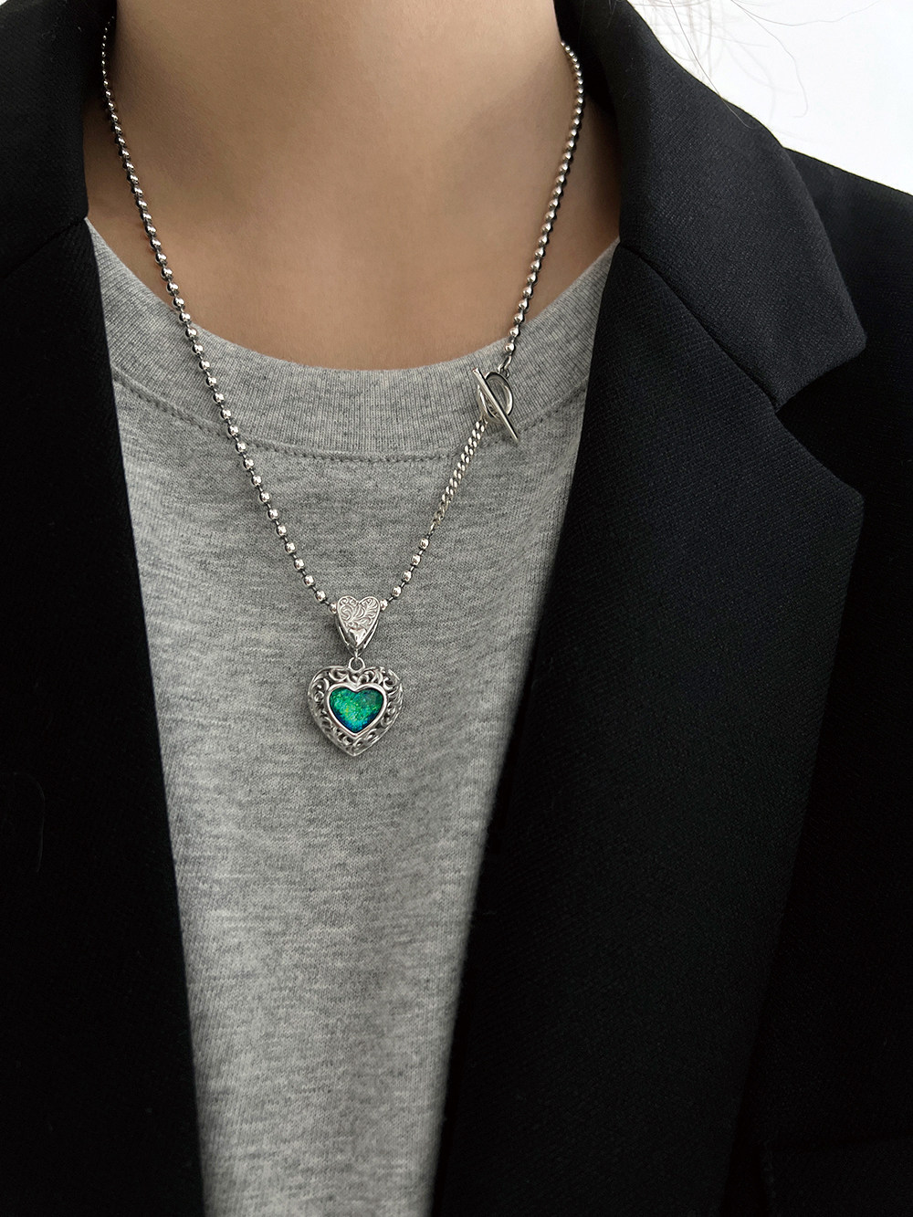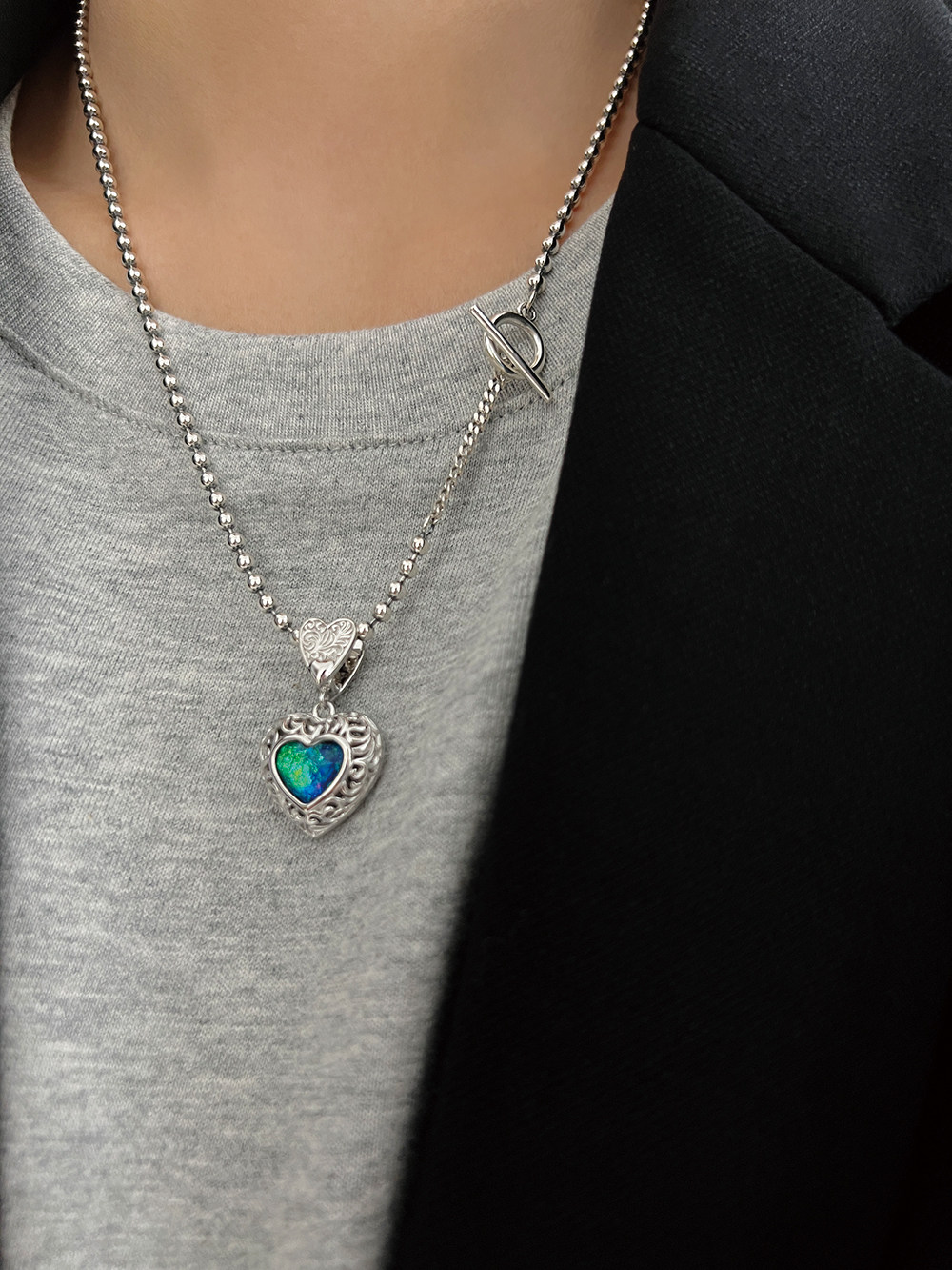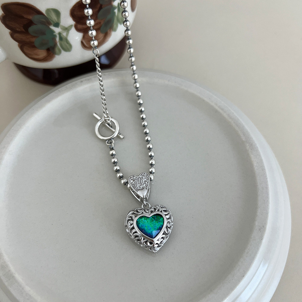 925 Sterling Silver Vintage Artificial Opal Heart Pendant Necklace Sweater Chain Bead Chain Women's Niche Design Fashion