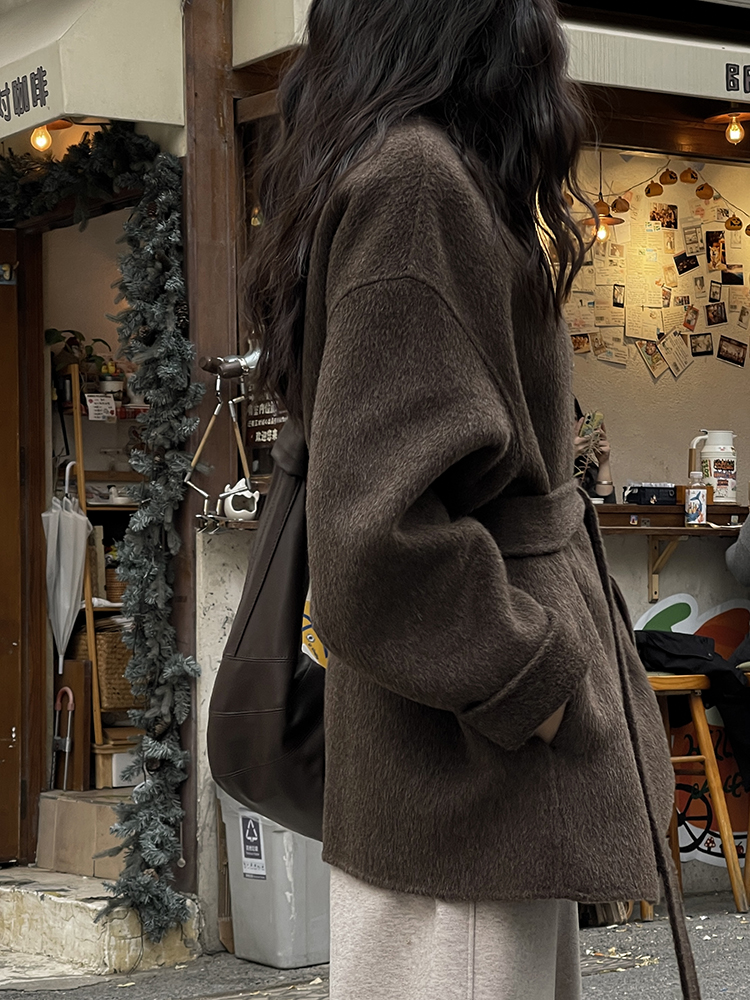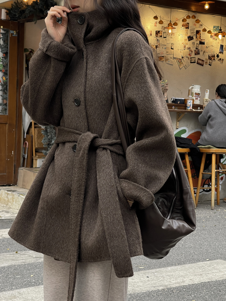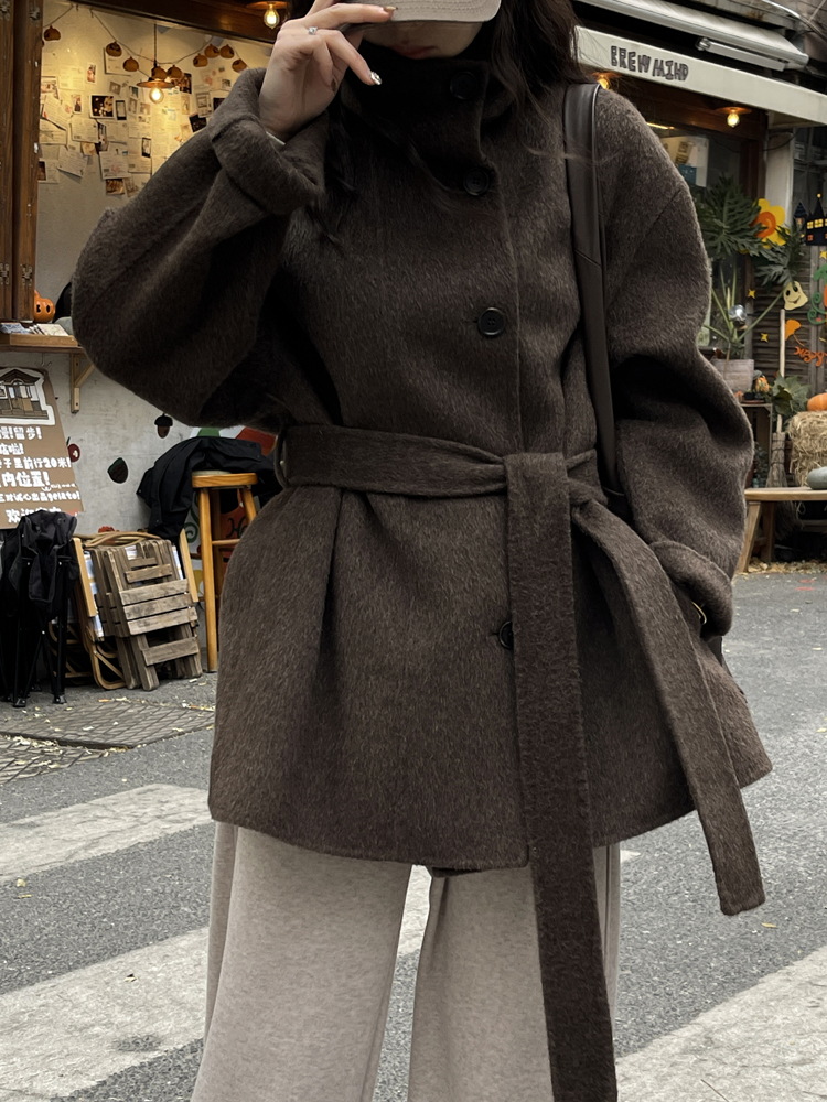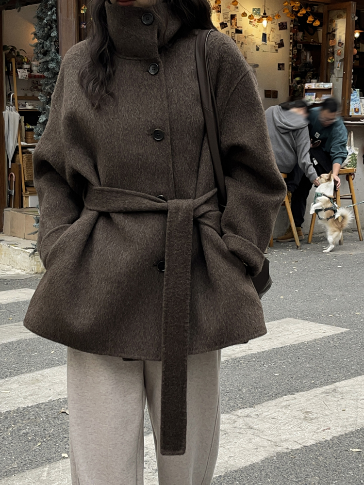 【London Morning Mist】2025 Autumn/Winter Stand Collar Hand-Stitched Double-Sided Wool Coat Korean Style Slimming Woolen Jacket for Women