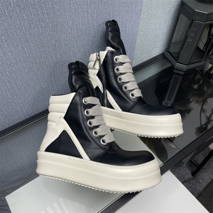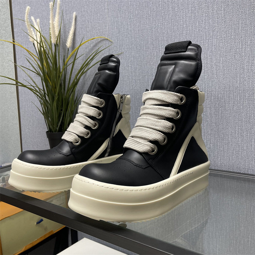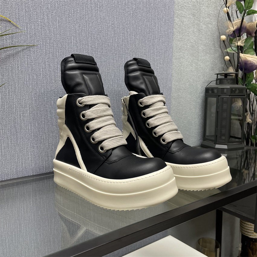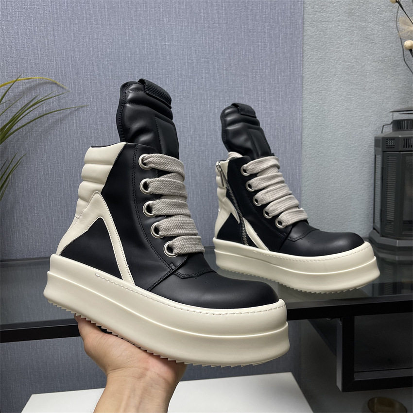 Ro Thick-Soled High-Top Shoes for Men and Women, Couple Shoes, Inverted Triangle Black and White Milk-Colored Sole, First Layer Cowhide Ro Boots Romikon