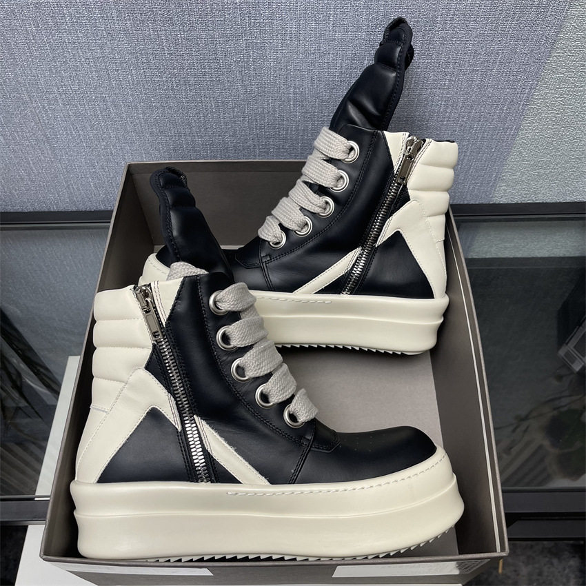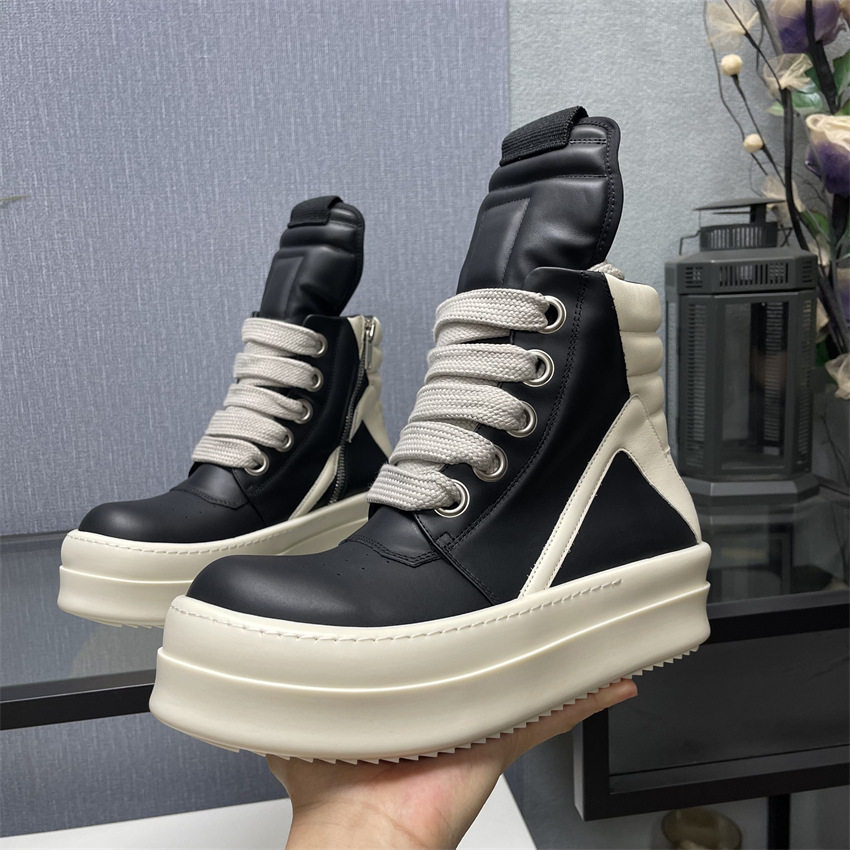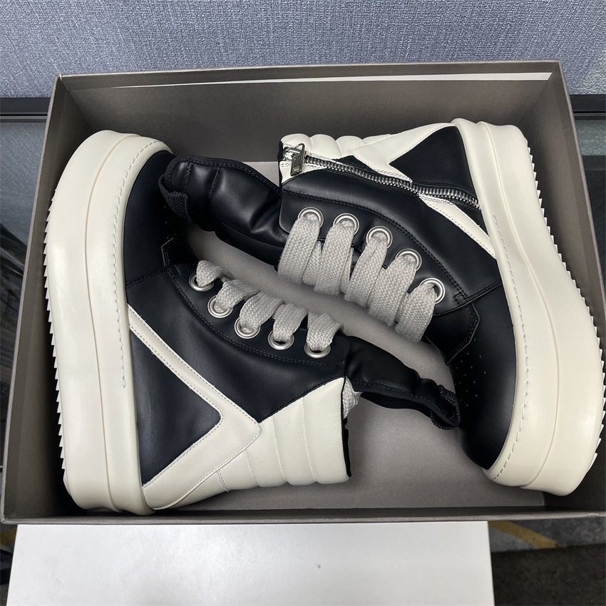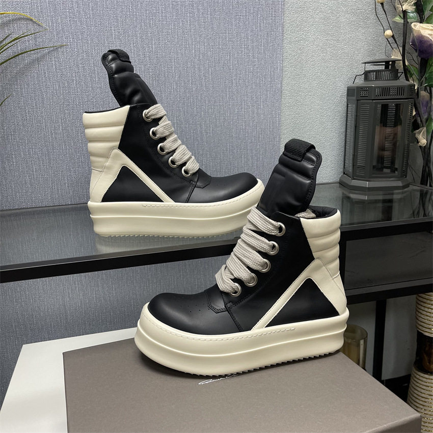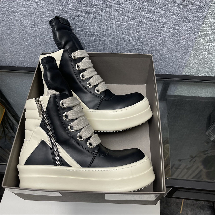 Ro Thick-Soled High-Top Shoes for Men and Women, Couple Shoes, Inverted Triangle Black and White Milk-Colored Sole, First Layer Cowhide Ro Boots Romikon