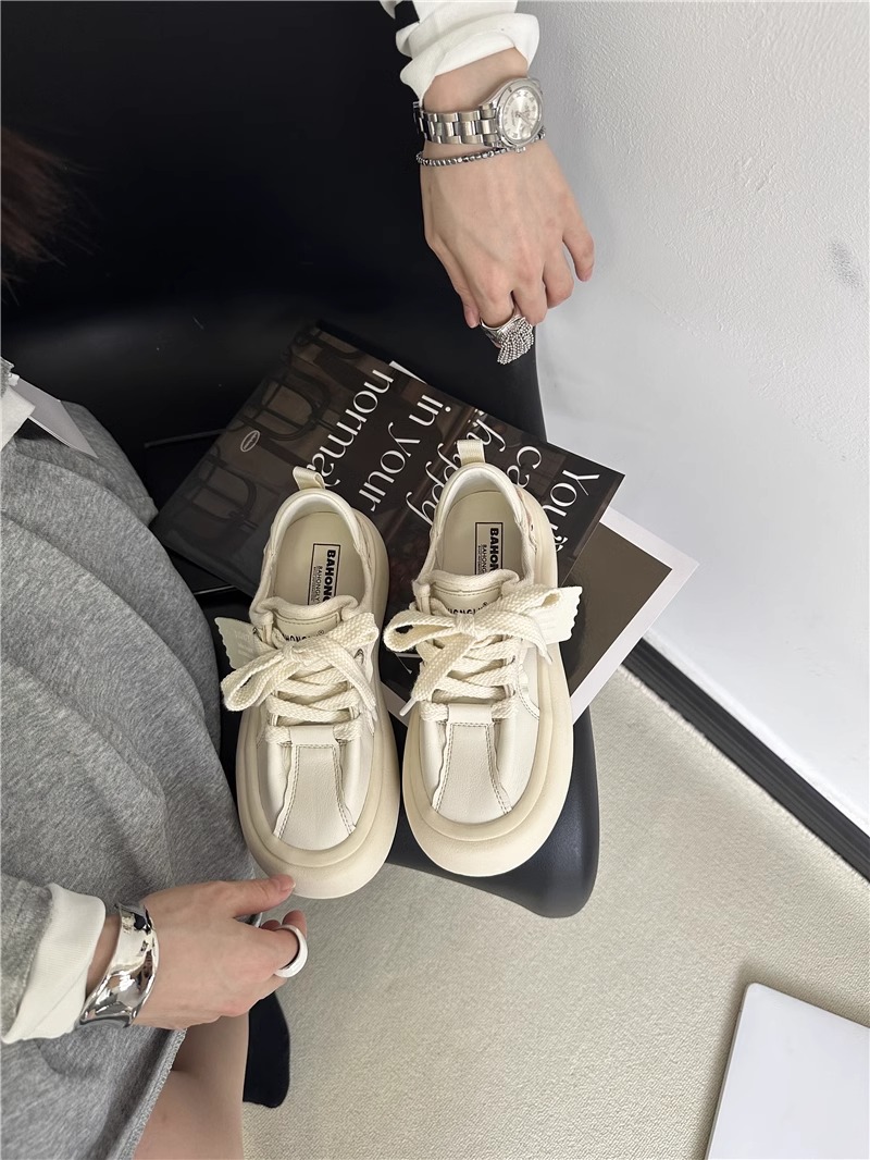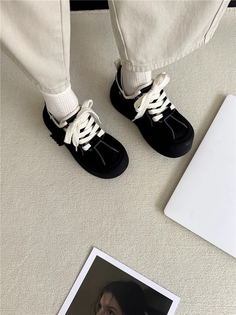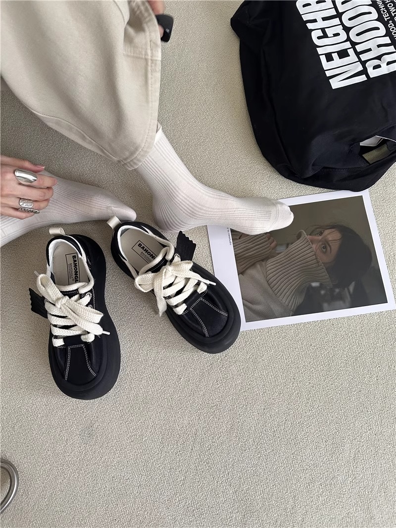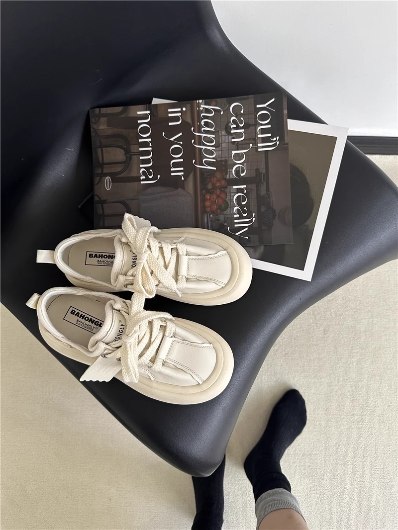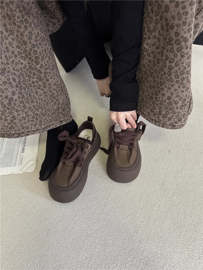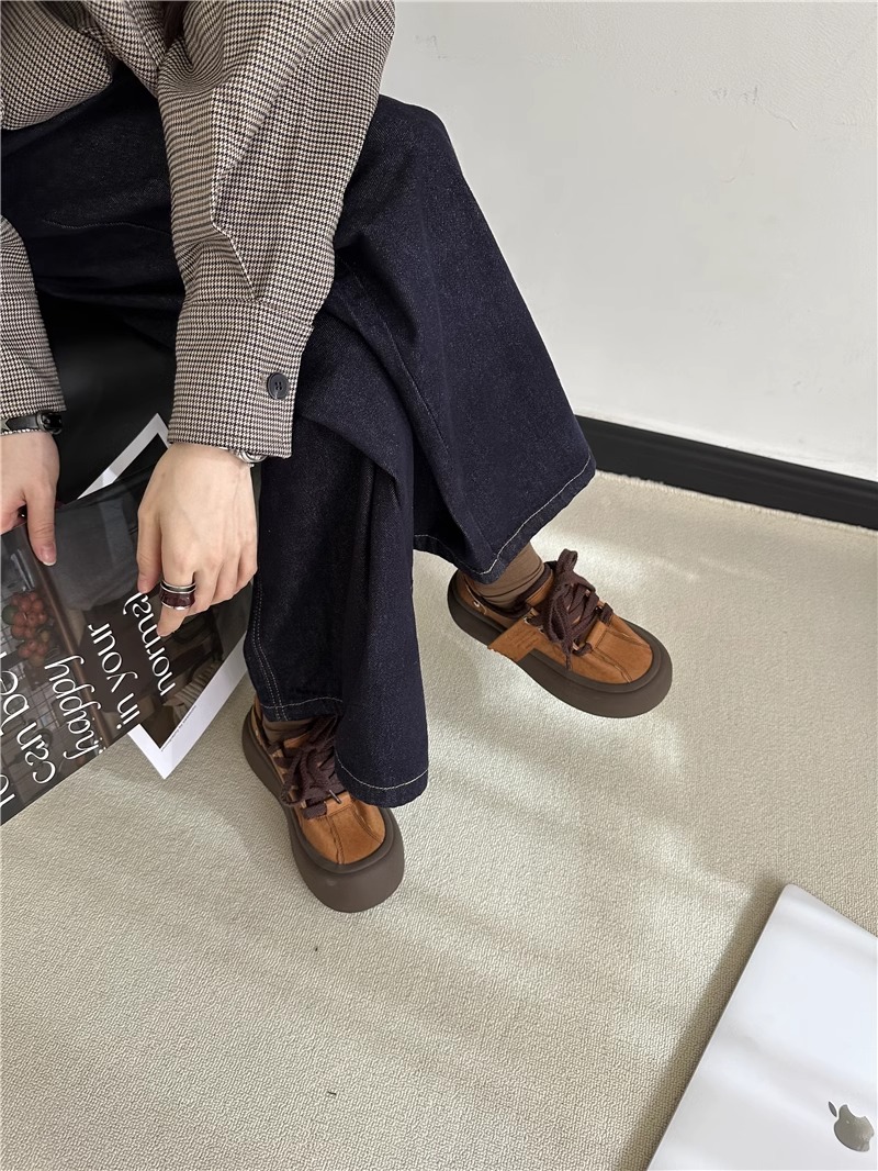 Hong Kong Style Shallow Lace-Up Loafers for Women, 2025 Autumn and Winter New Thick-Soled Genuine Leather Casual Shoes, Versatile Trendy Sneakers
