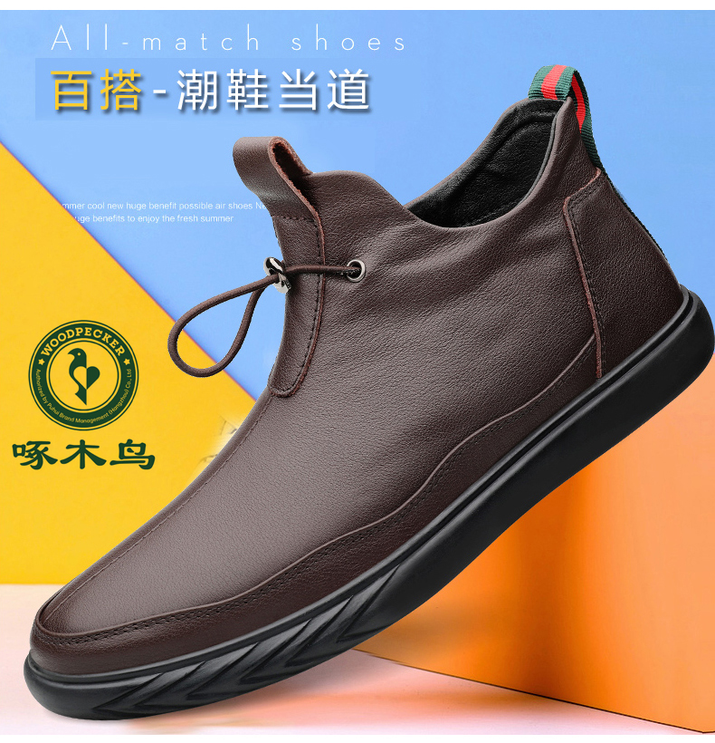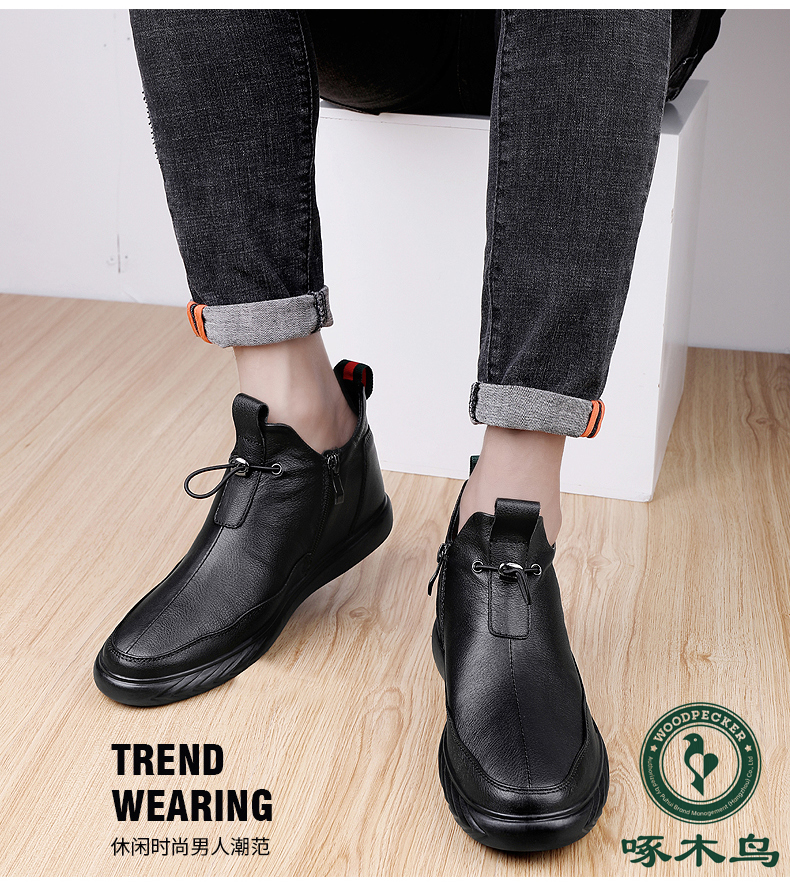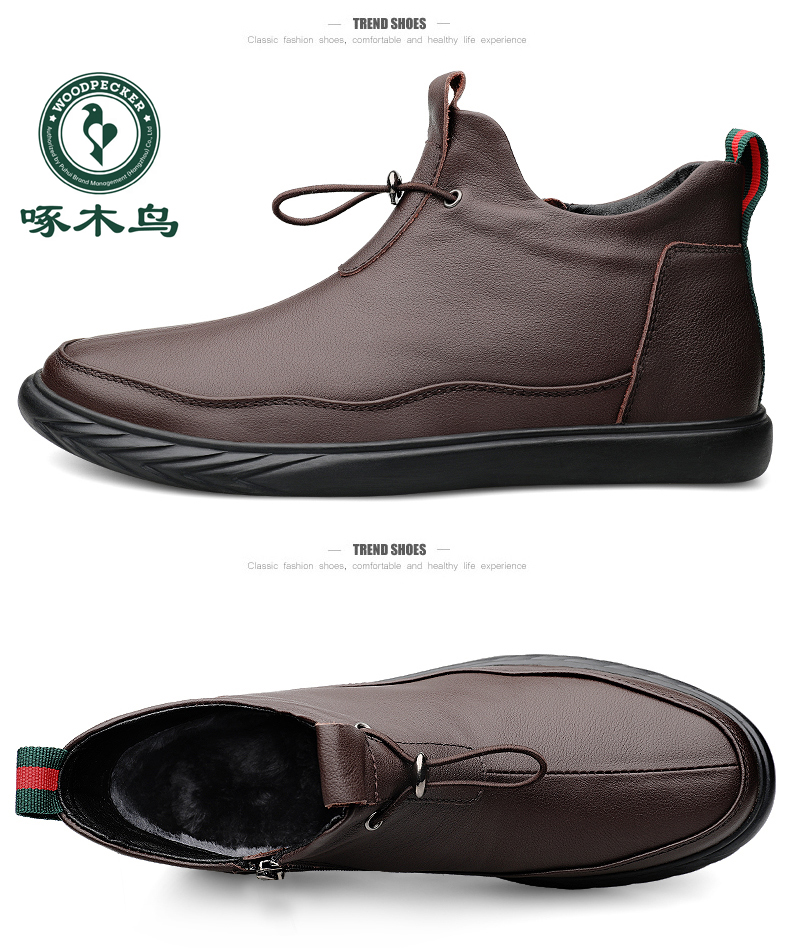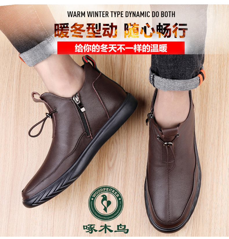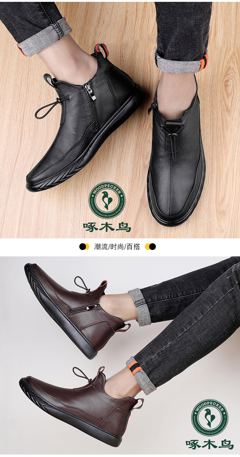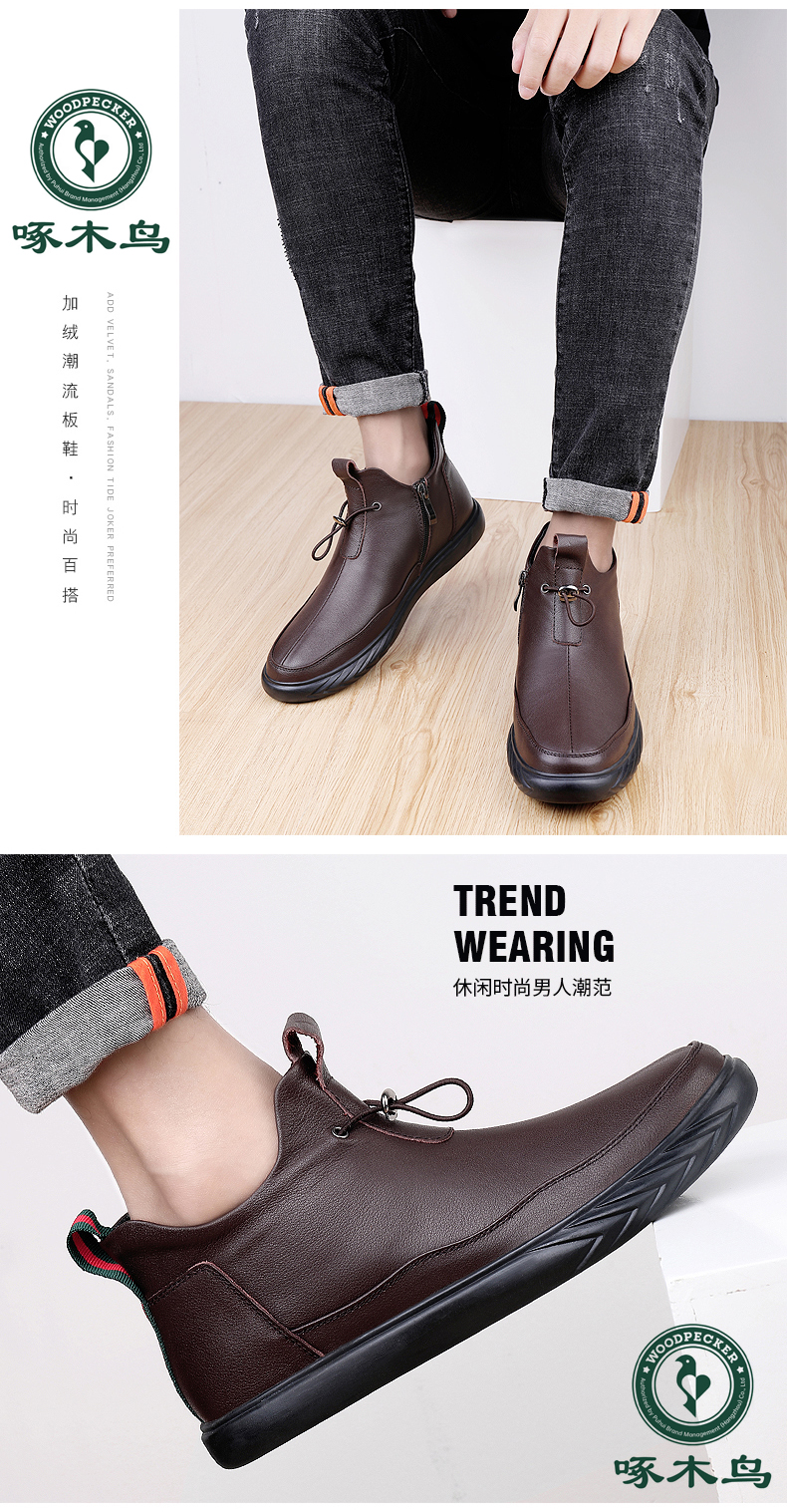 Woodpecker Men's Shoes 2024 Autumn and Winter Genuine Leather Slip-On Casual High-Top Shoes with Fleece Lining for Warmth, Versatile Mid-Top Ankle Boots for Men