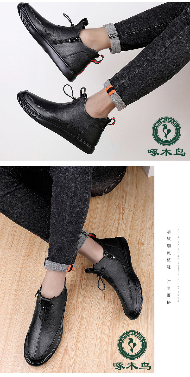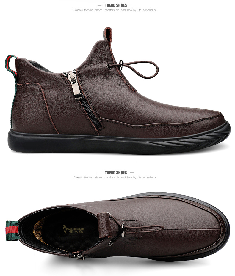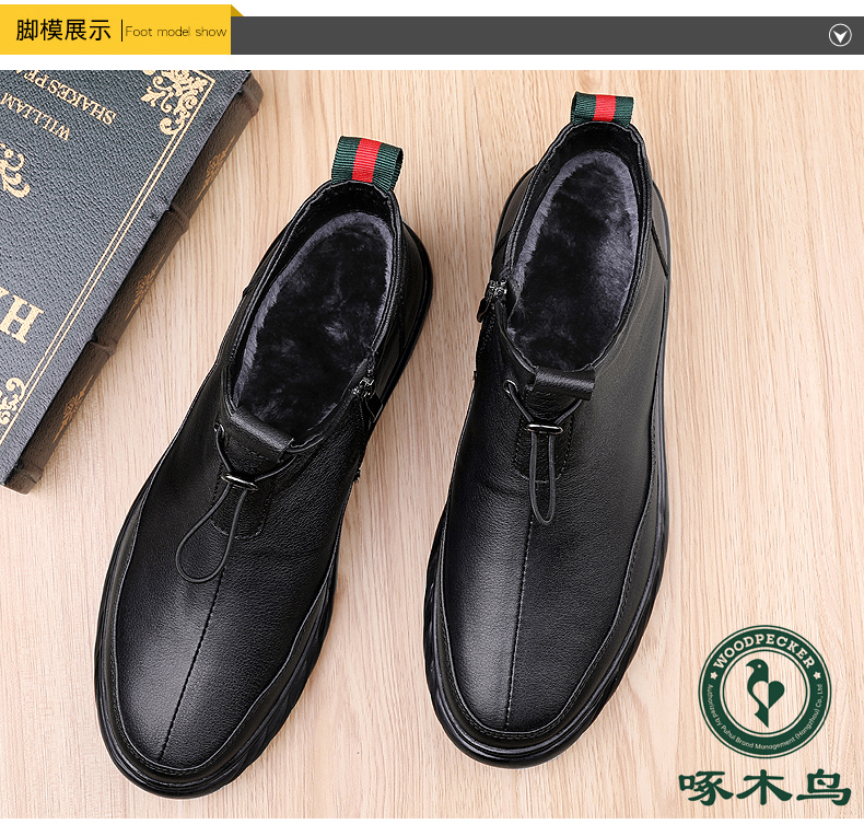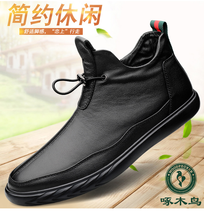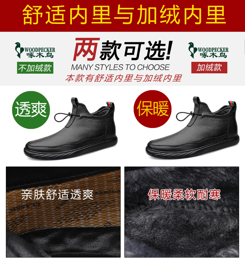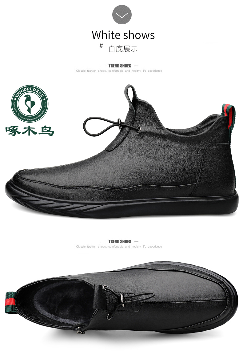 Woodpecker Men's Shoes 2024 Autumn and Winter Genuine Leather Slip-On Casual High-Top Shoes with Fleece Lining for Warmth, Versatile Mid-Top Ankle Boots for Men