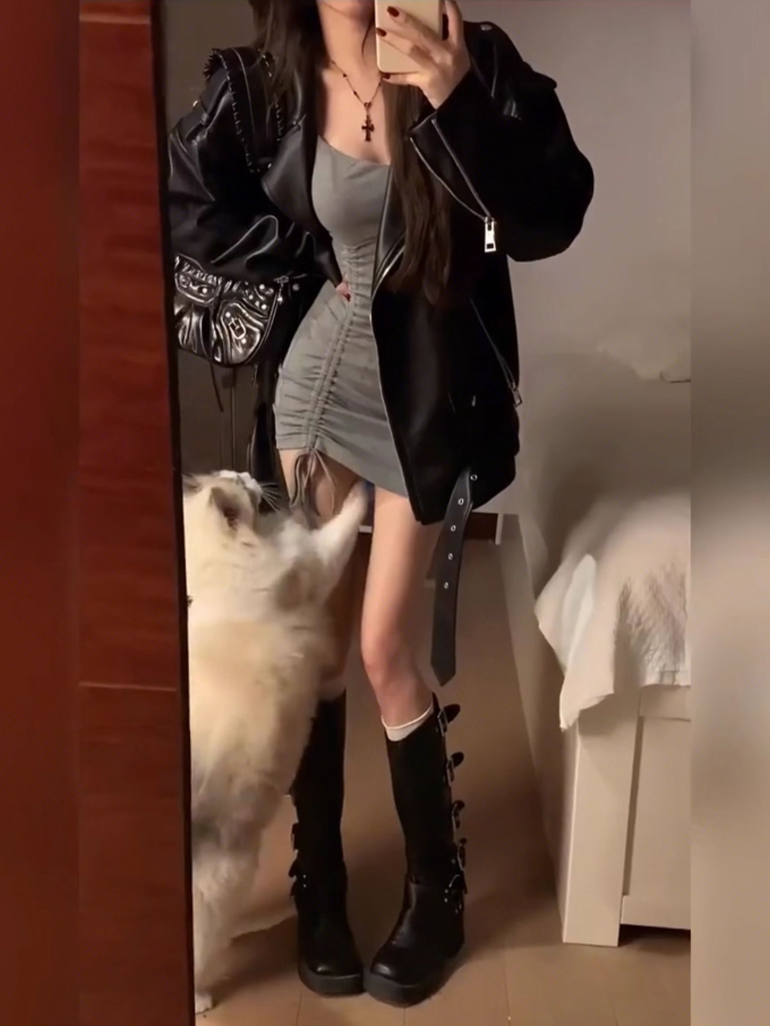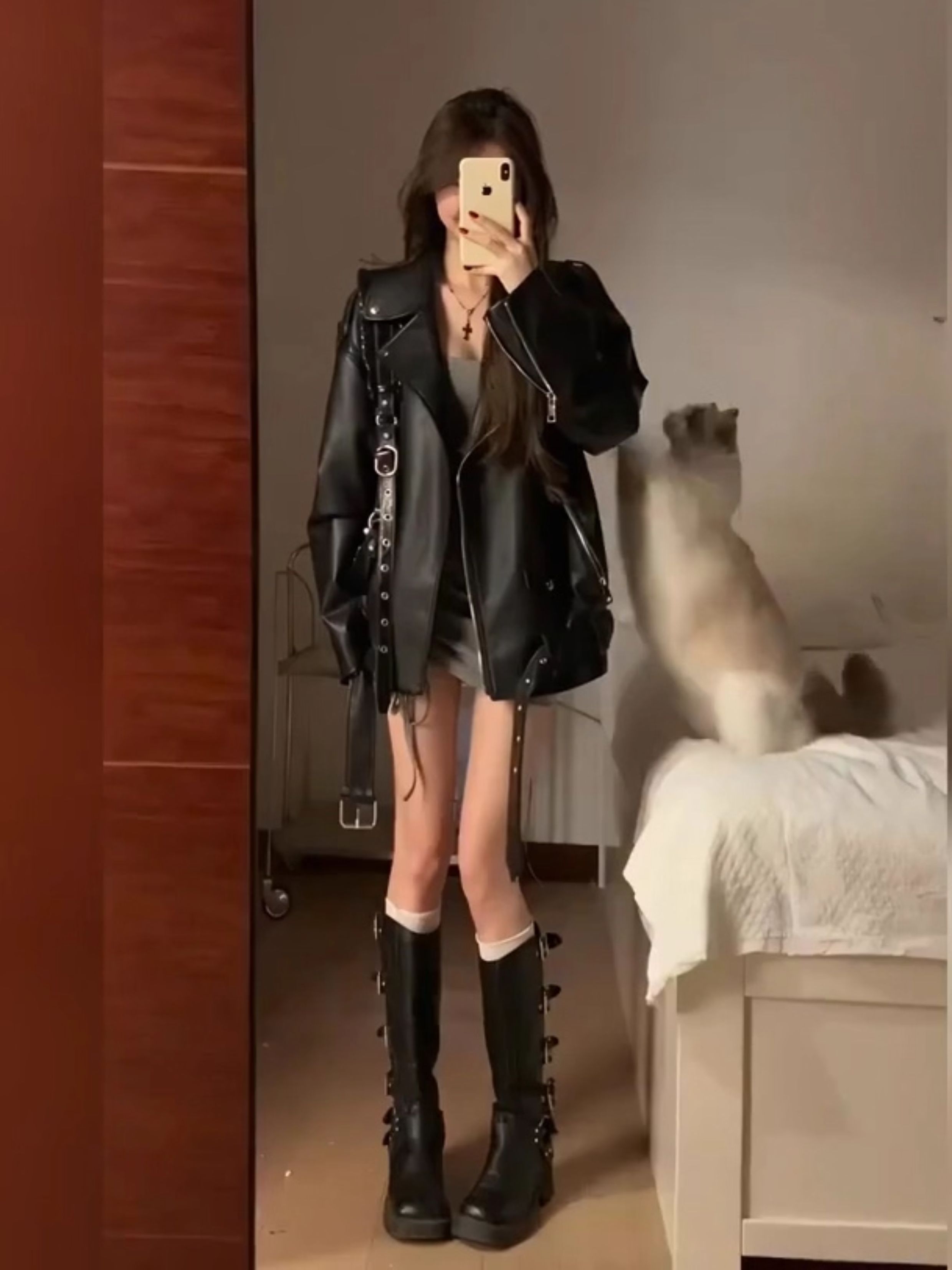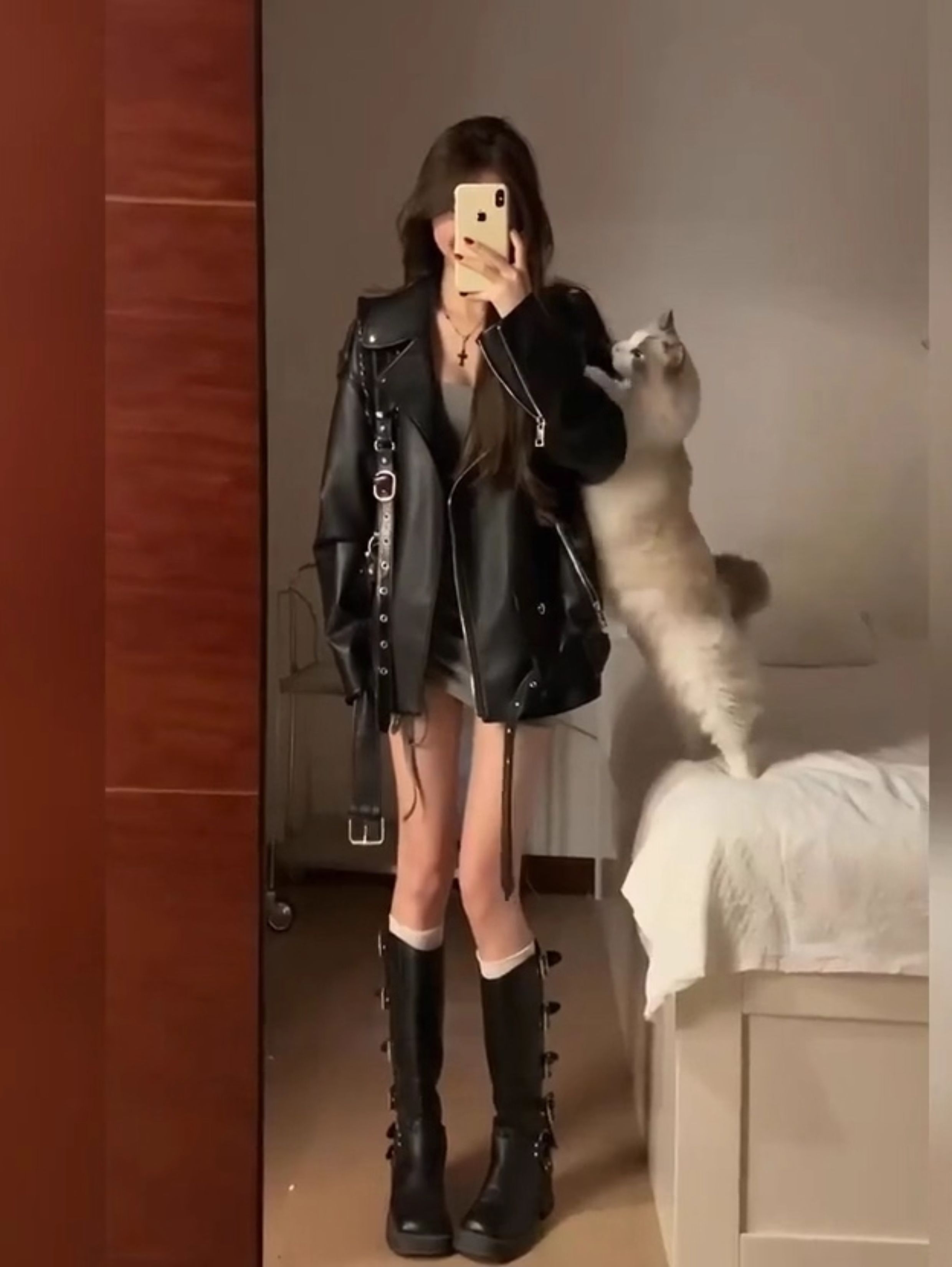 American Cool Style Black Leather Jacket for Women, Autumn Loose Fit, High-End Street Style Biker Jacket, Pu Leather Jacket Top