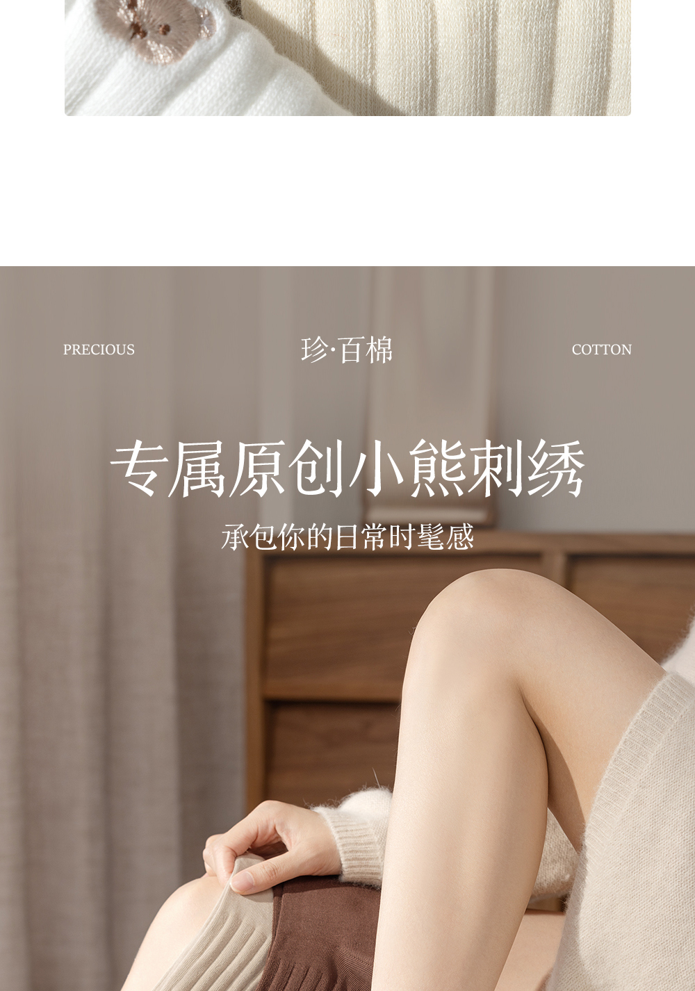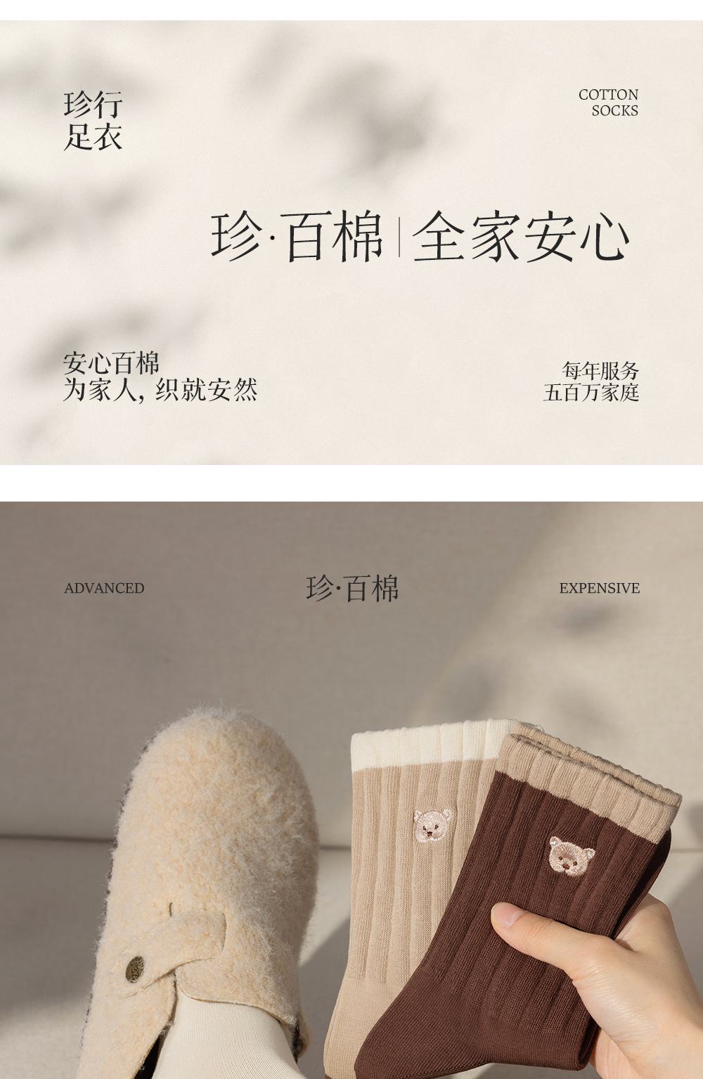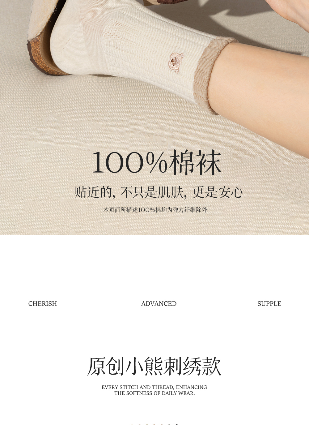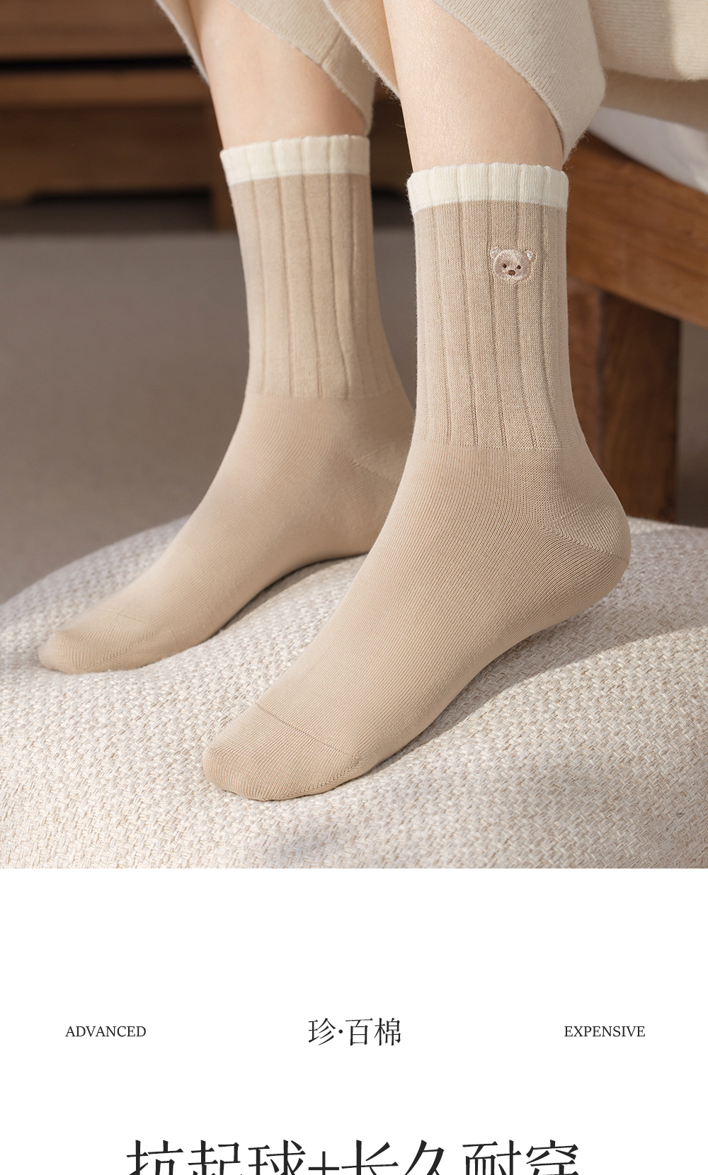 Women's Autumn and Winter Pure Cotton Mid-Calf Socks, Antibacterial, Seamless, Anti-Pilling, Bear Embroidery, Spring and Autumn White Student Long Socks