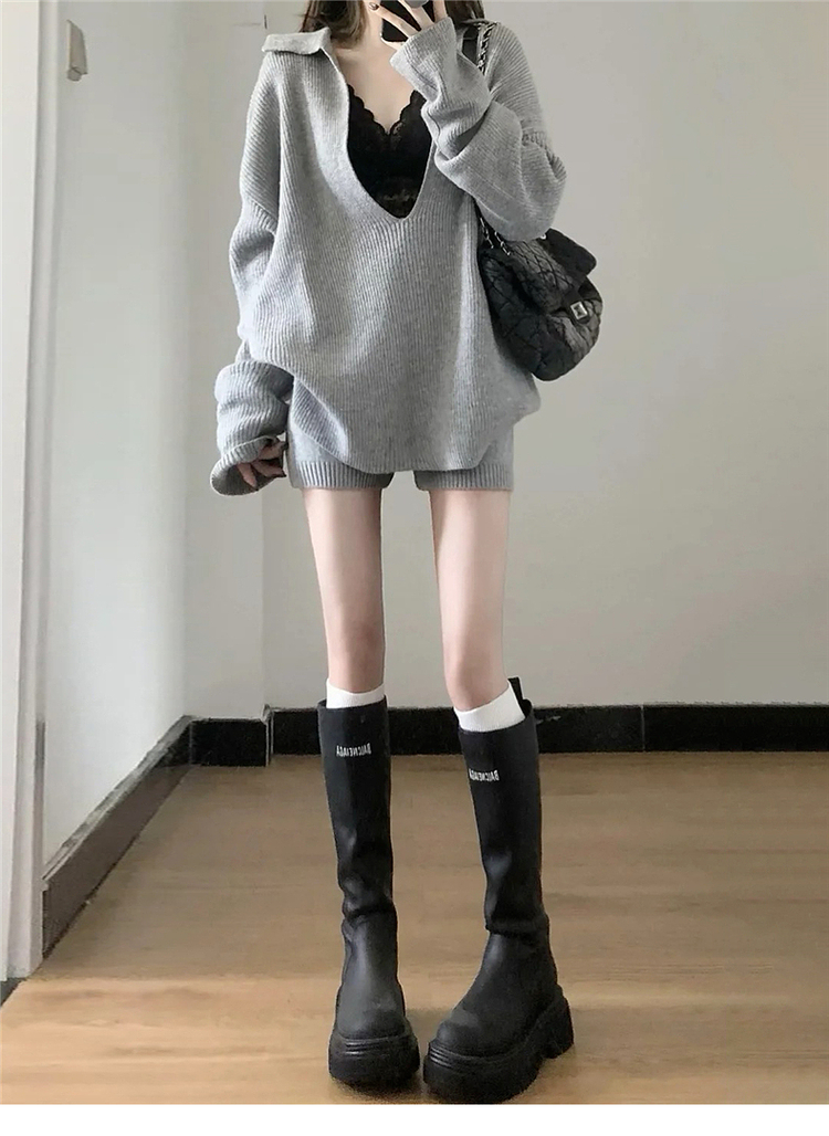Early Autum Gray Knitted Sweater Suit Dress for Women 2025 New Elegant Complete Ootd Outfit