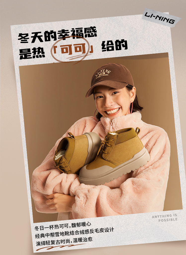 Li Ning Coco Hi丨Casual Shoes Women's Winter Velvet Thick-Soled Snow Boots Non-Slip Mid-Top Sports Shoes