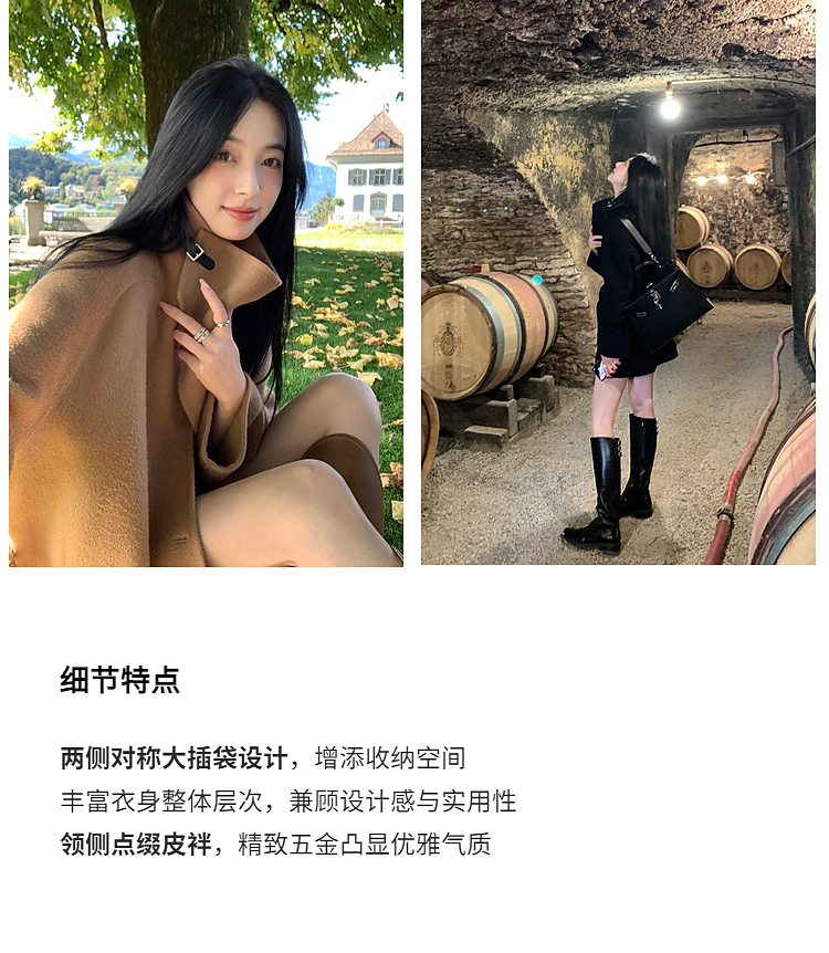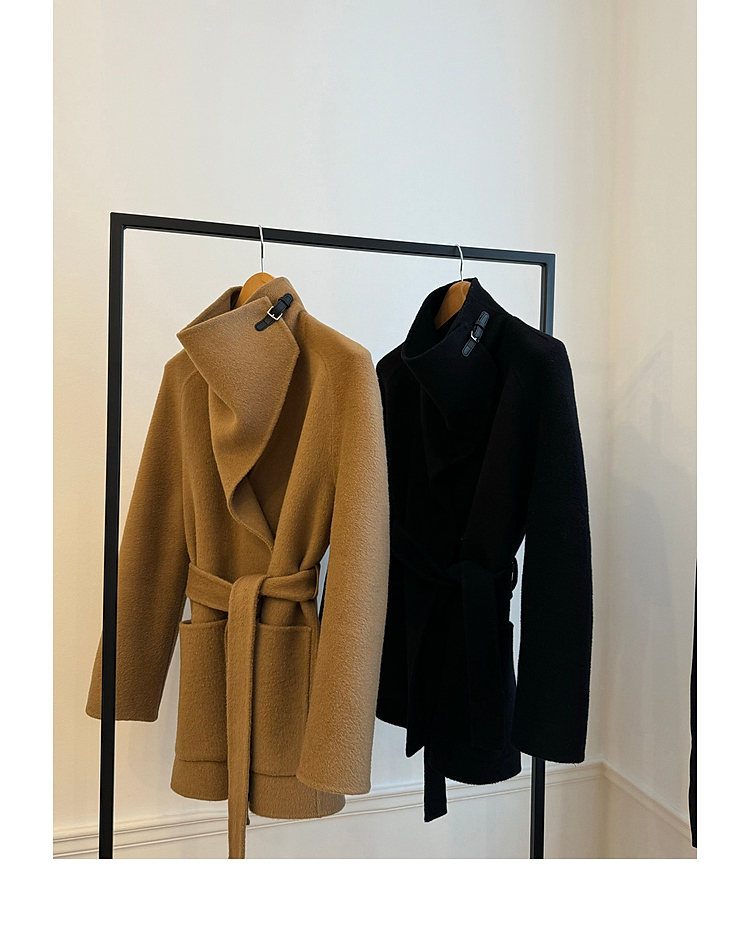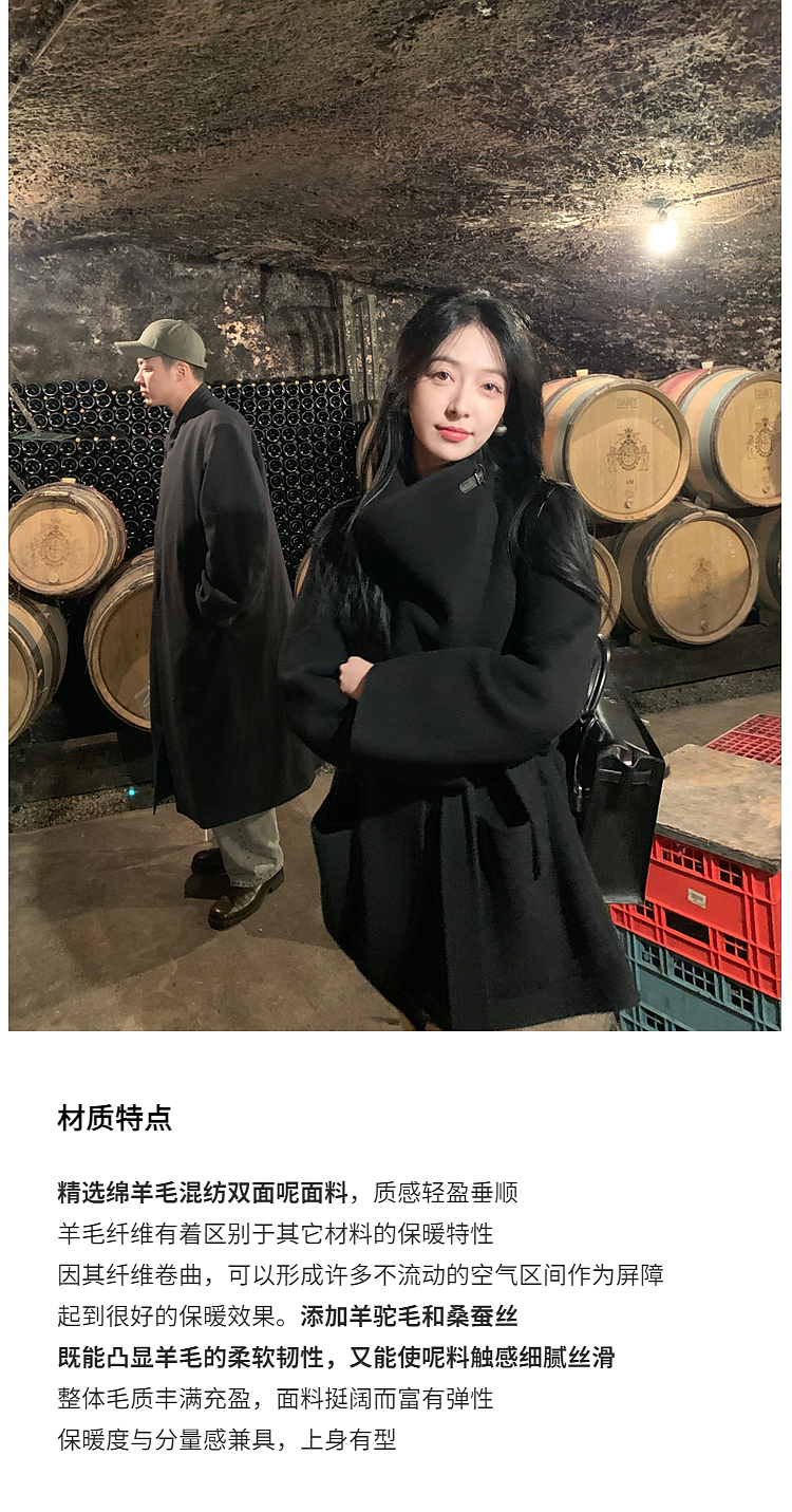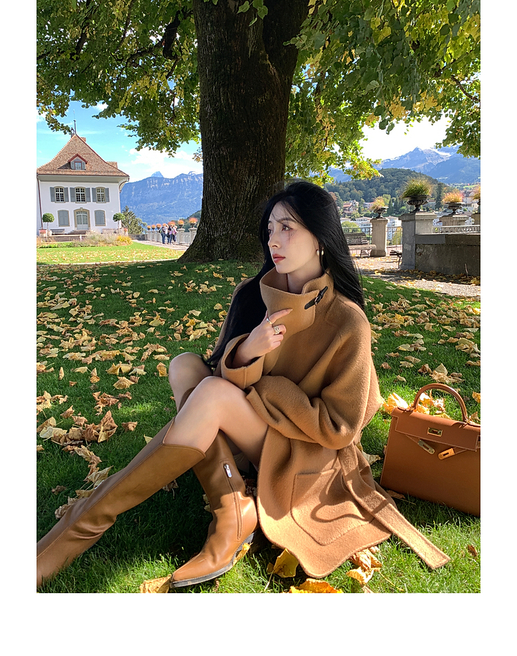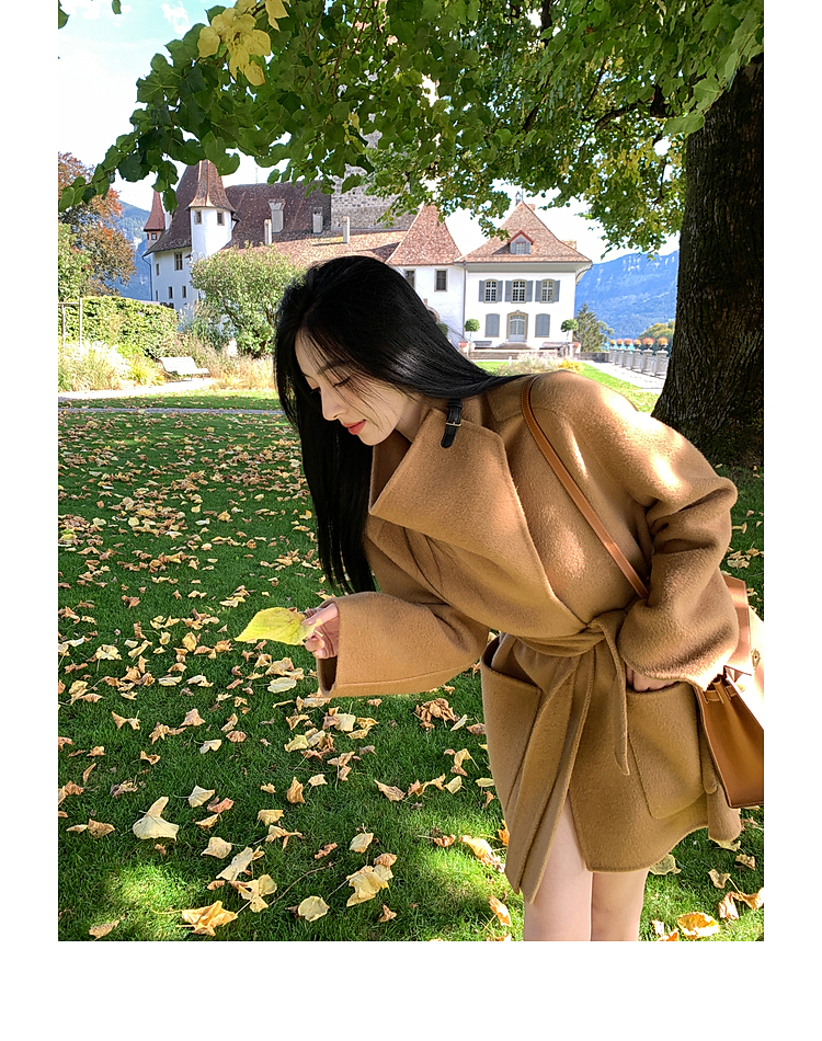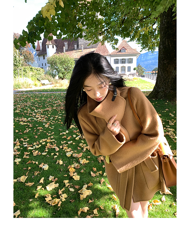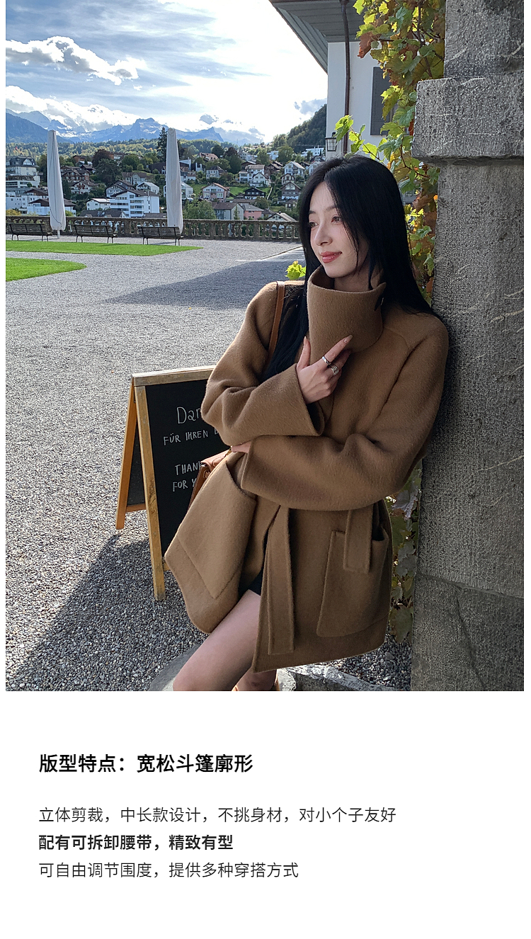 Xia Shiwen Sheep Wool Double-Sided Woolen Cape Outwear Women's Winter Lace-Up Waist Mid-Length Outwear about Poem