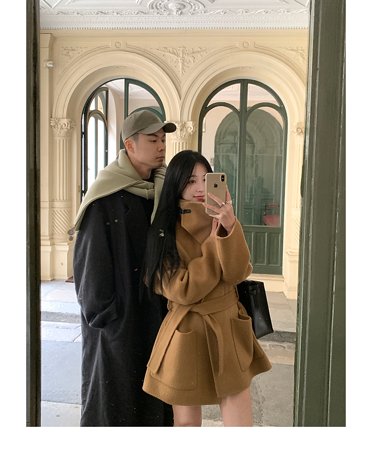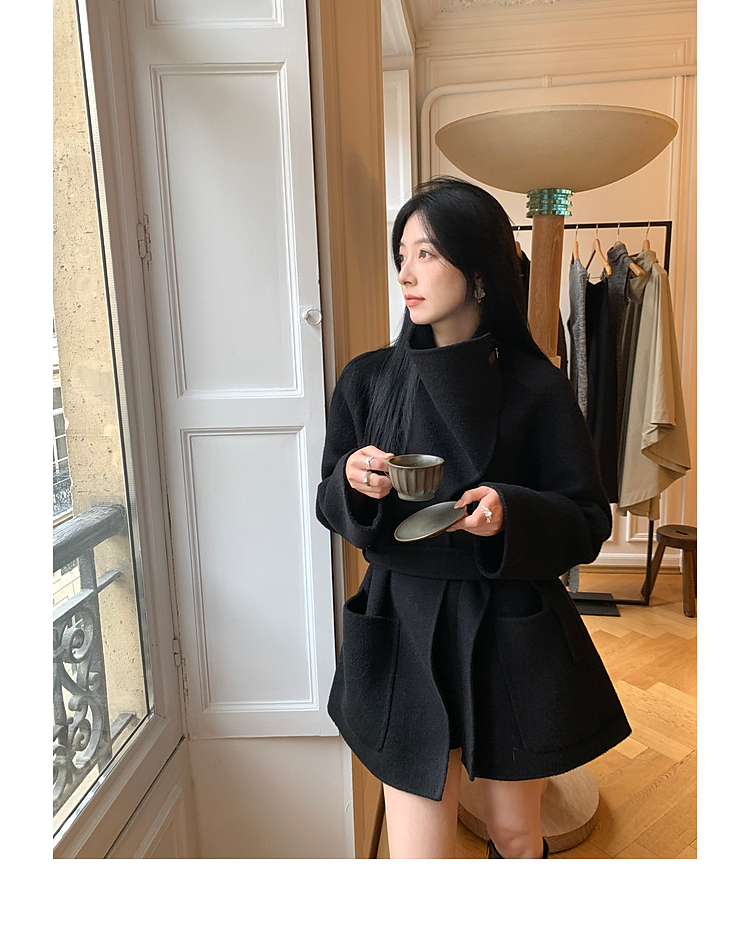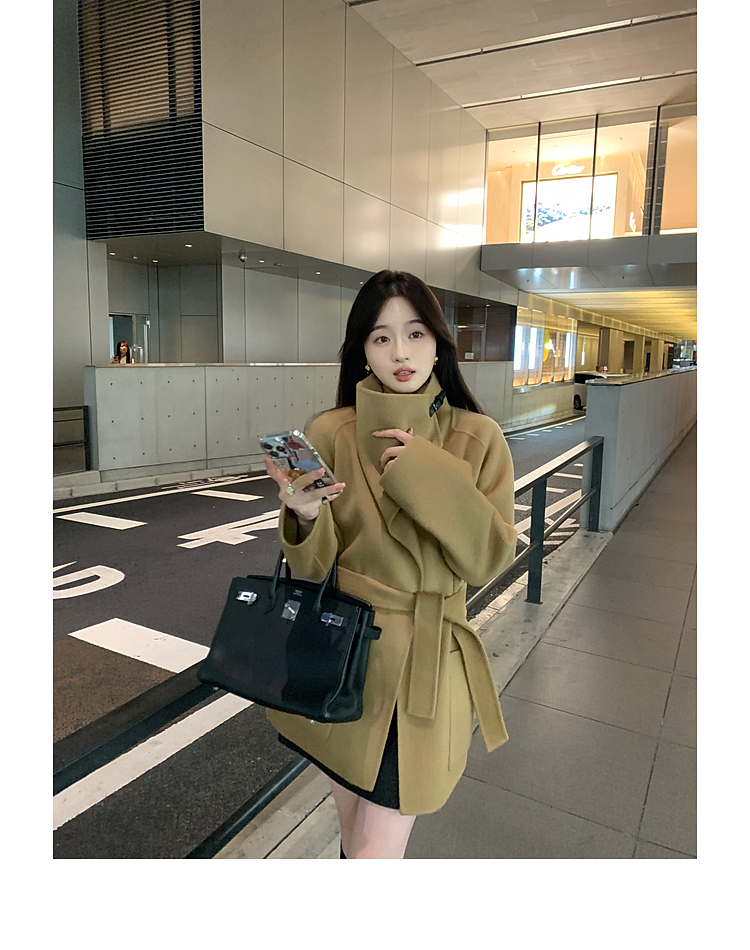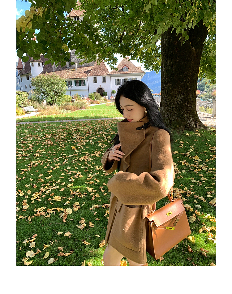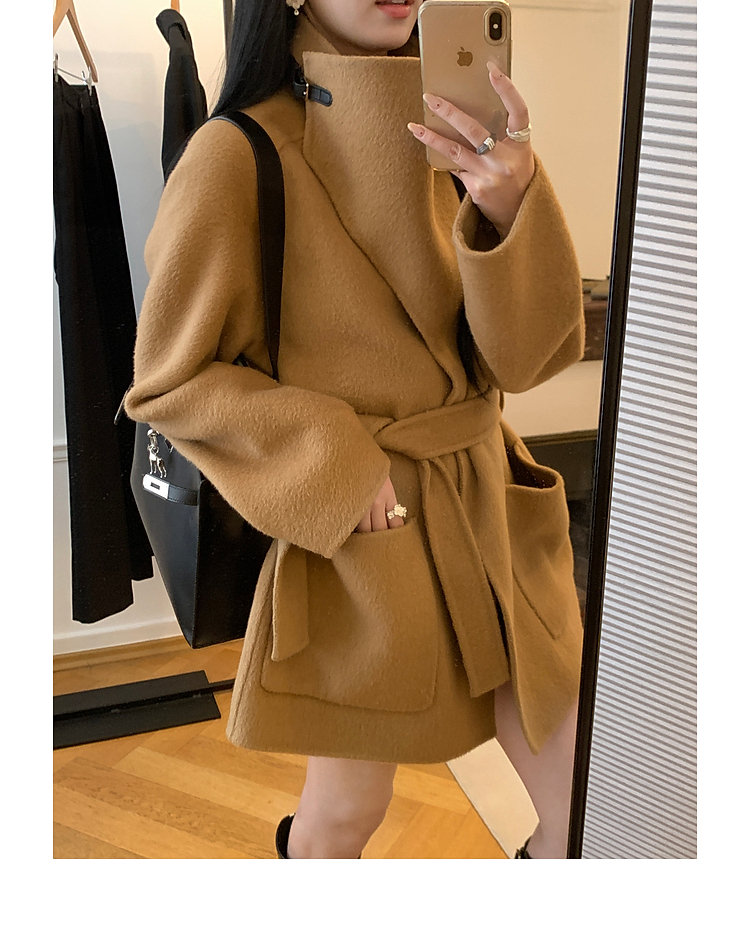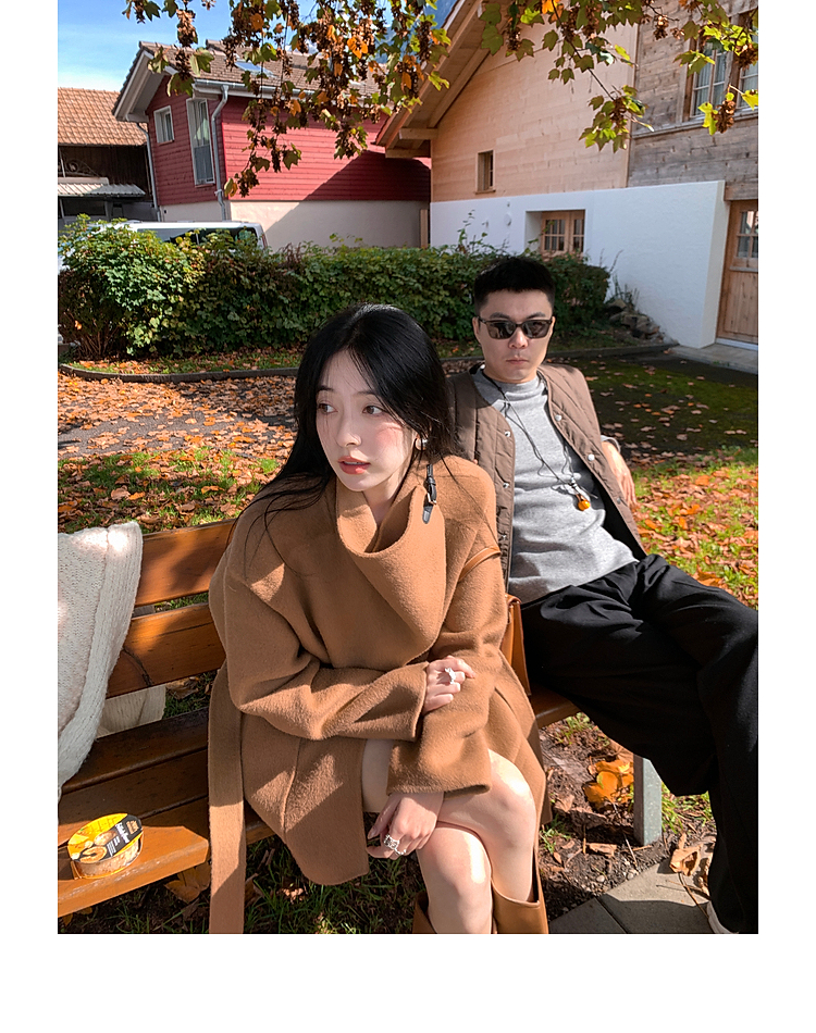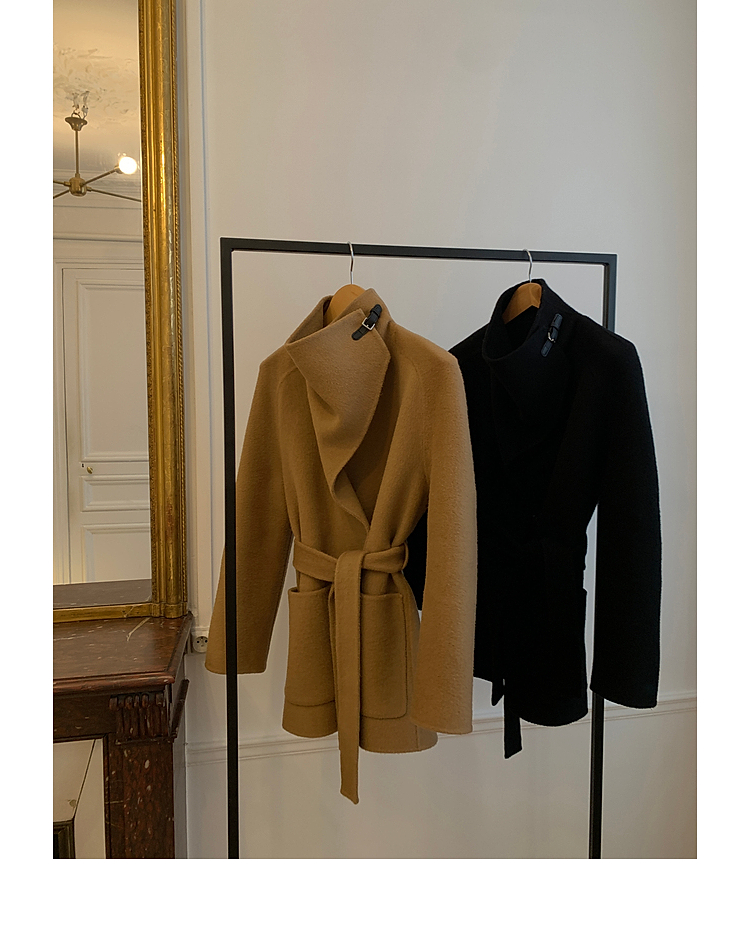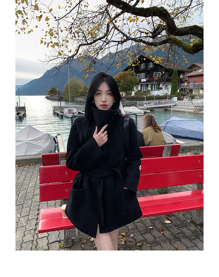 Xia Shiwen Sheep Wool Double-Sided Woolen Cape Outwear Women's Winter Lace-Up Waist Mid-Length Outwear about Poem