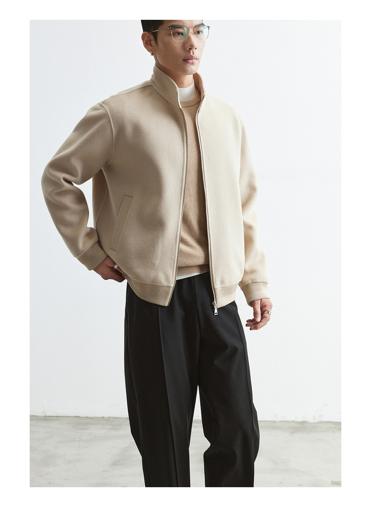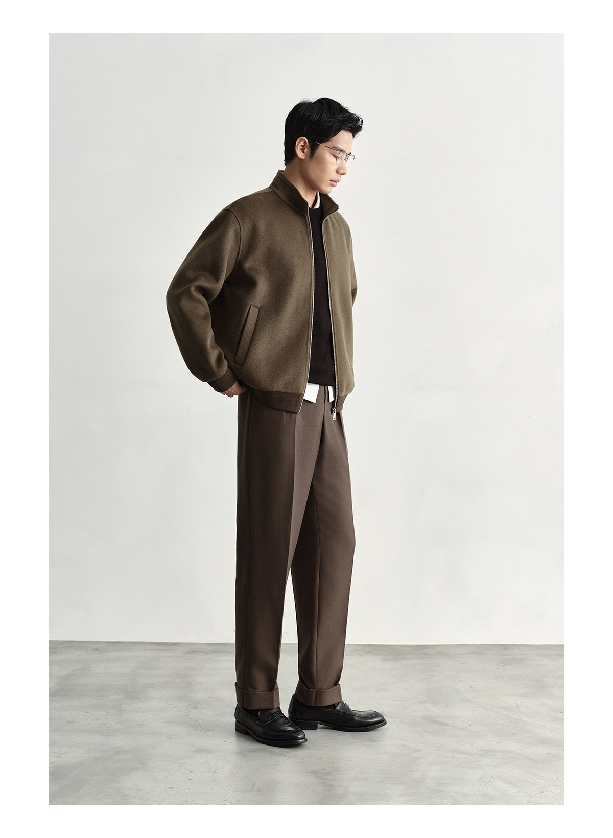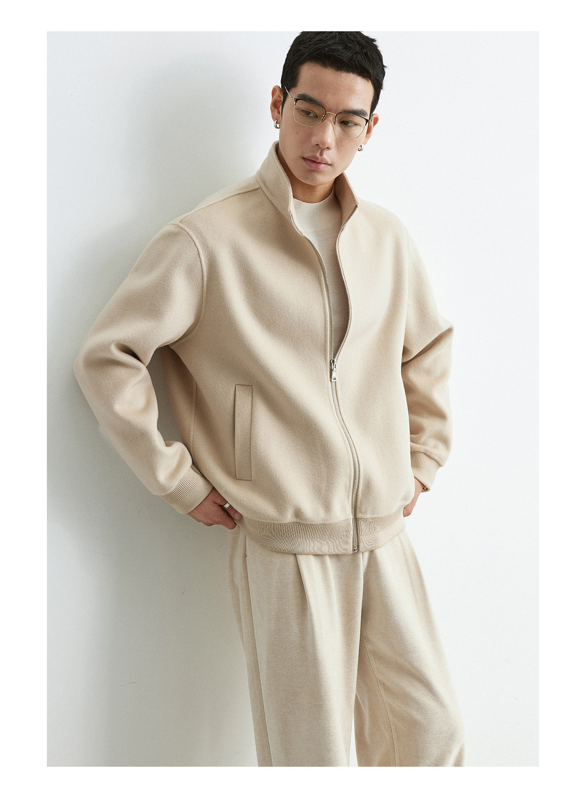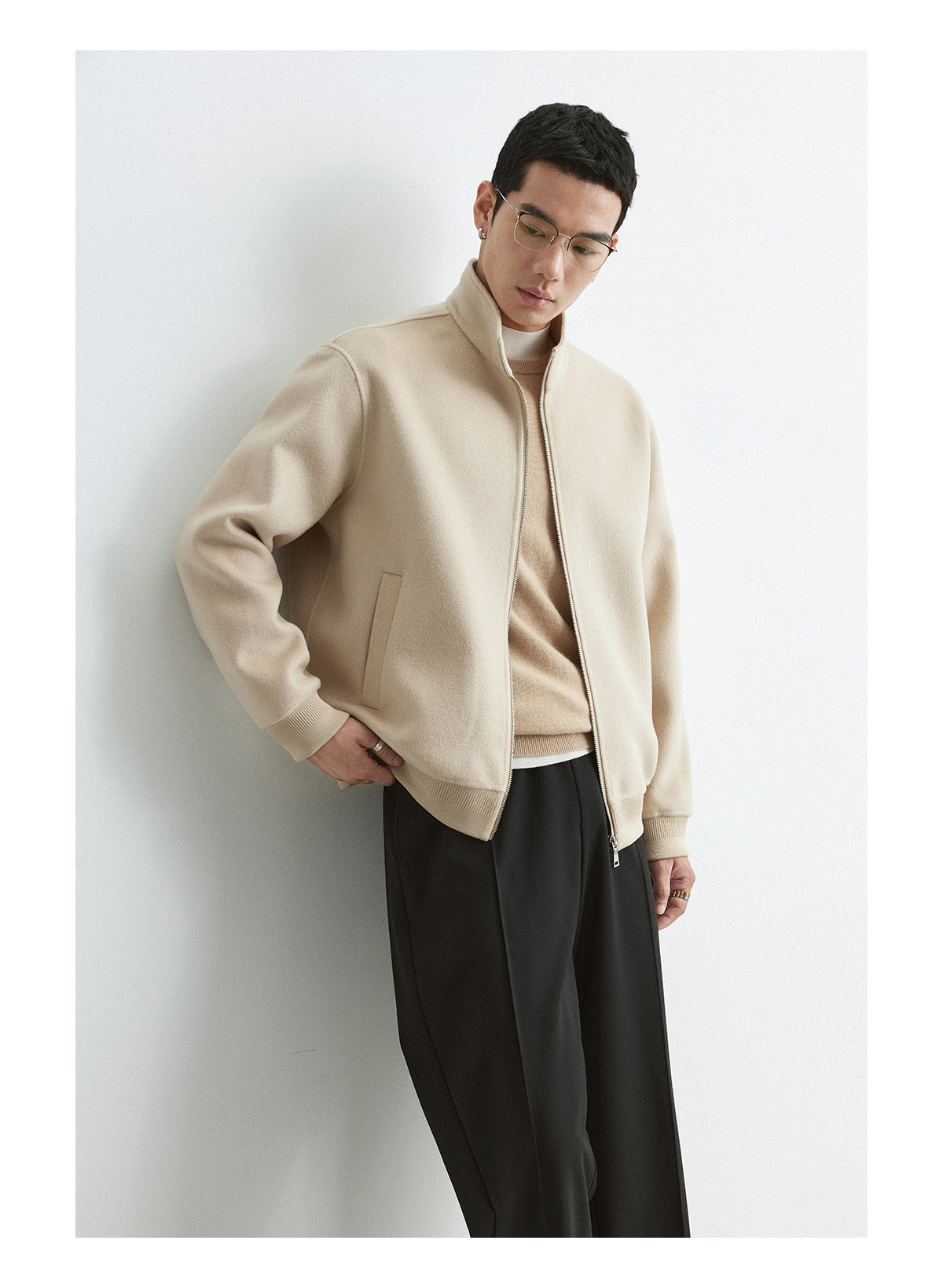 Osens Men's Clothing 100% Wool Short Coat Handmade Double-Sided Woolen Jacket with Regular Shoulders and Stand Collar Men's Woolen Coat
