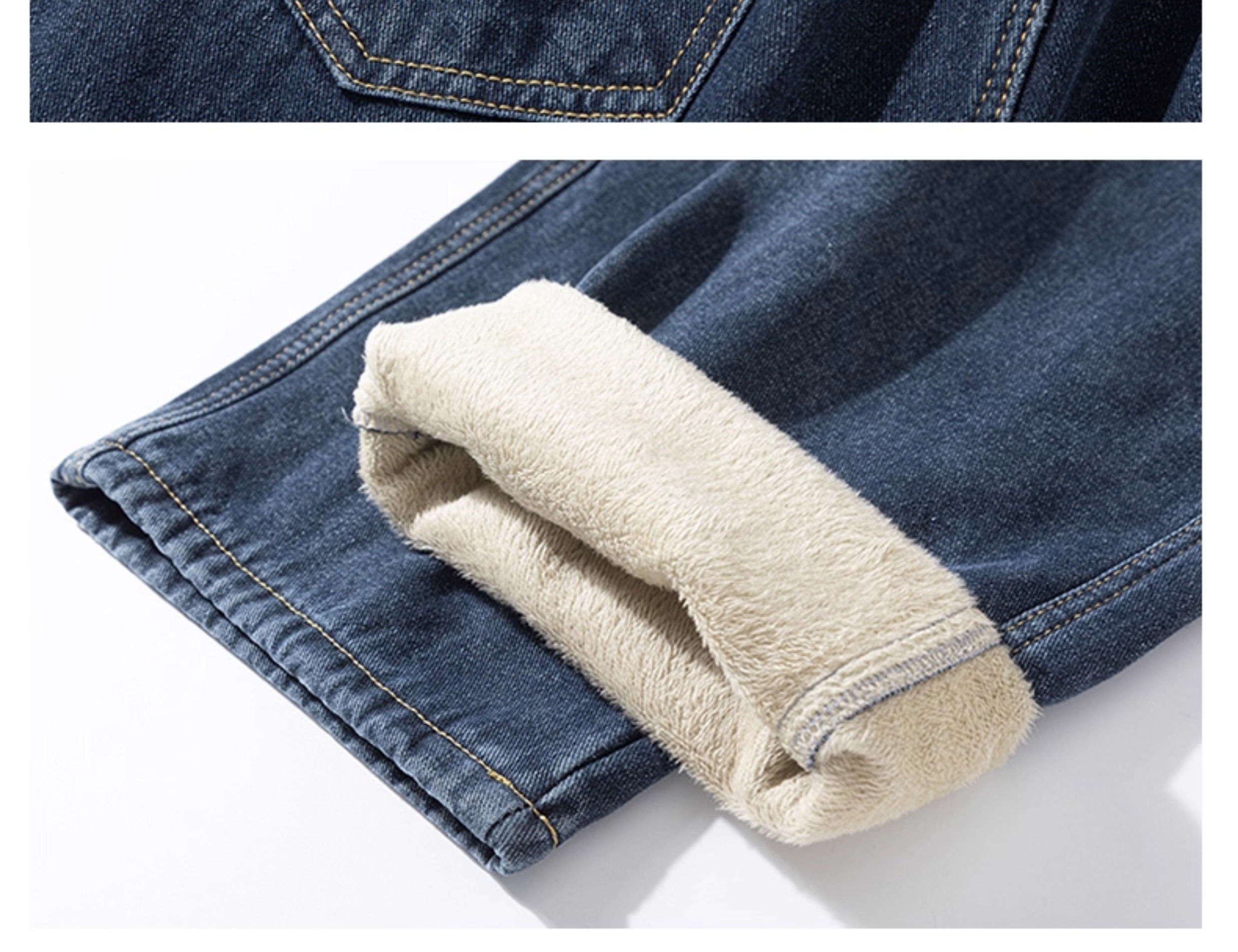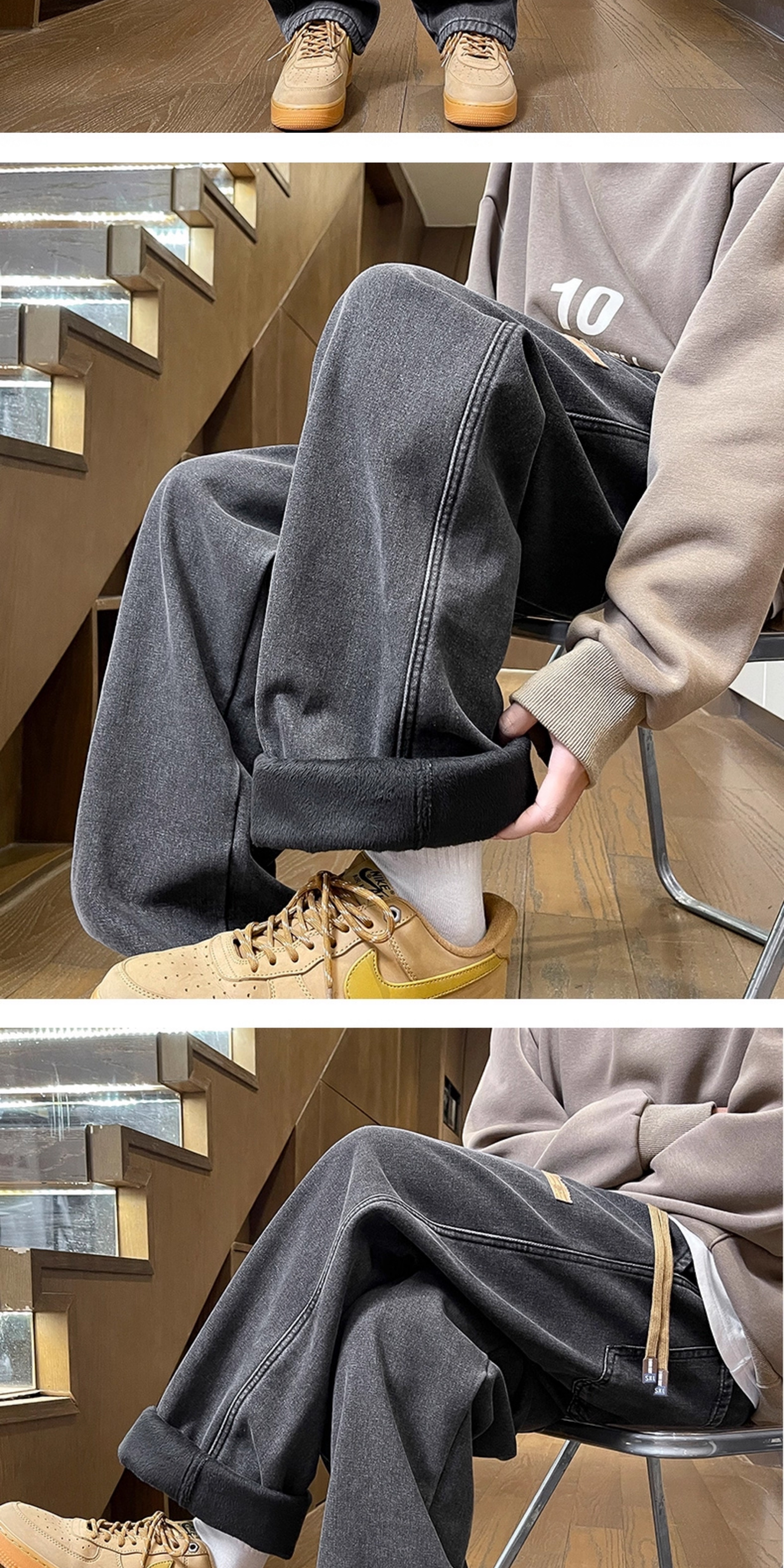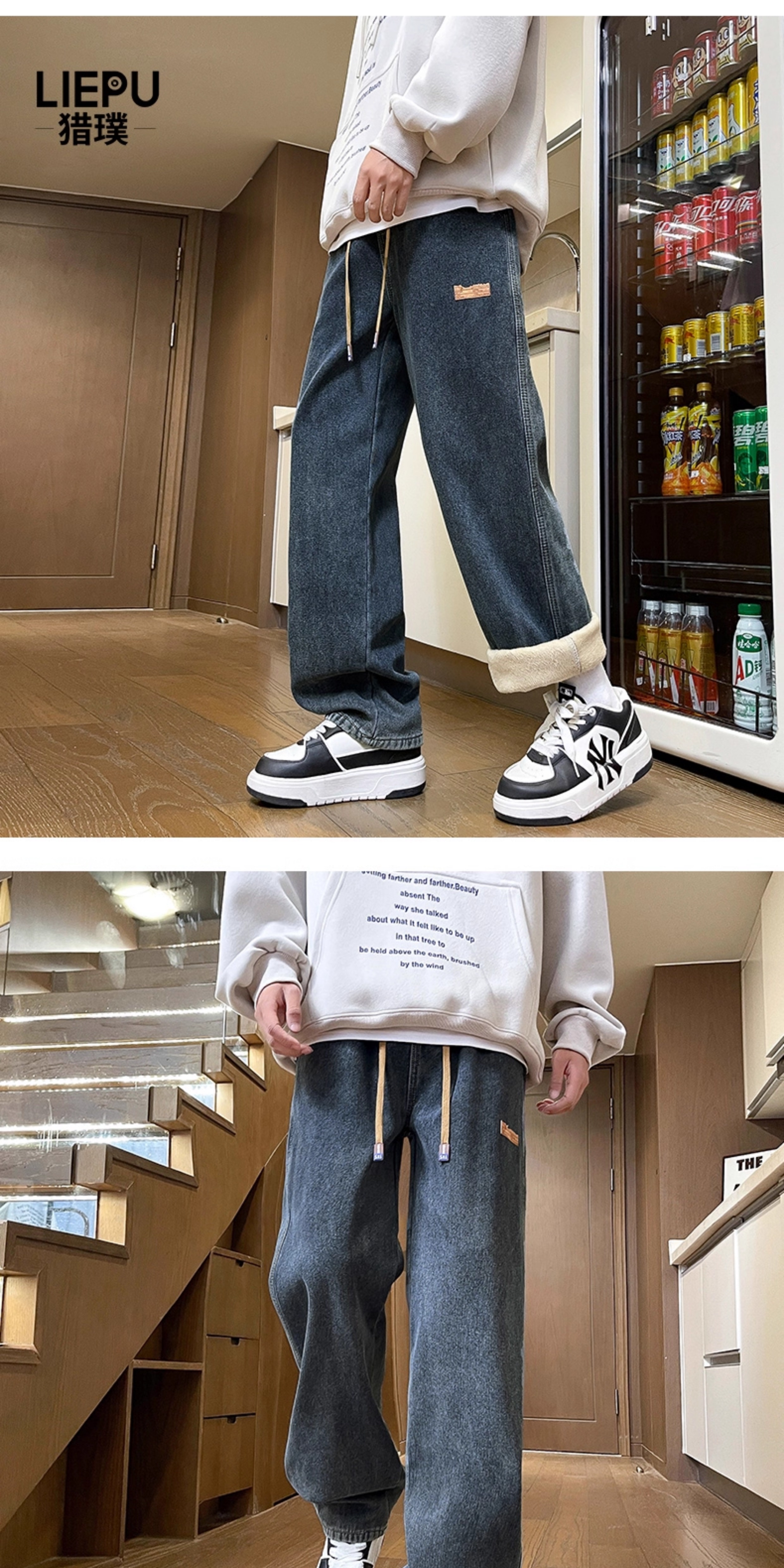 Men's Fleece-Lined Jeans, American Style, New Winter Casual Loose Fit, Straight-Leg Thickened Pants
