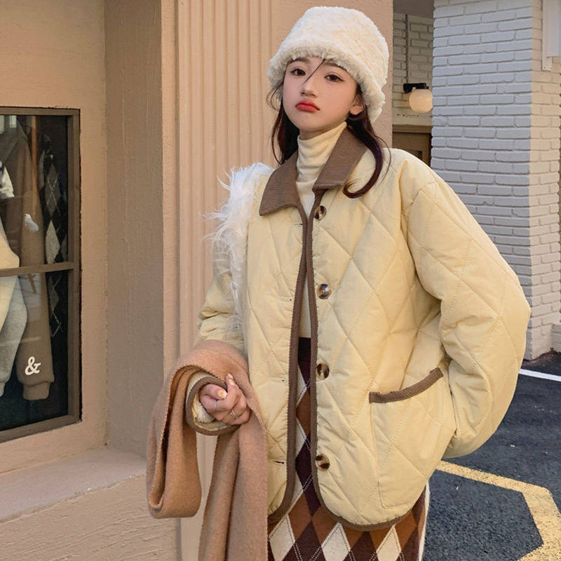New Korean Style Short Cotton-Padded Jacket 2023 with Contrasting Color Diamond Pattern Design and Lapel for Winter