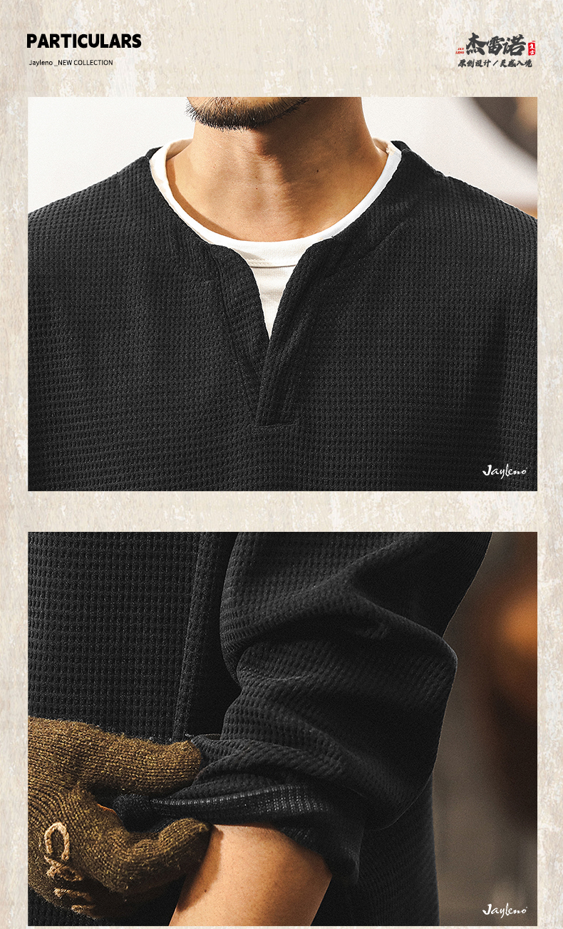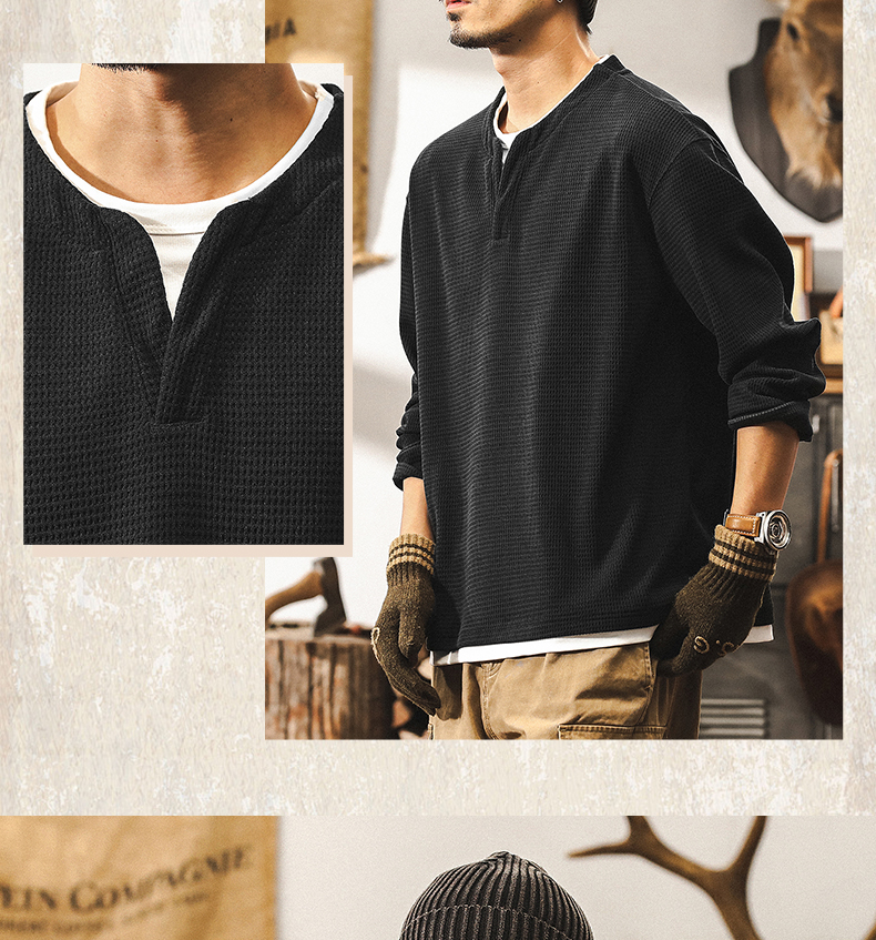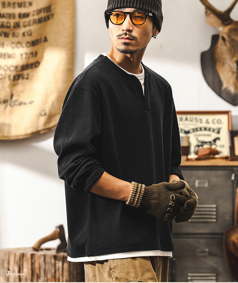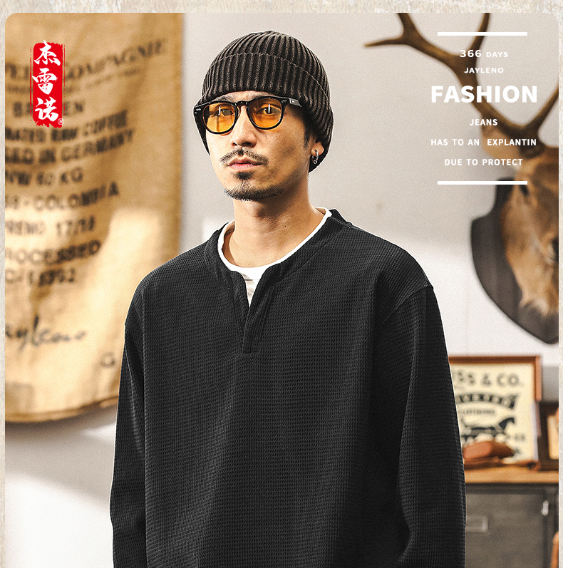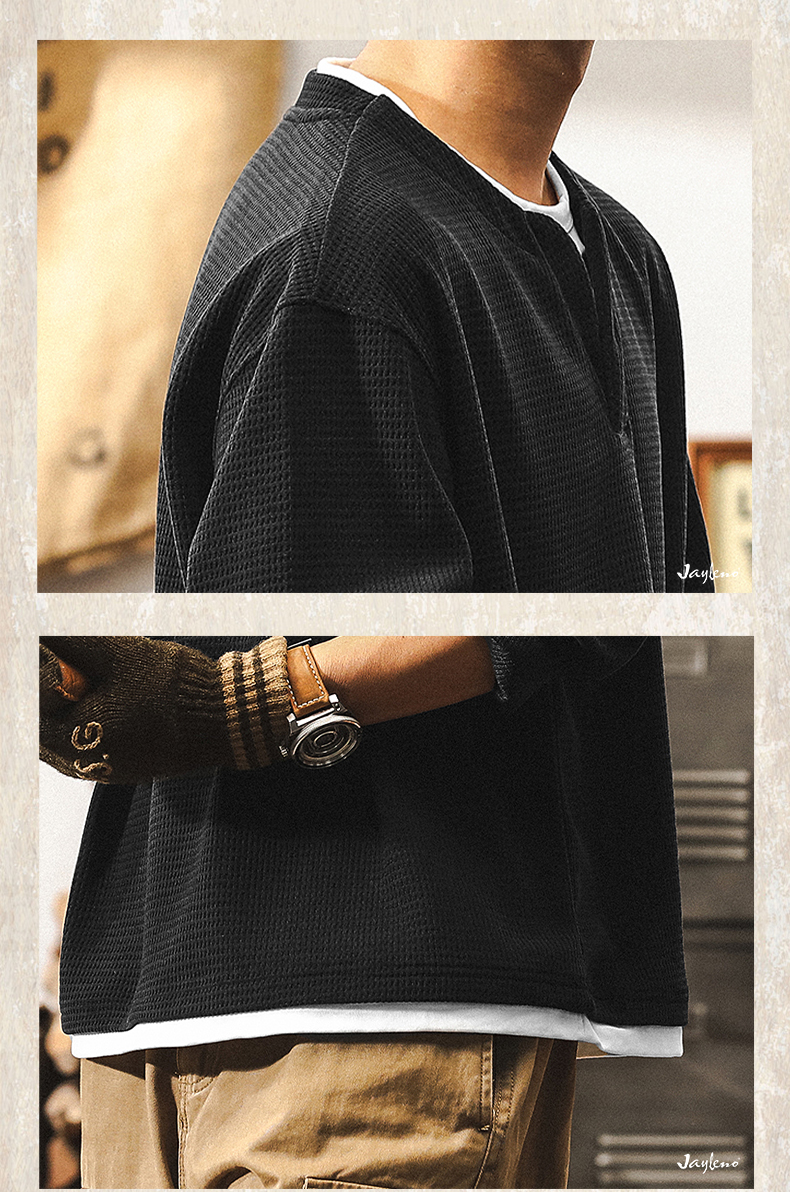 【Fake Two-Piece】American Retro Heavyweight European Cotton Fleece Long-Sleeve T-Shirt for Men, Autumn 2025 New Model, Tough Guy Henley Shirt