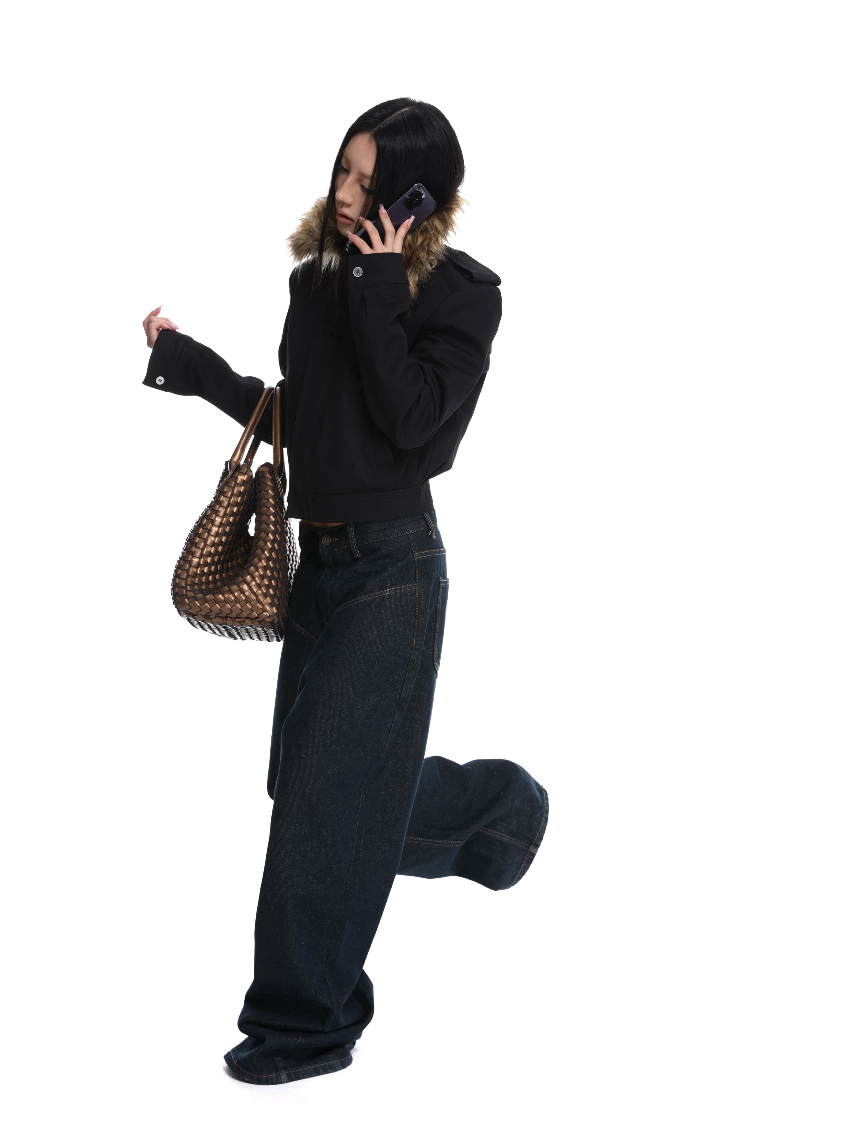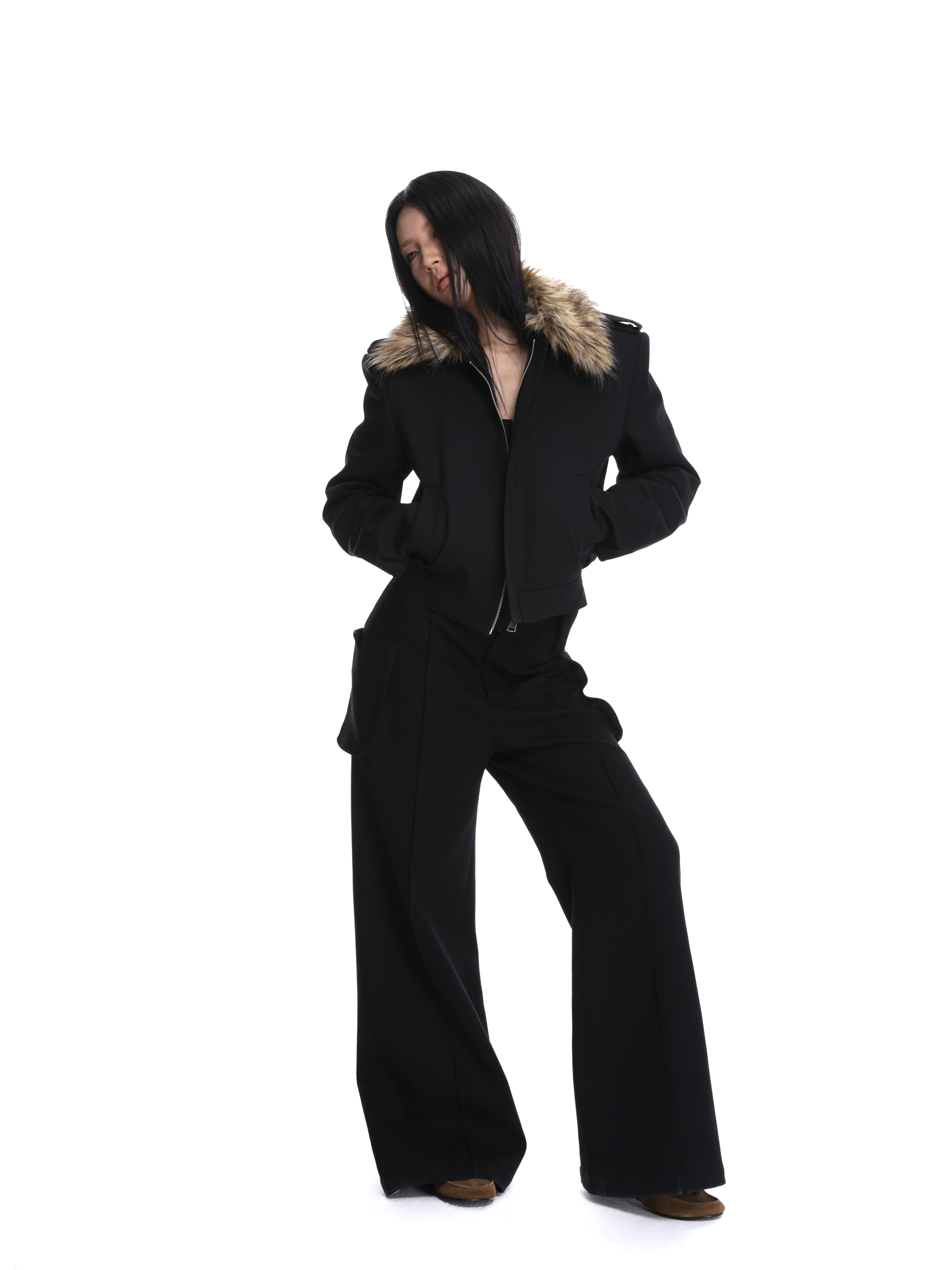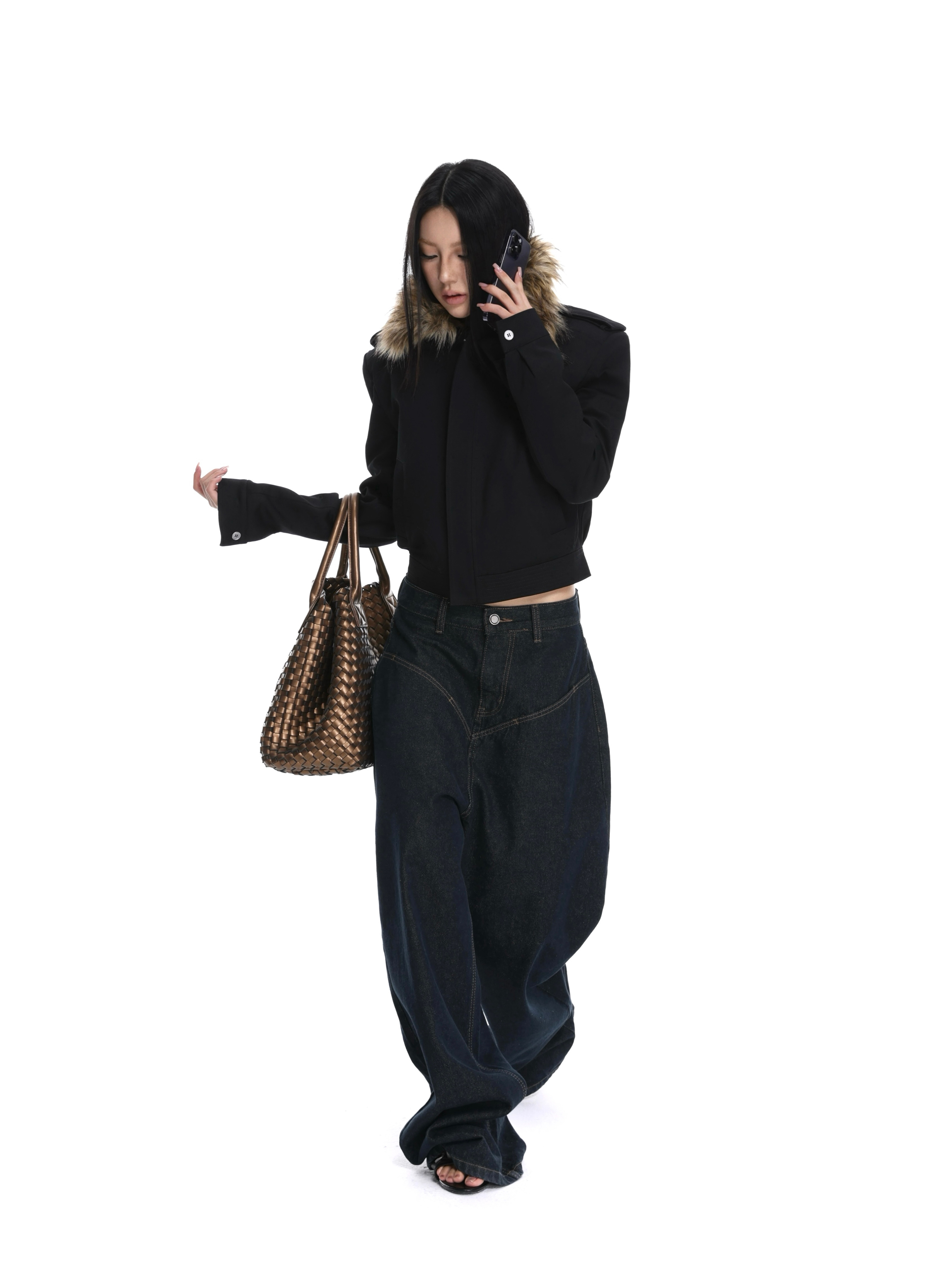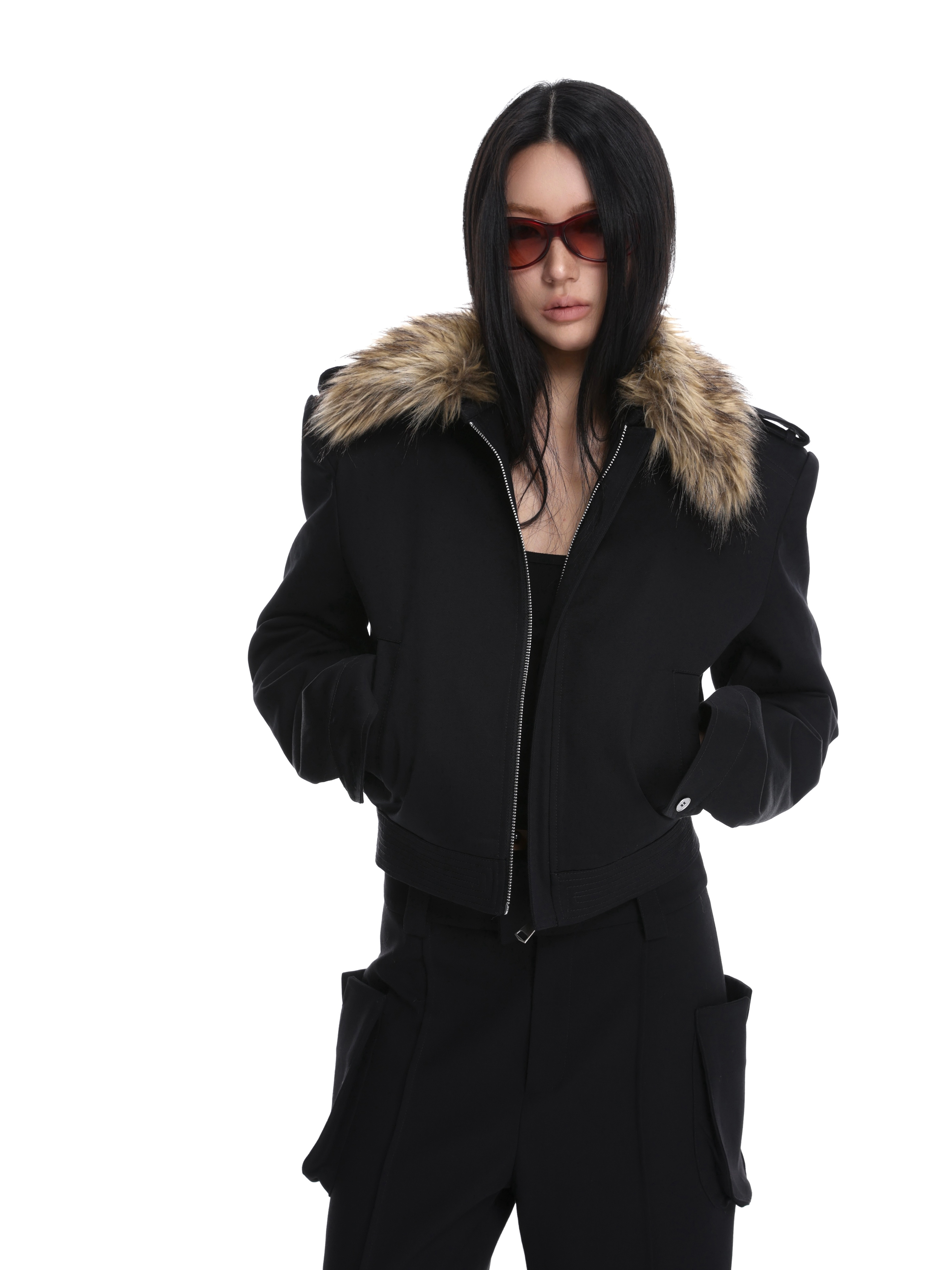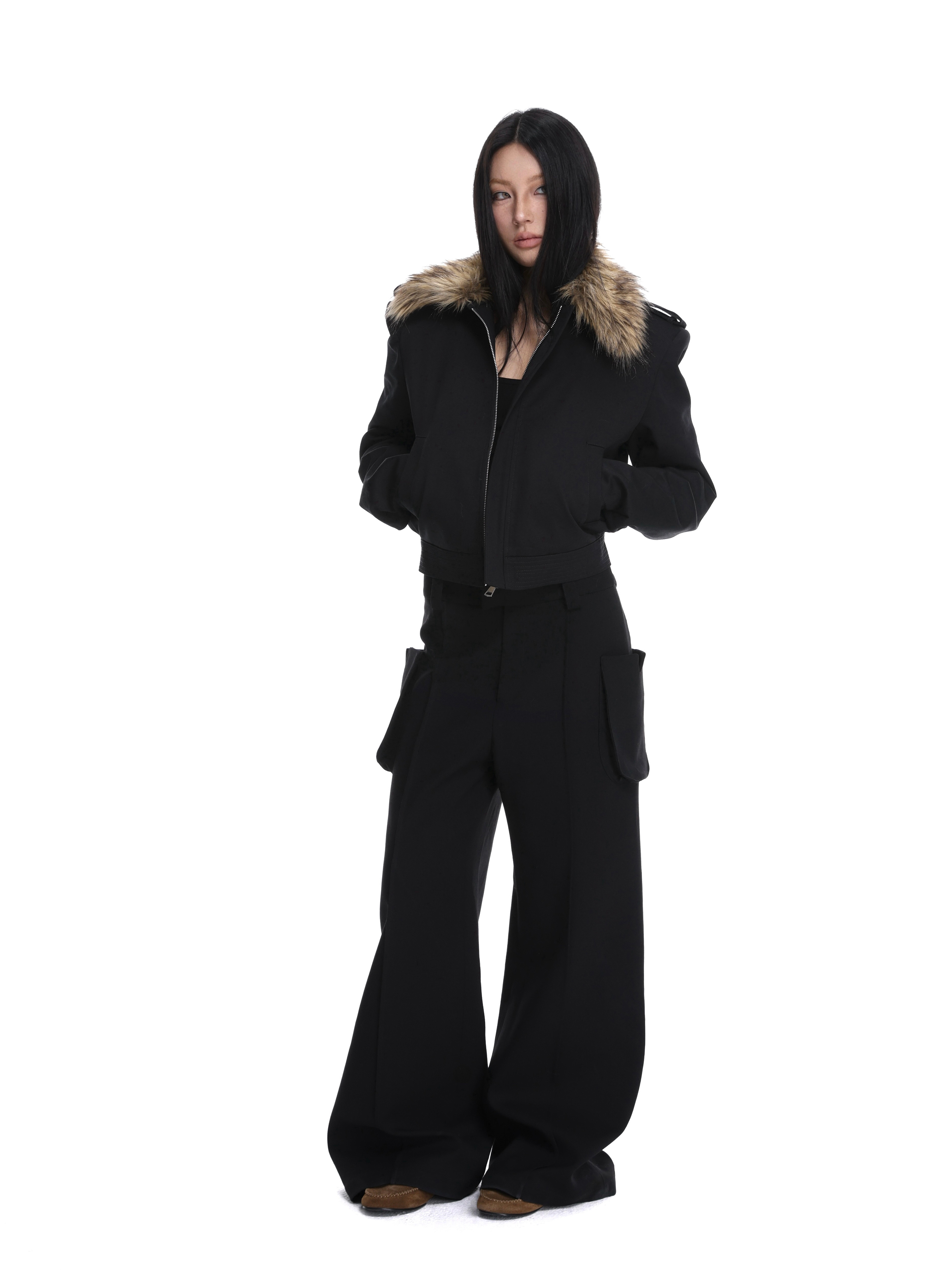 Iamxiaa Detachable Fur Collar High-End Short Black Thickened Jacket Cotton Coat for Petite Women Winter