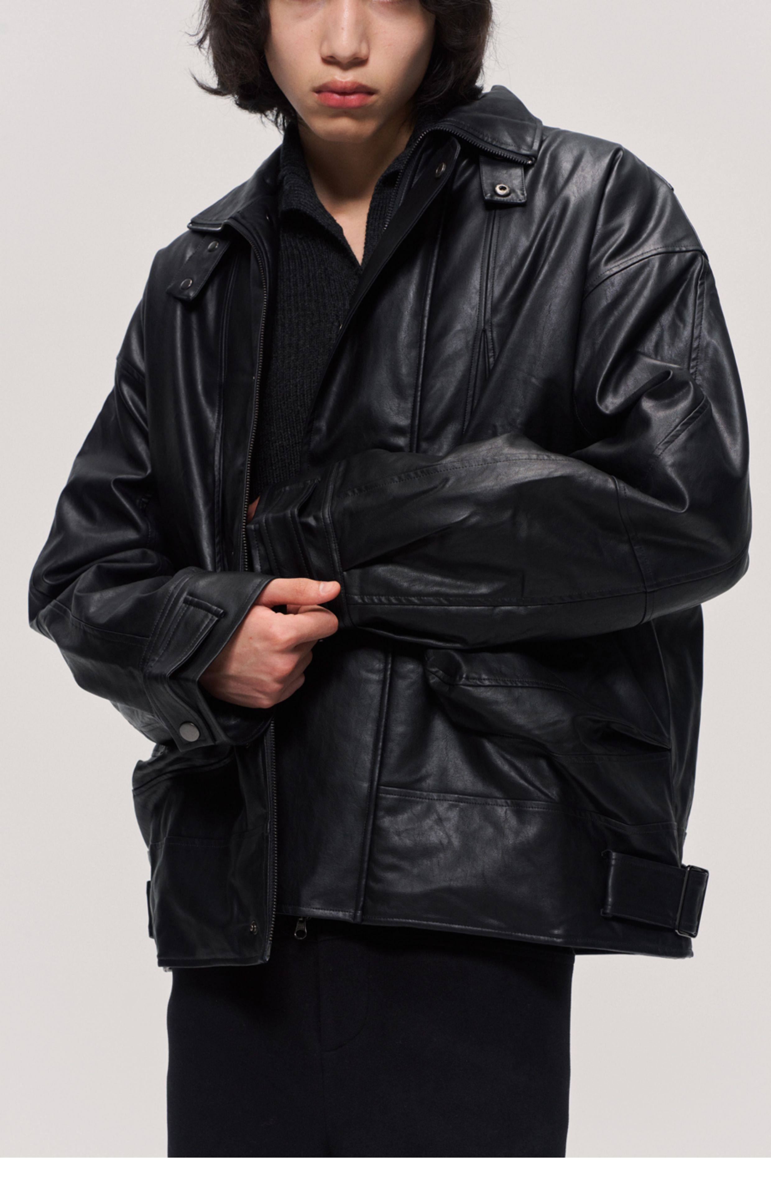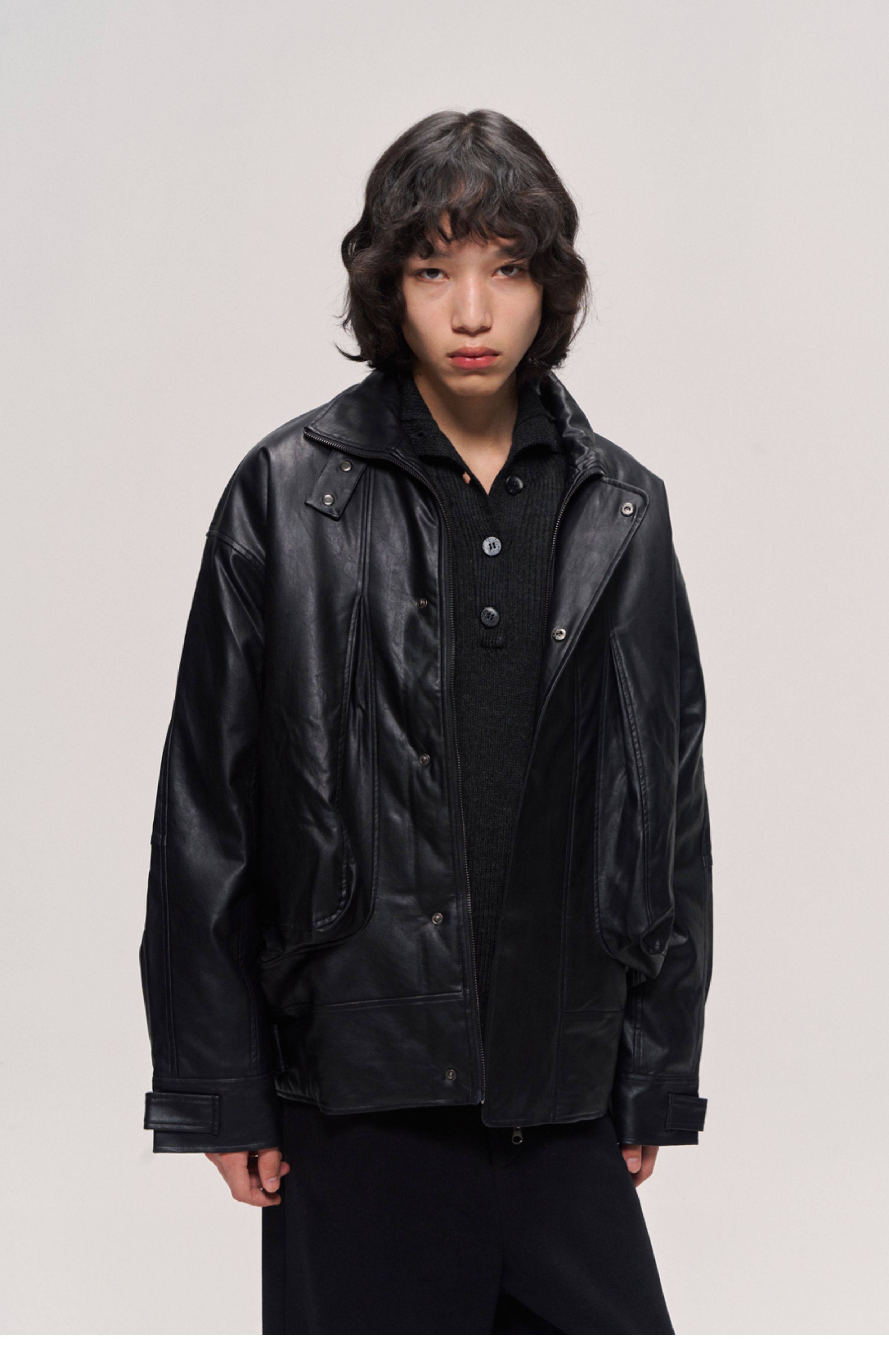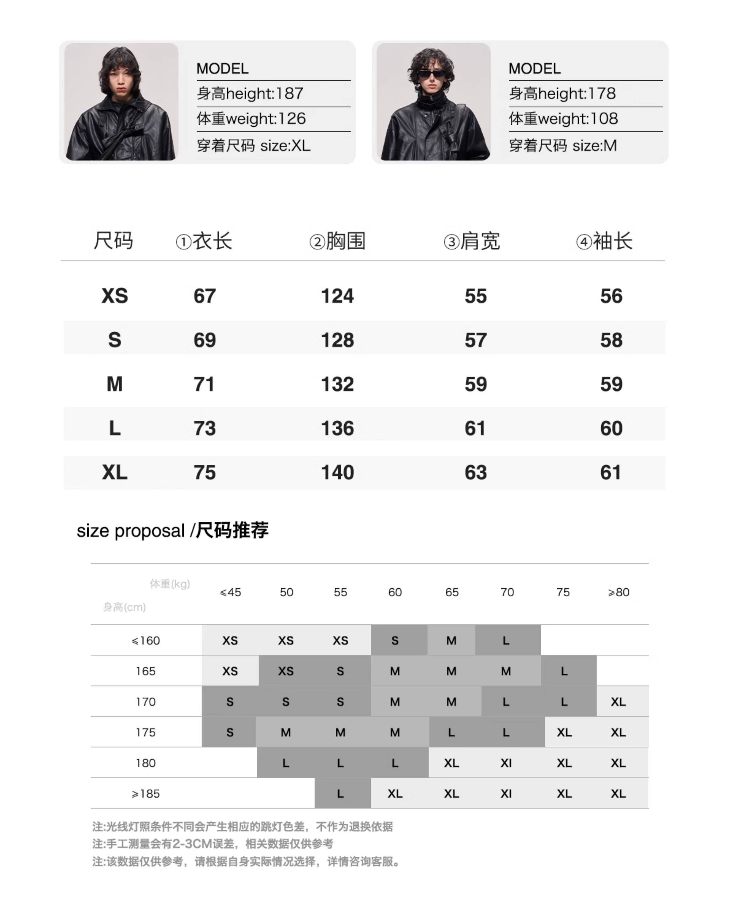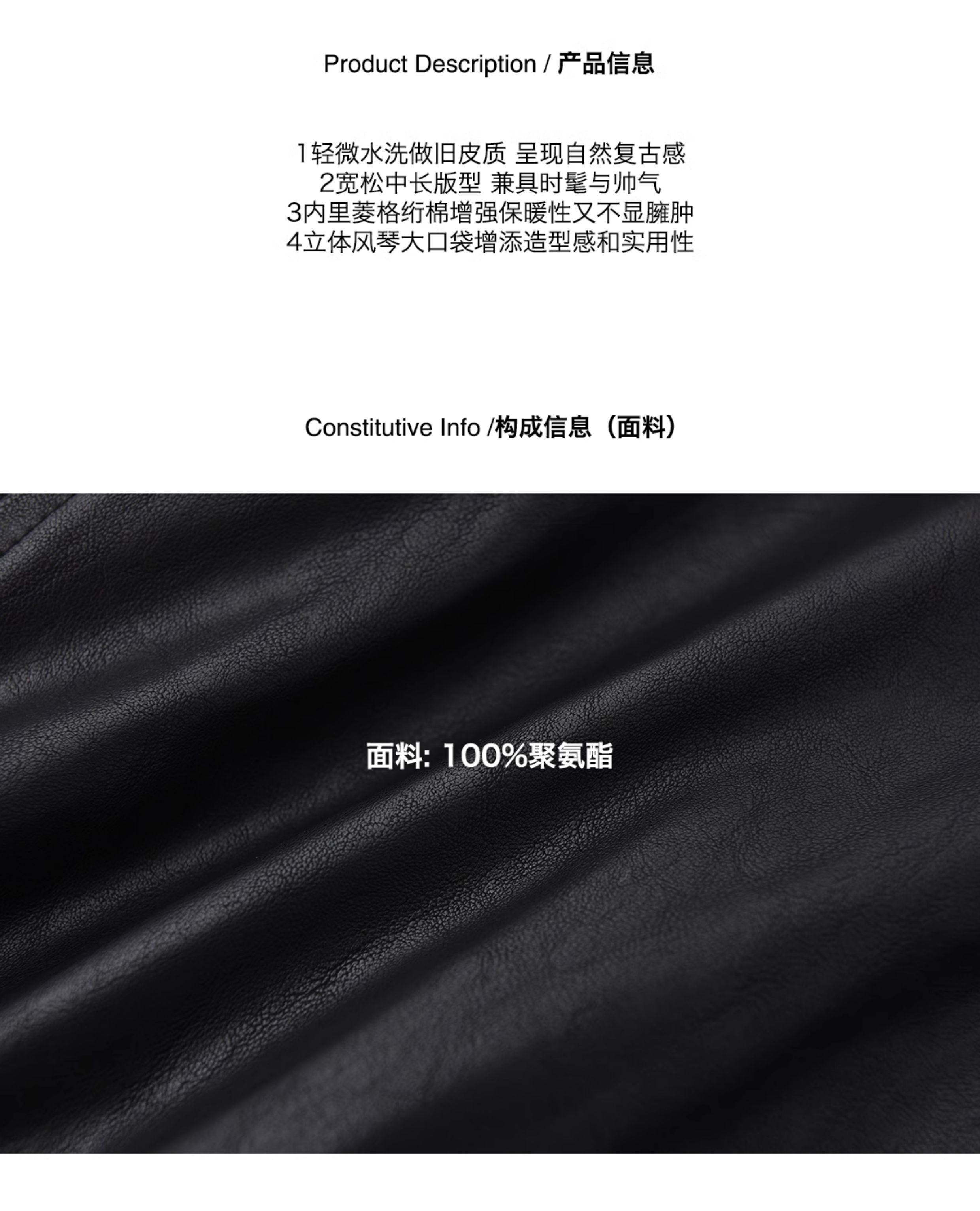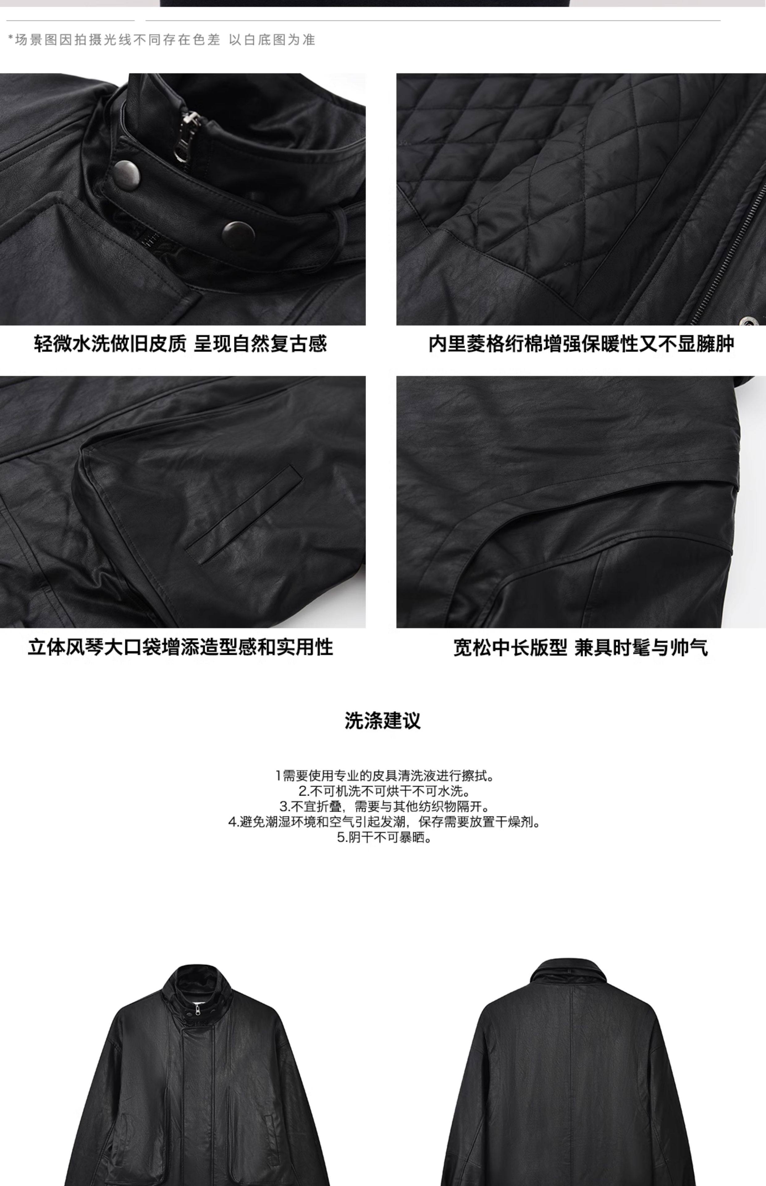 Limpidoculus Washed and Distressed Mid-Length Quilted Stand-Collar Leather Jacket Thick Coat