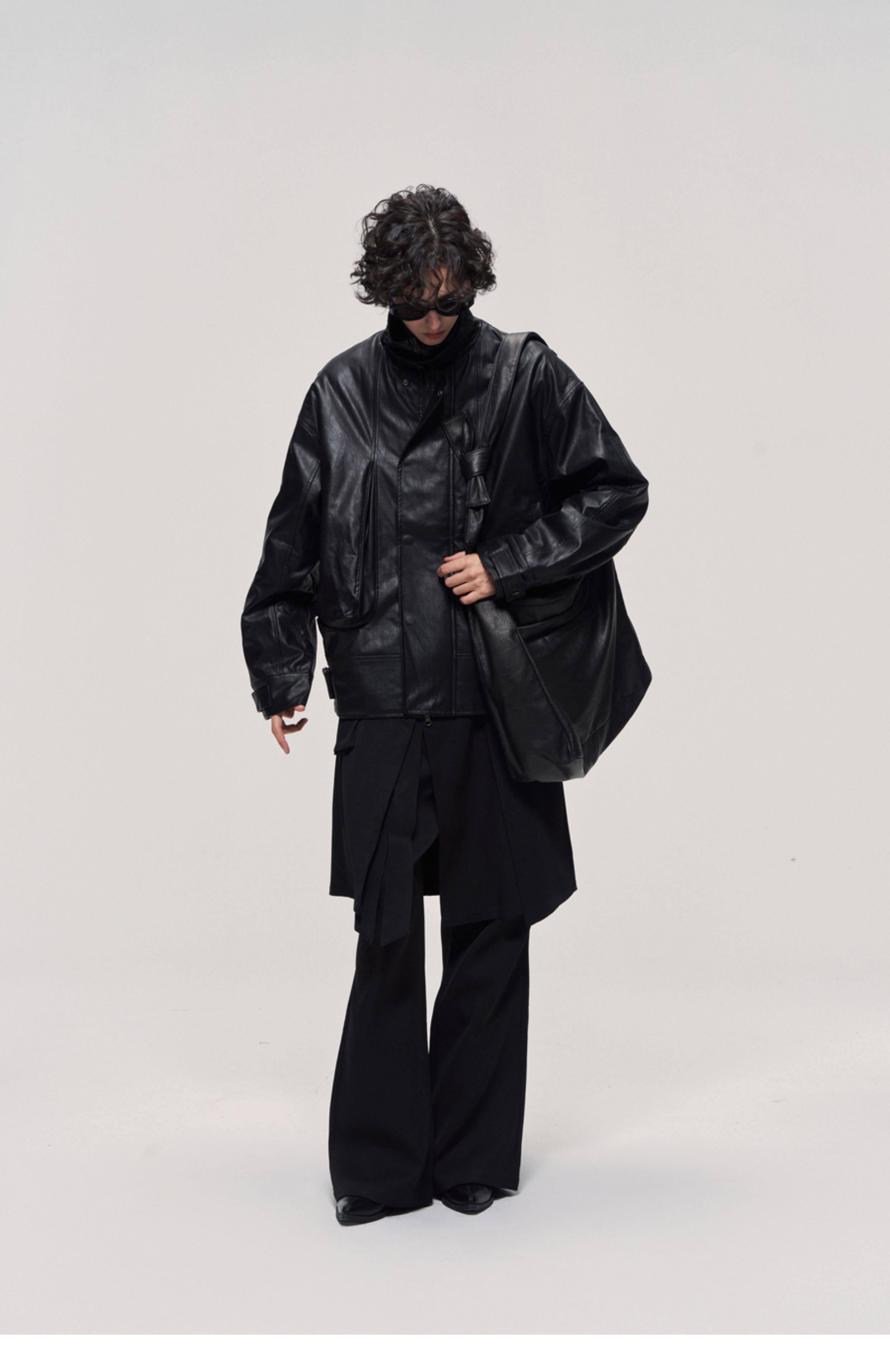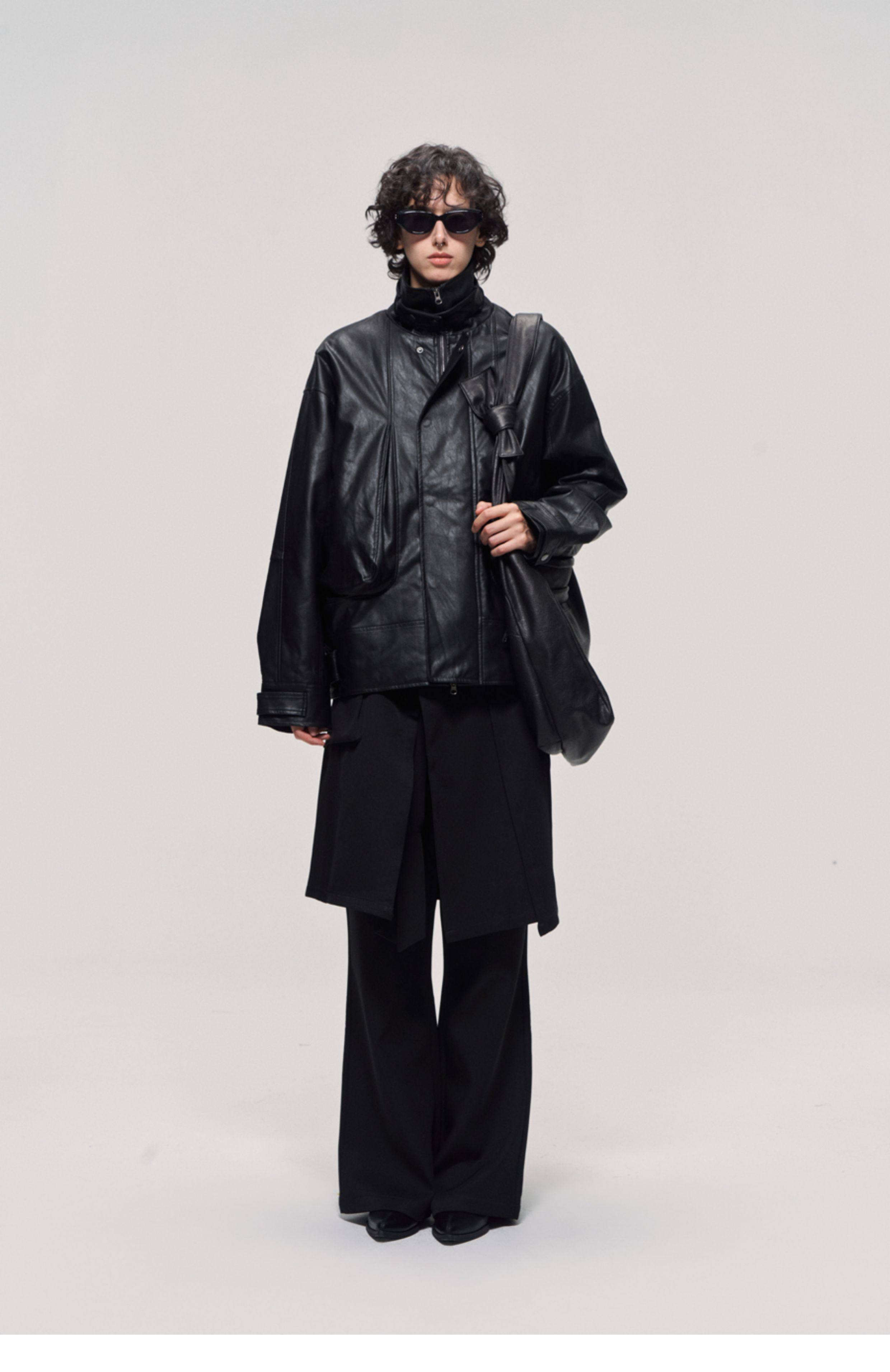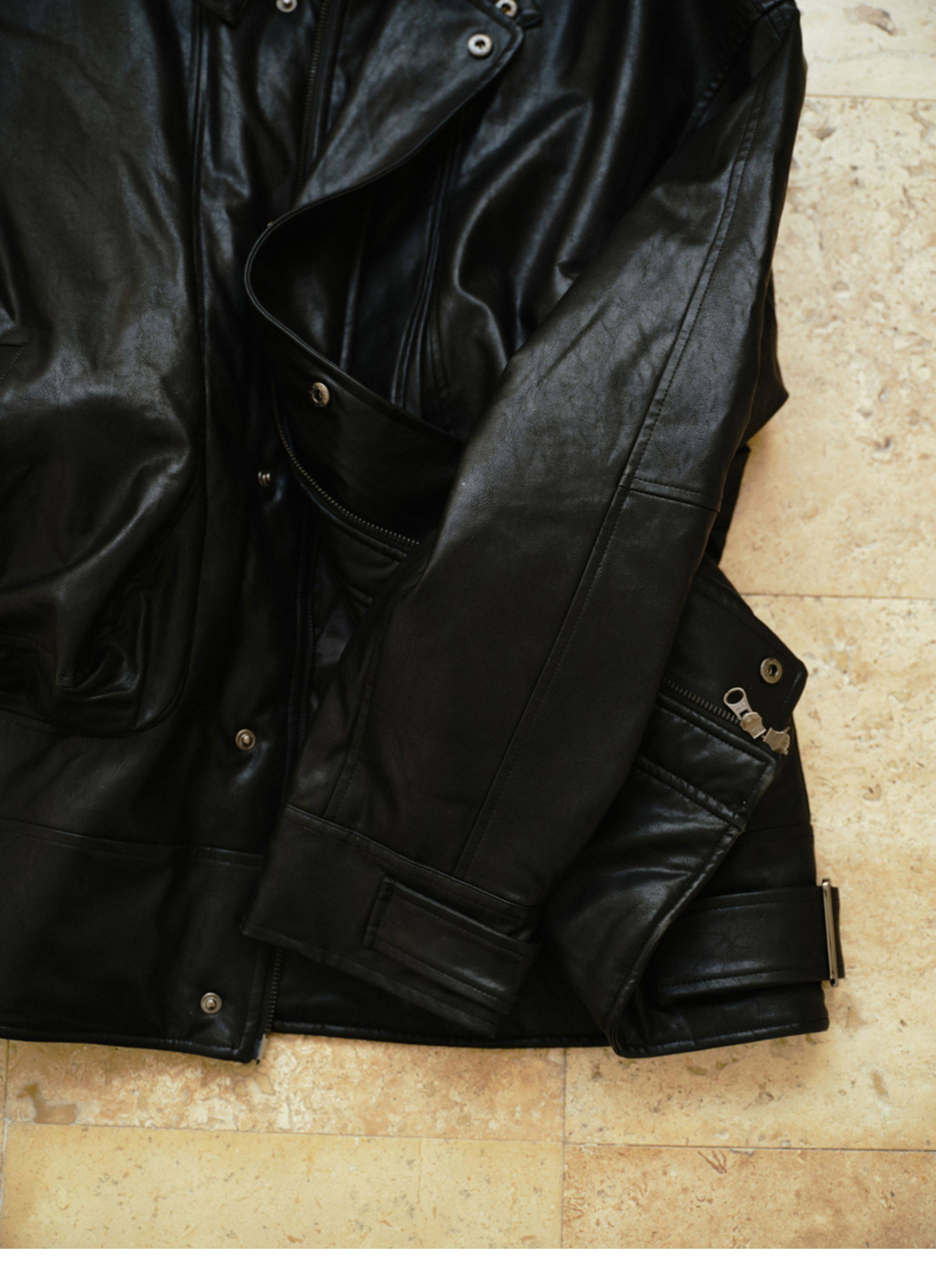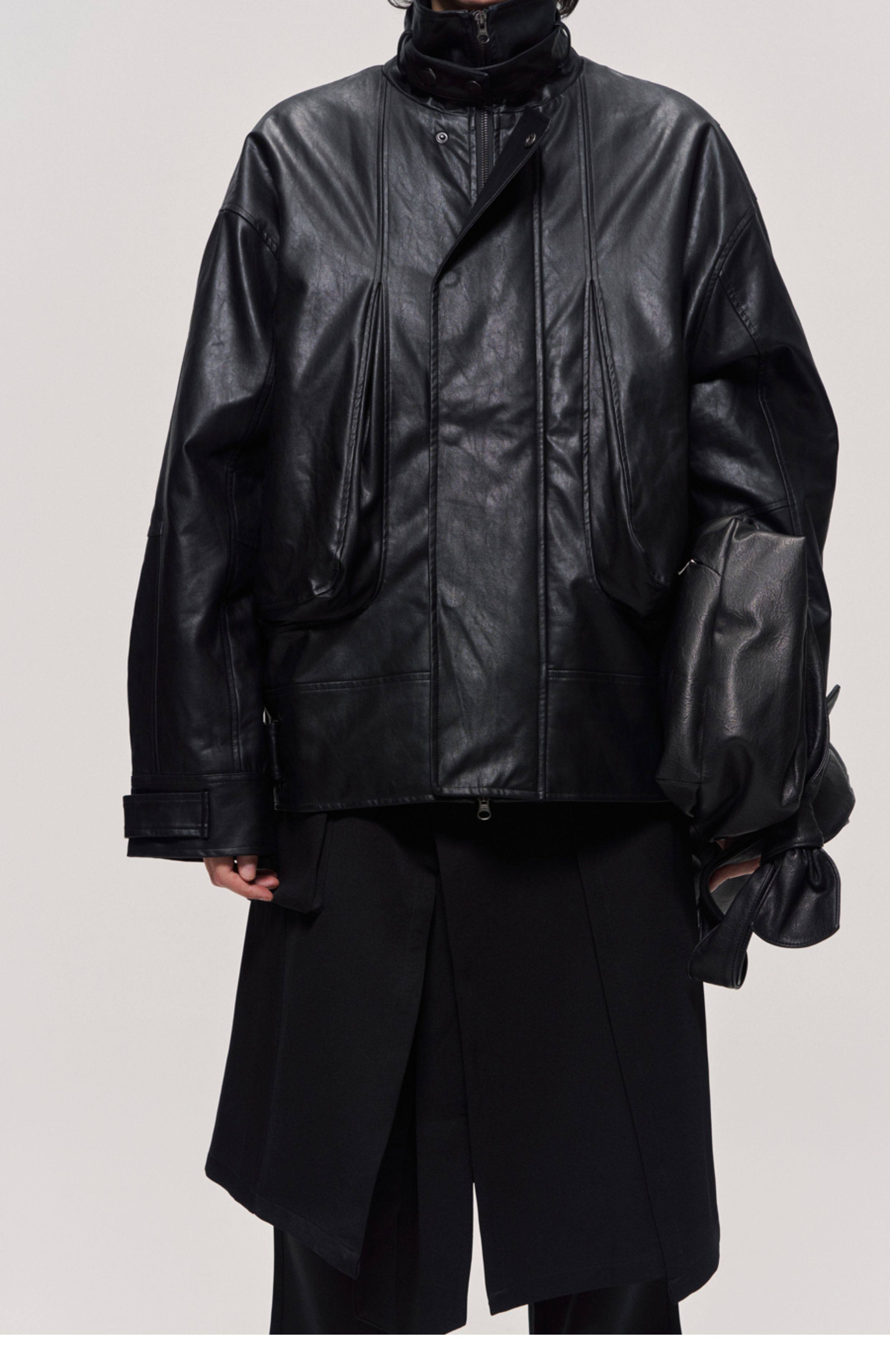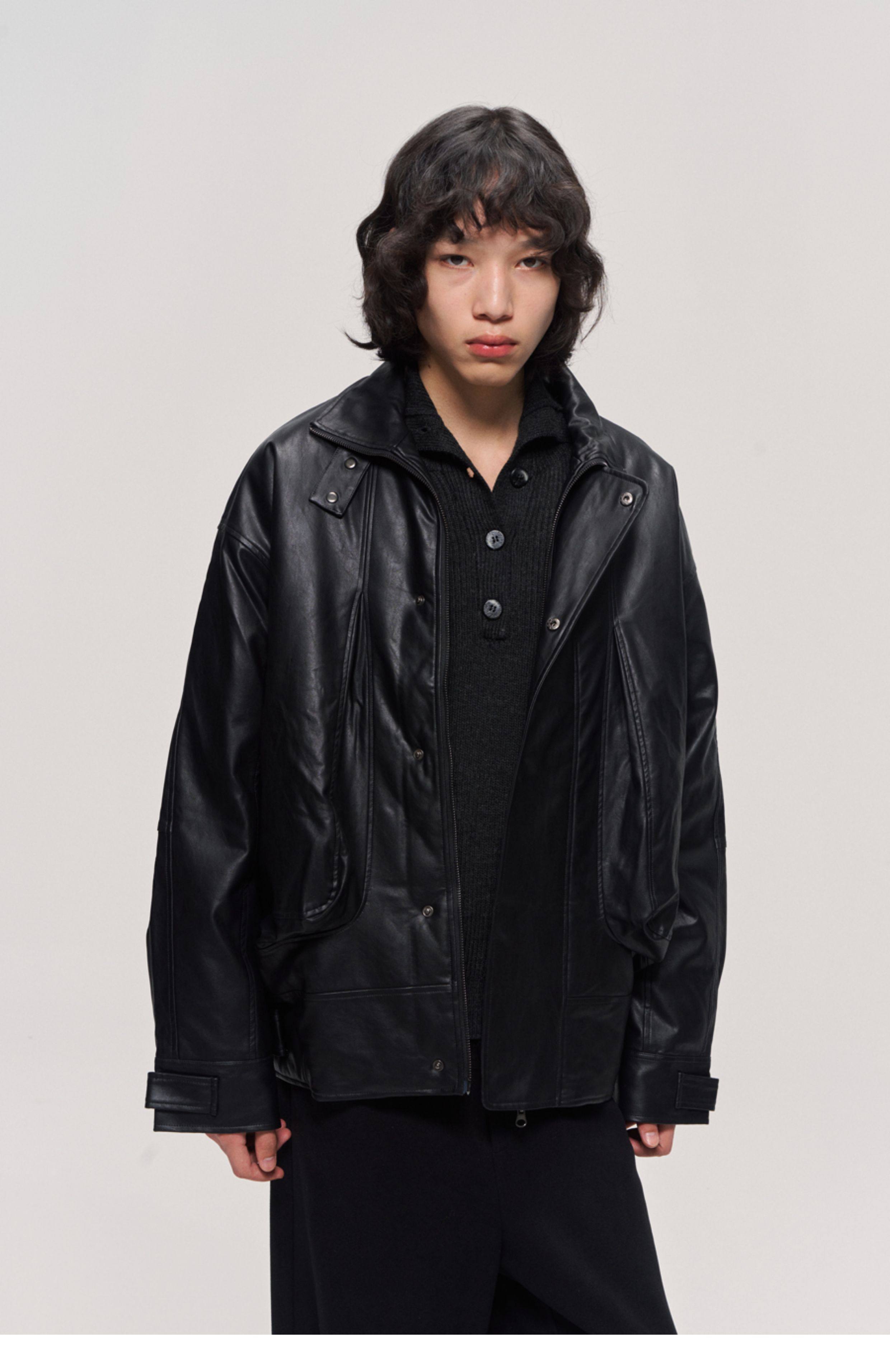 Limpidoculus Washed and Distressed Mid-Length Quilted Stand-Collar Leather Jacket Thick Coat