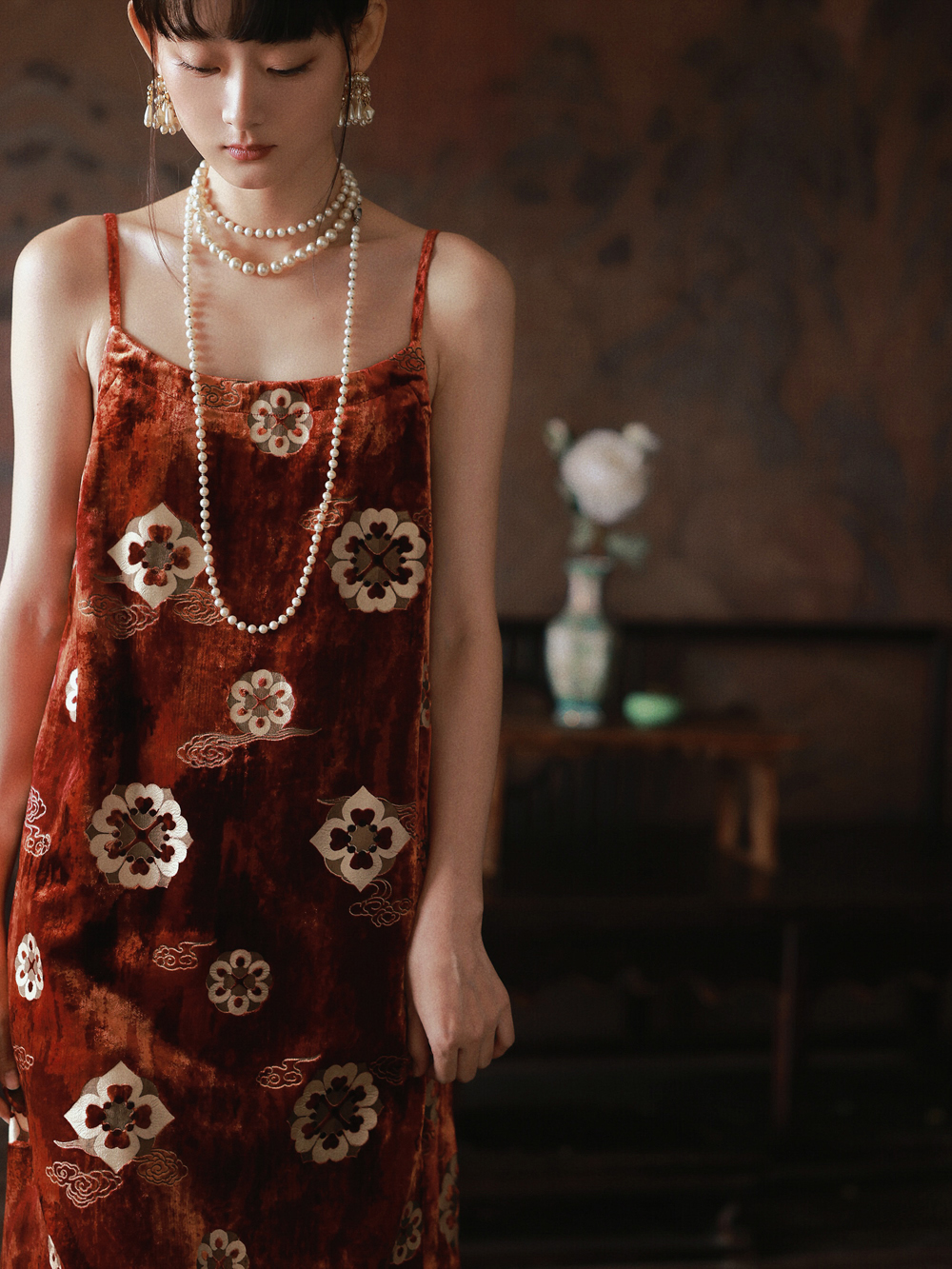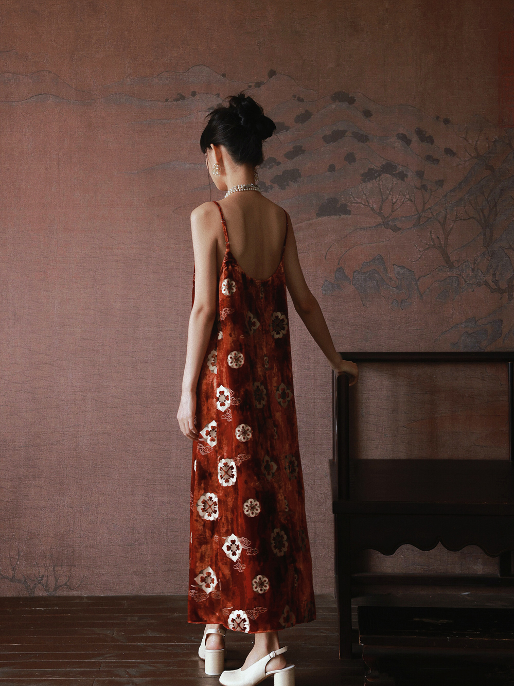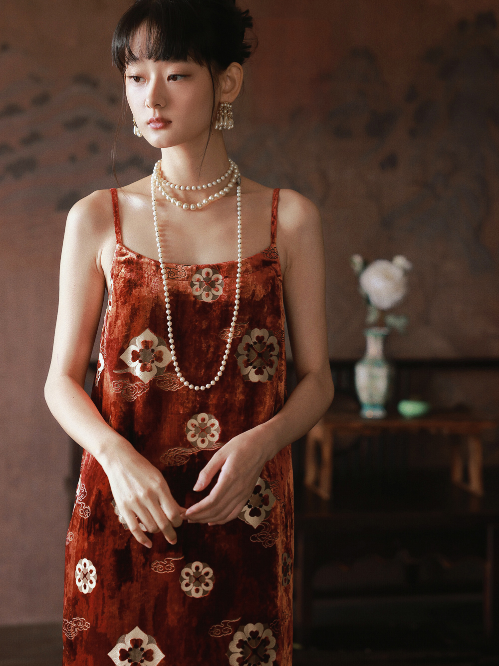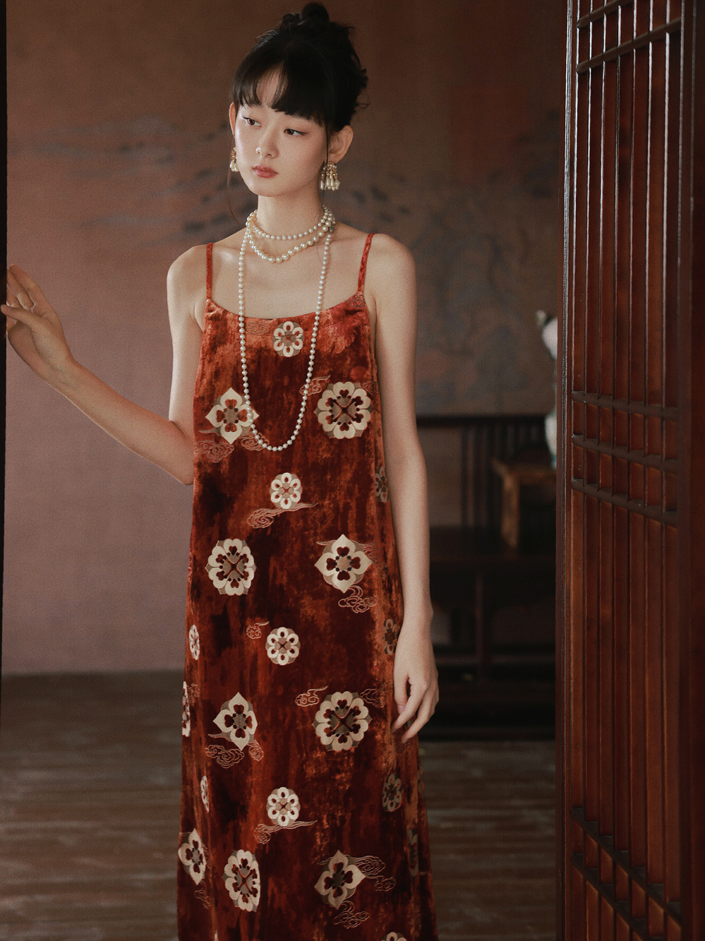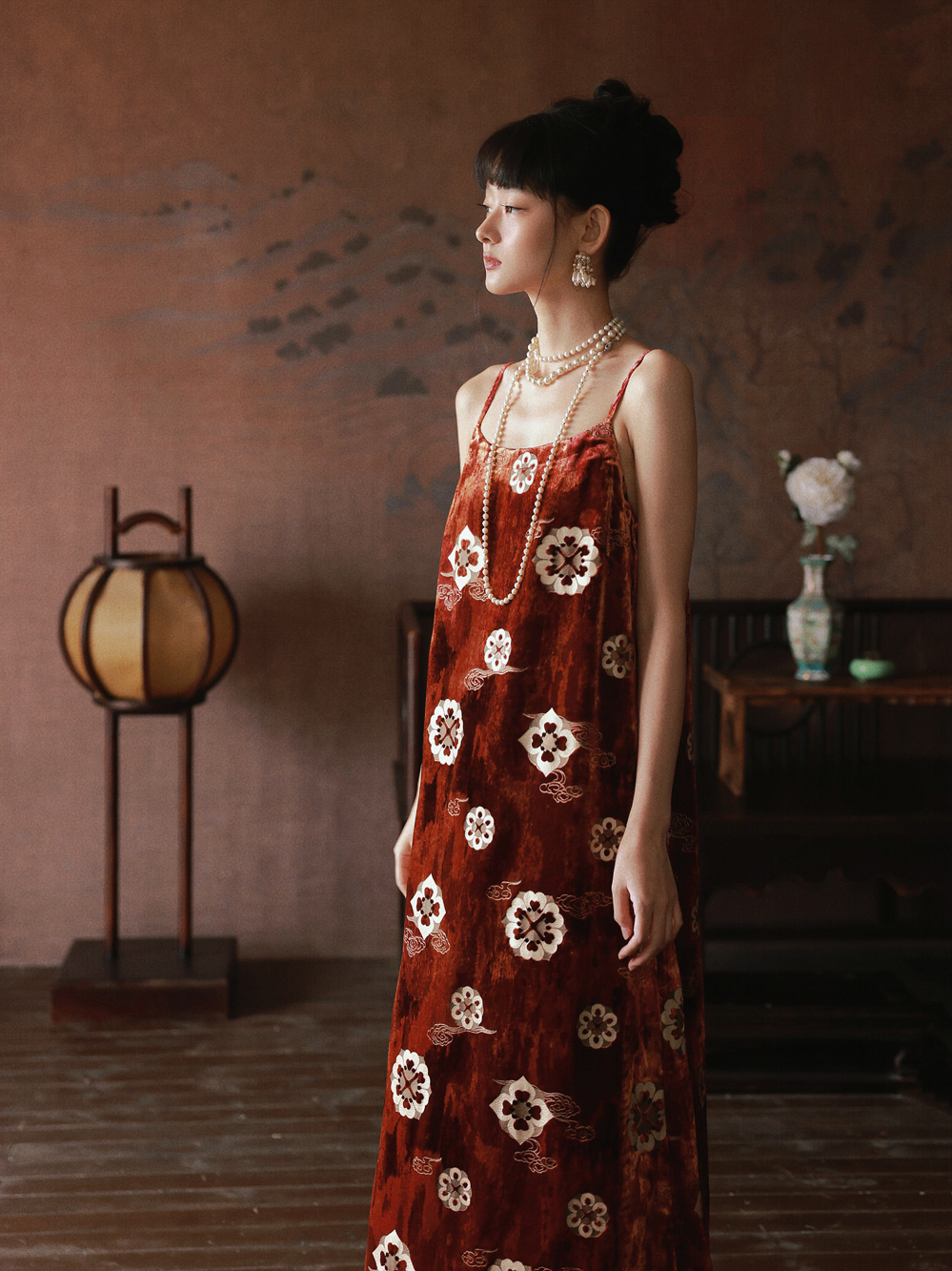 Charmmy Ye 24A/W Deep Red Velvet Printed Dress, Traditional Chinese Style Suspender Dress