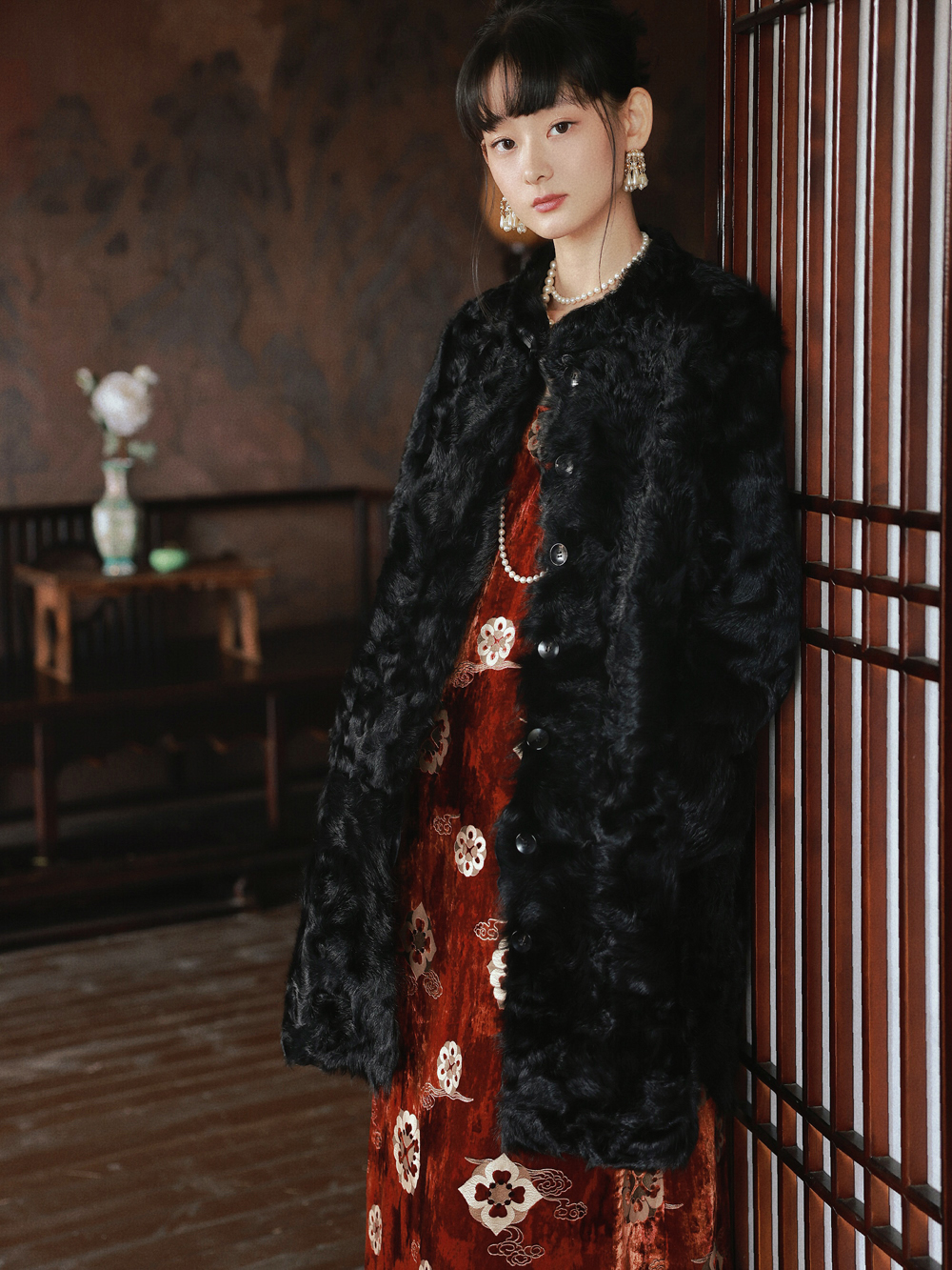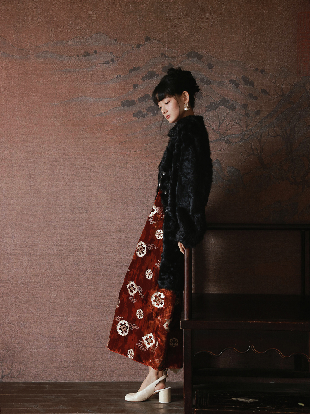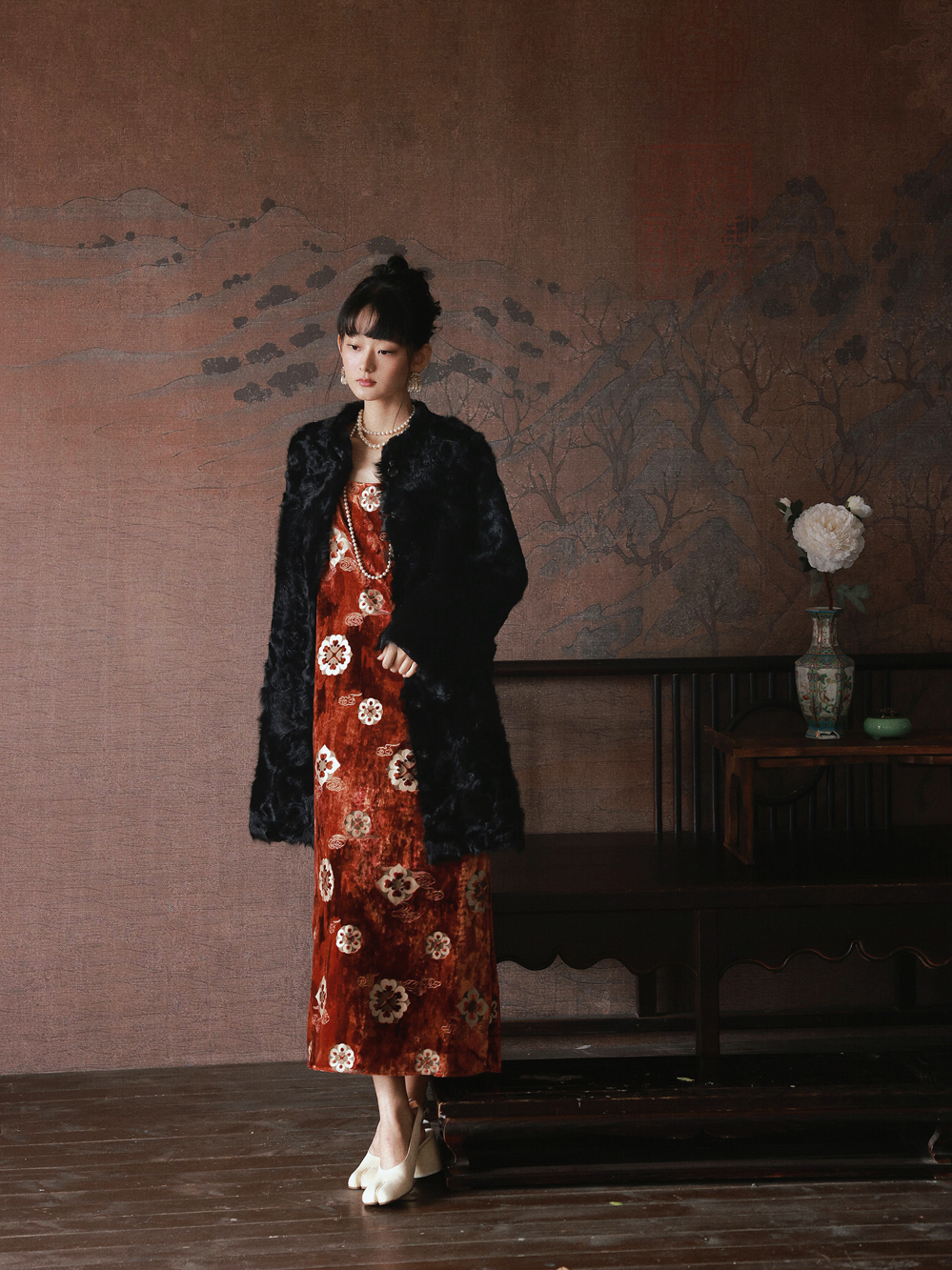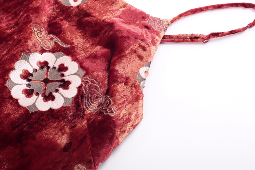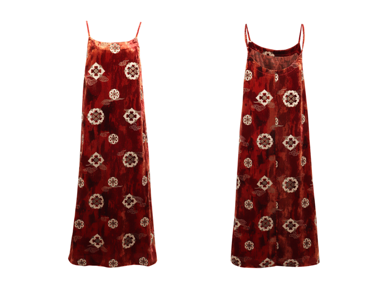 Charmmy Ye 24A/W Deep Red Velvet Printed Dress, Traditional Chinese Style Suspender Dress