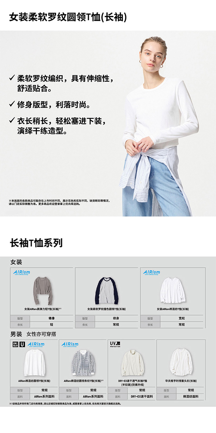 Uniqlo Women's Soft Rib Crewneck T-shirt Long sleeves pure color Basics 474400 479590 470124