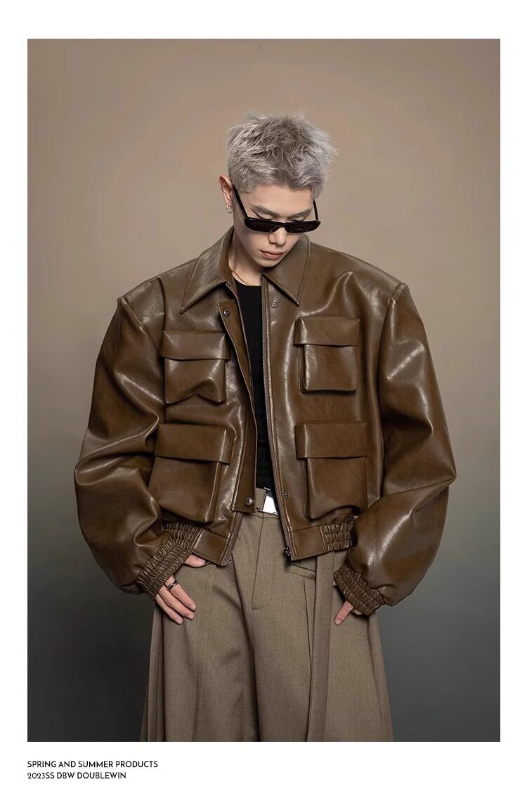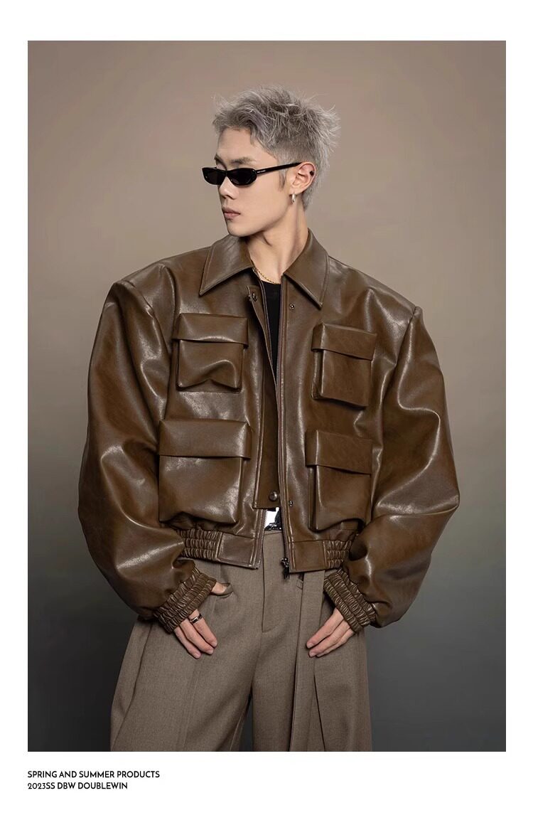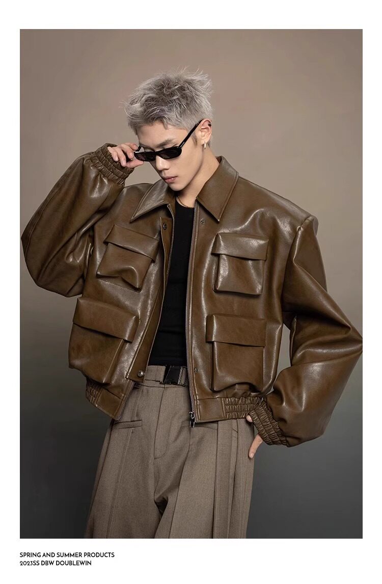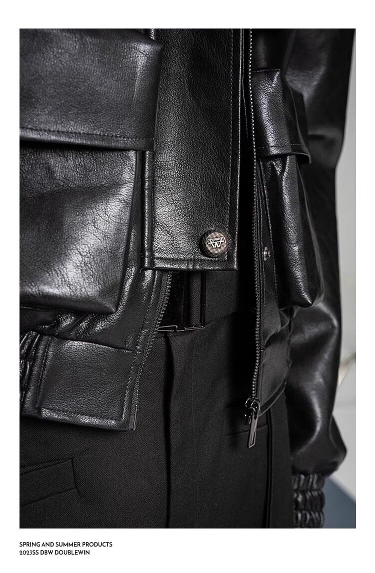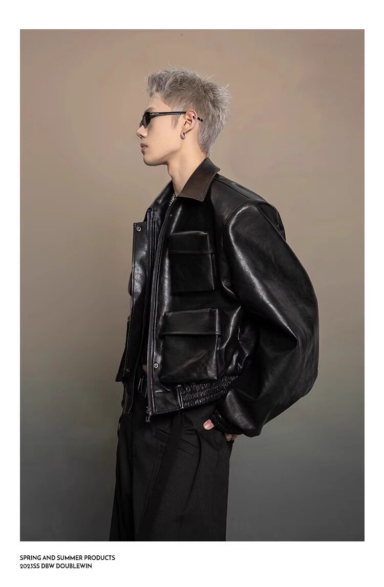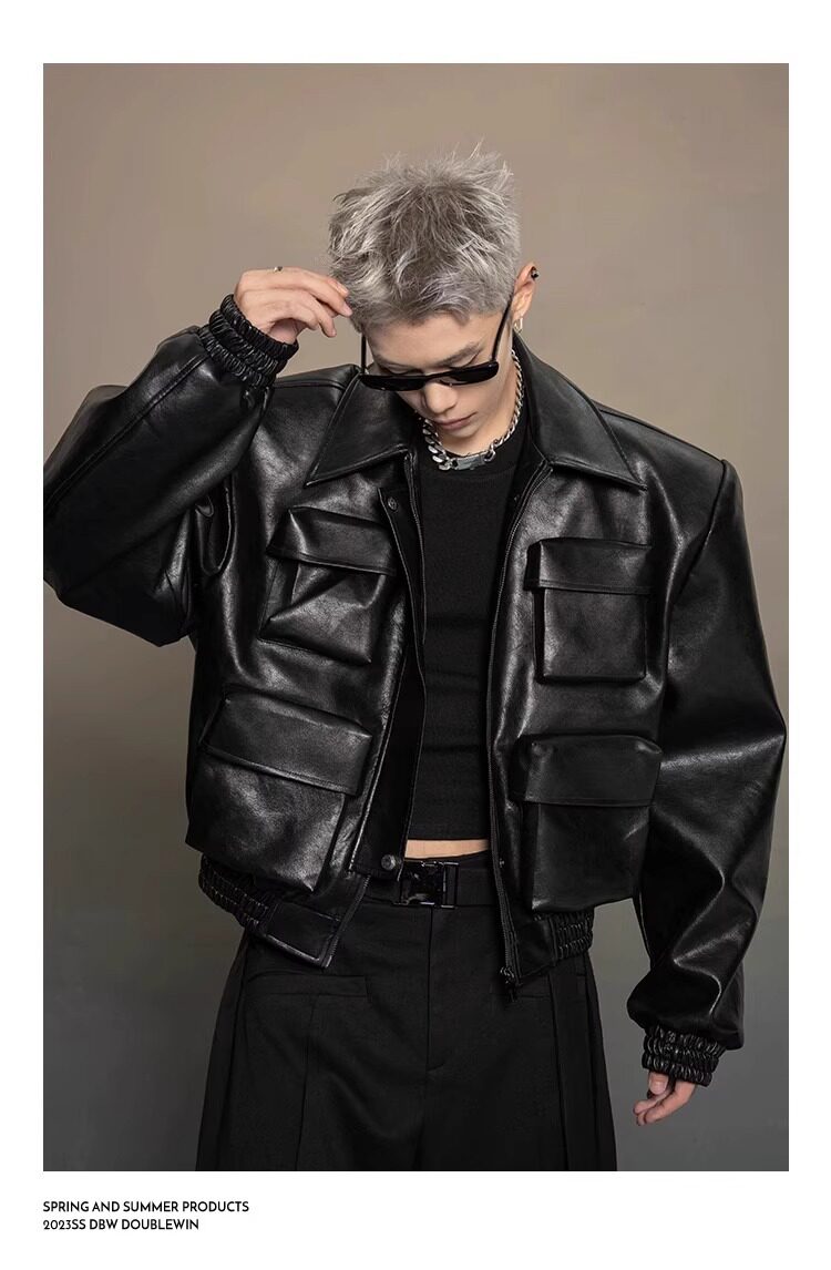 American-Style Dark Silhouette Short Leather Jacket for Men and Women, Casual Lapel, Cool and Trendy Biker Leather Jacket Top