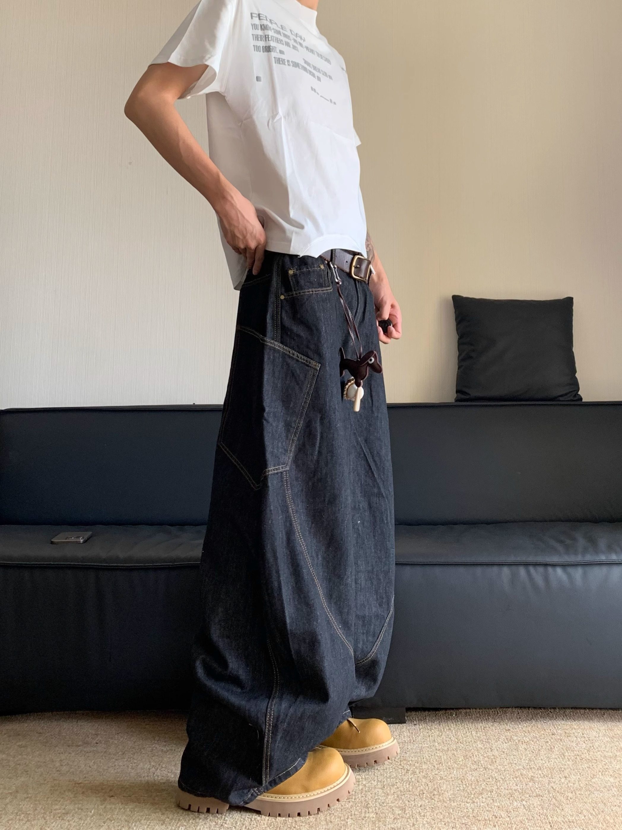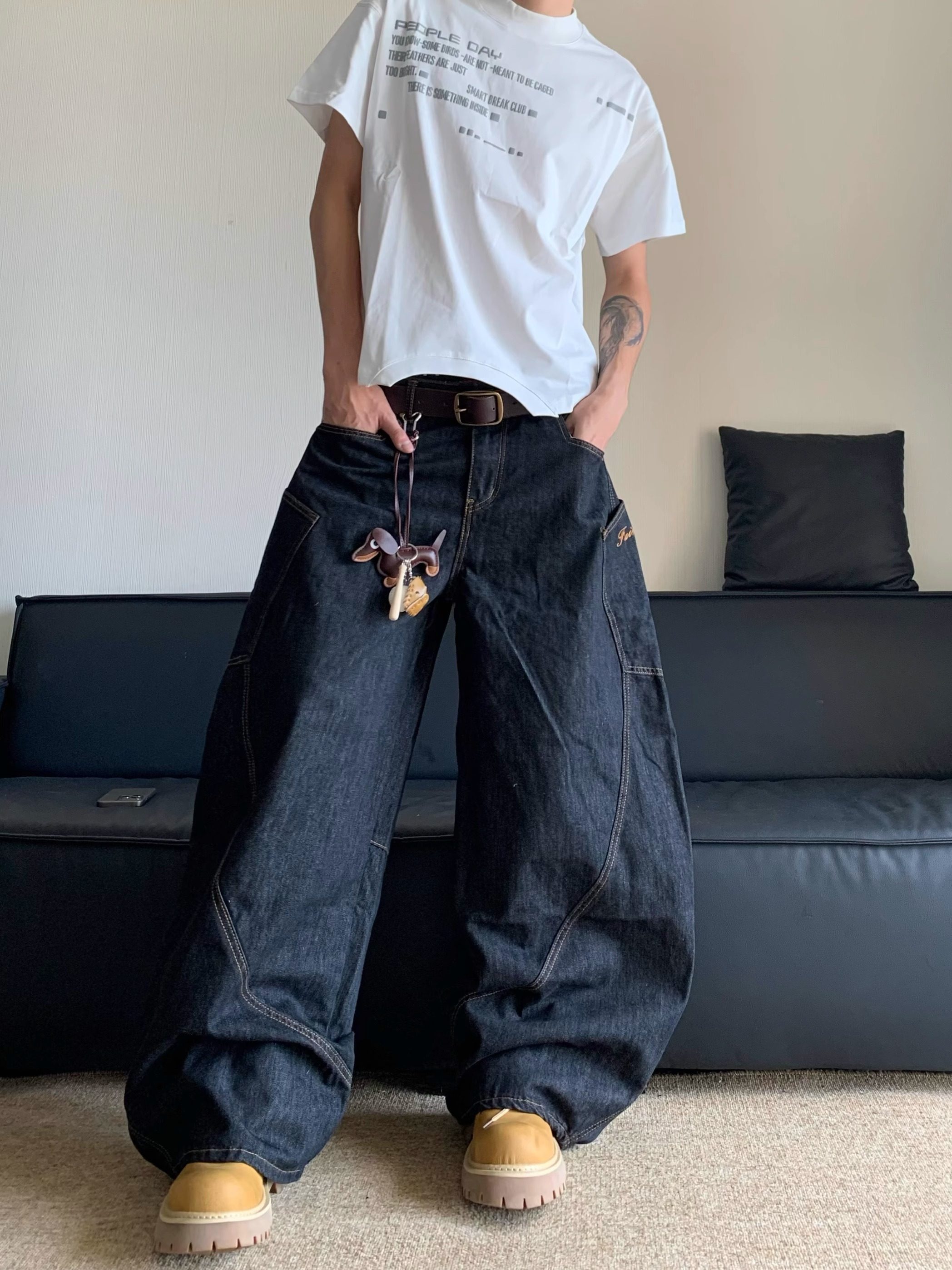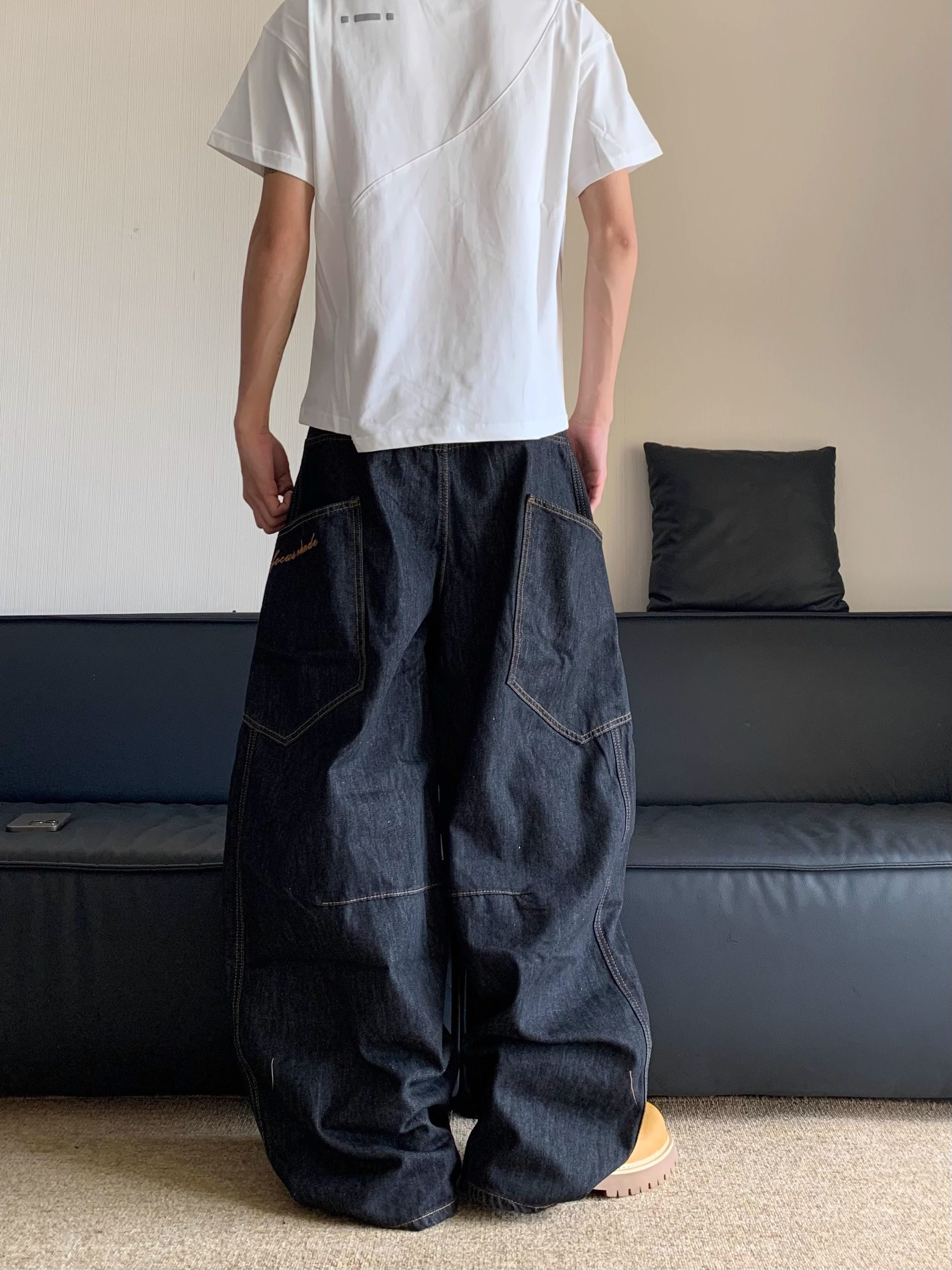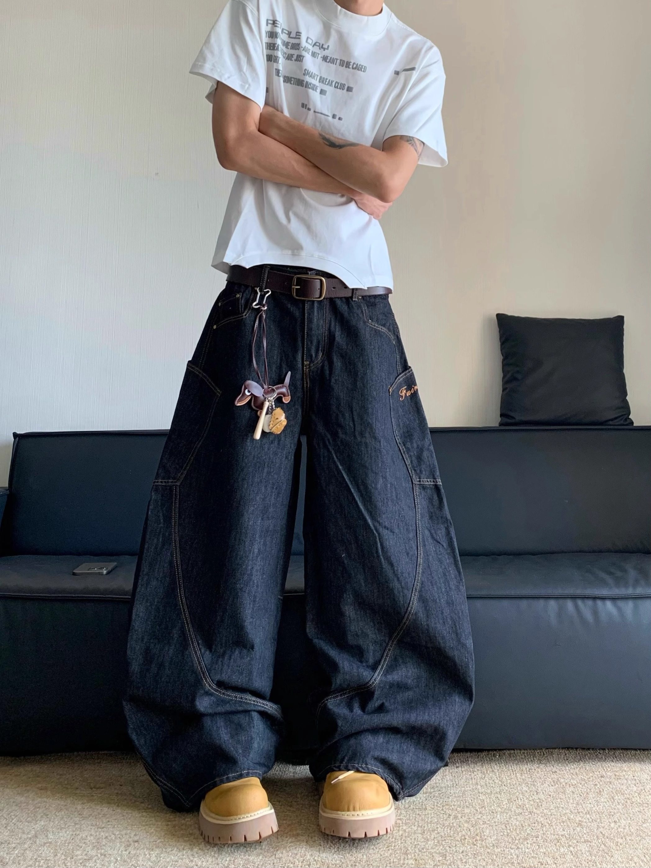 American Street Style Scimitar Design Large Pocket Patchwork Jeans Unisex Loose Retro Embroidered Baggy Wide-Leg Pants