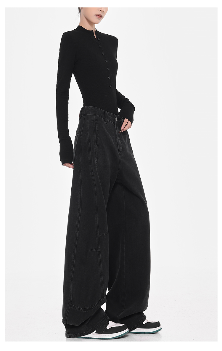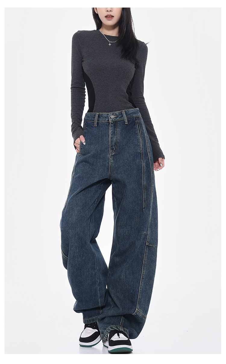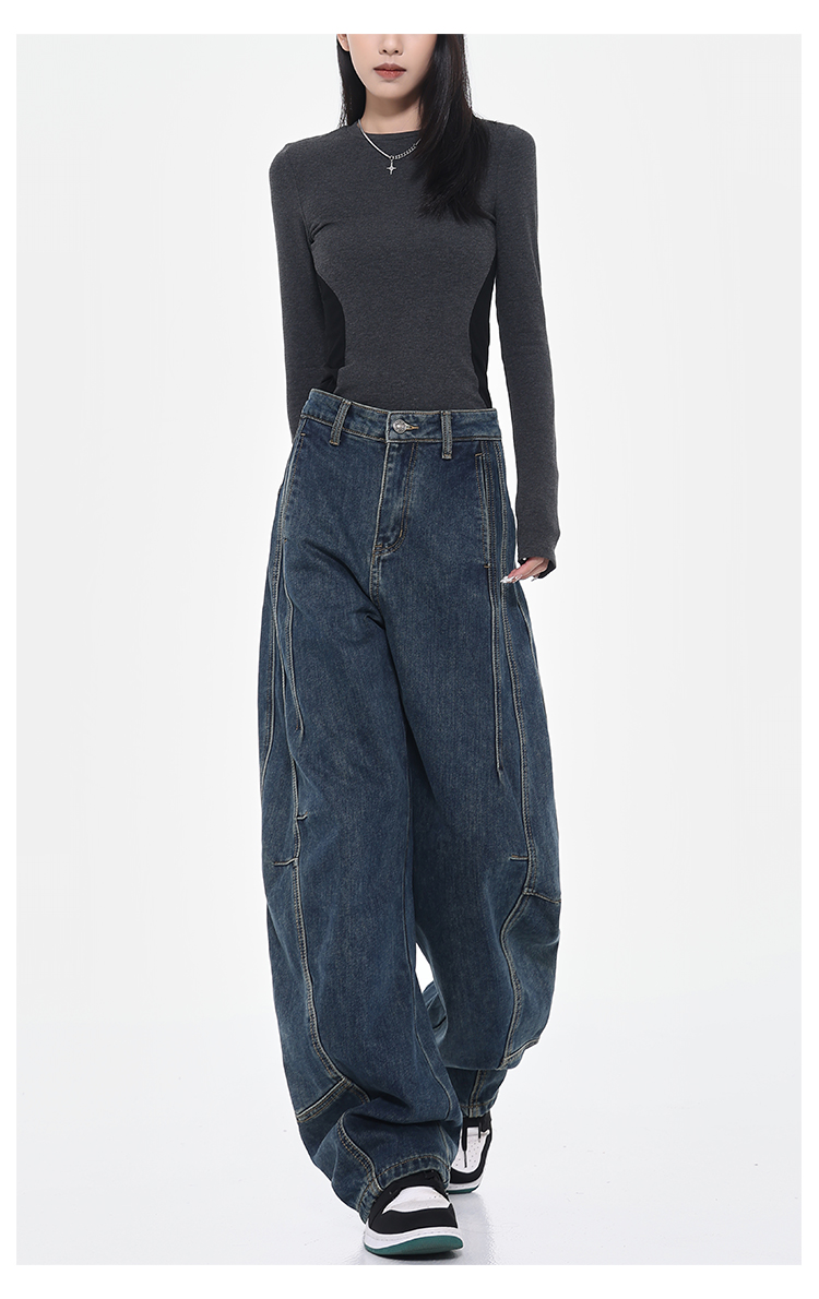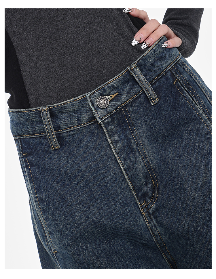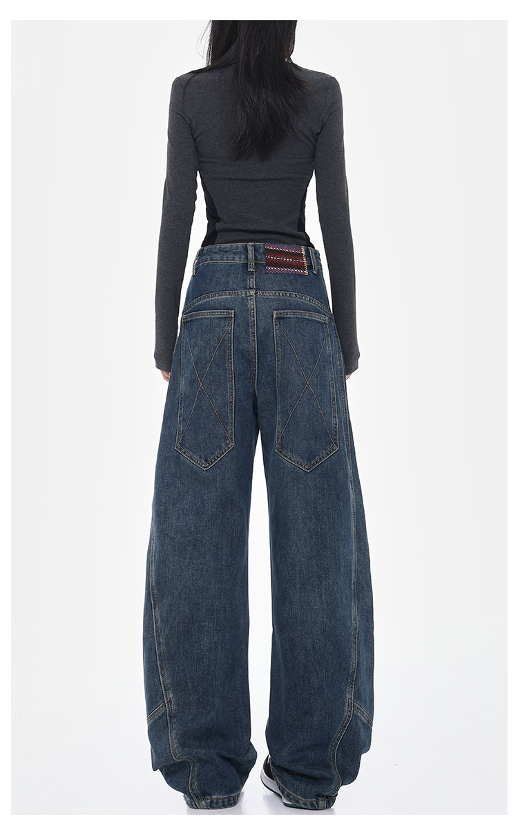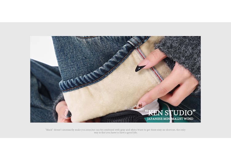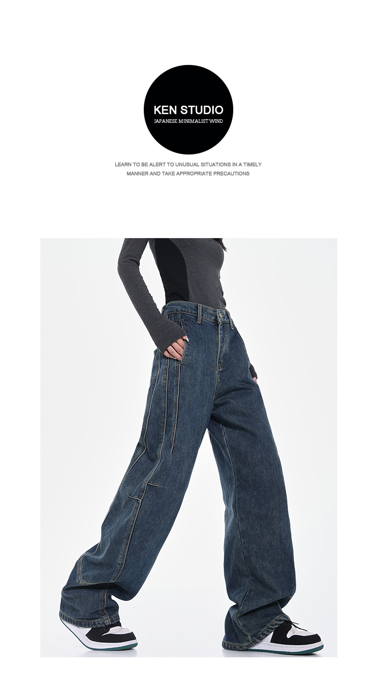 Ken Studio Autumn and Winter Fleece-Lined High-Street Design Scimitar Jeans for Women, Loose Wide-Leg Banana Pants, Sickle Pants