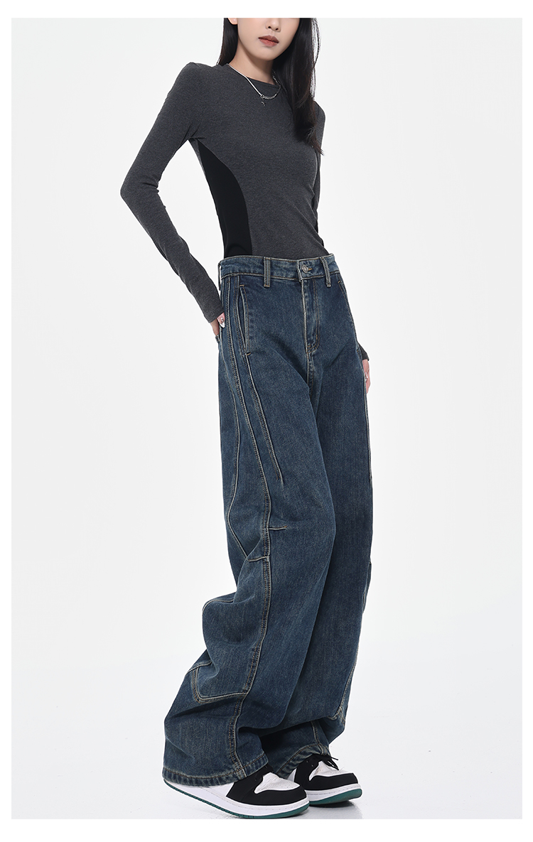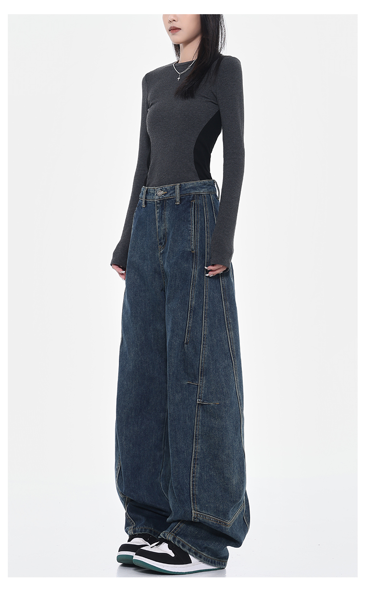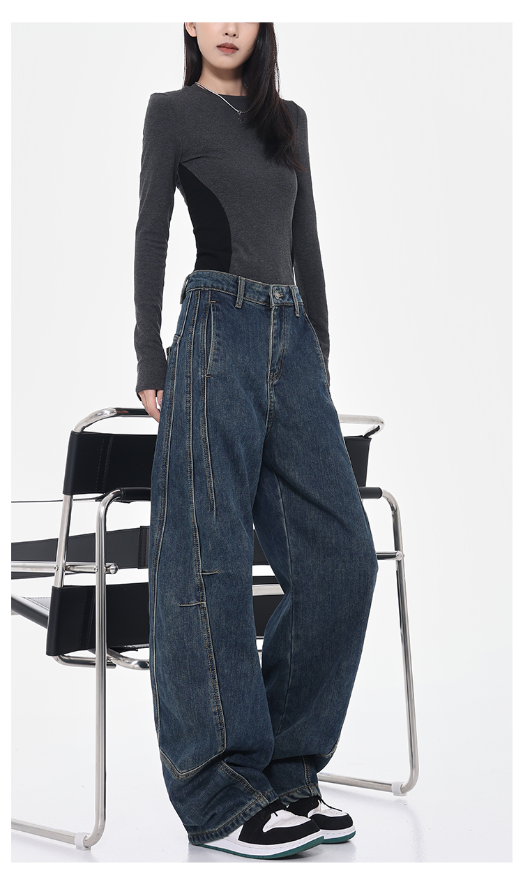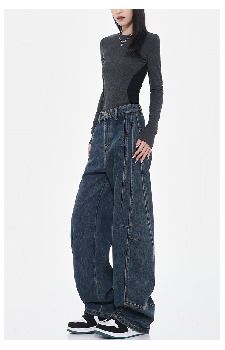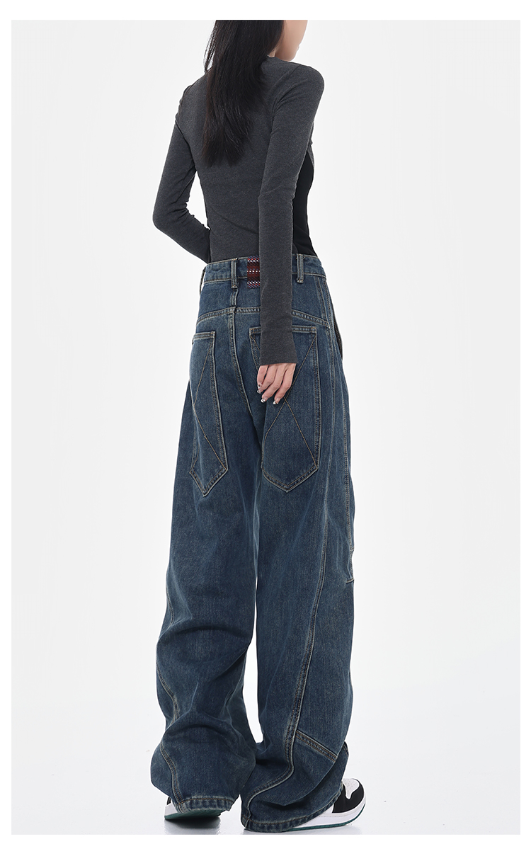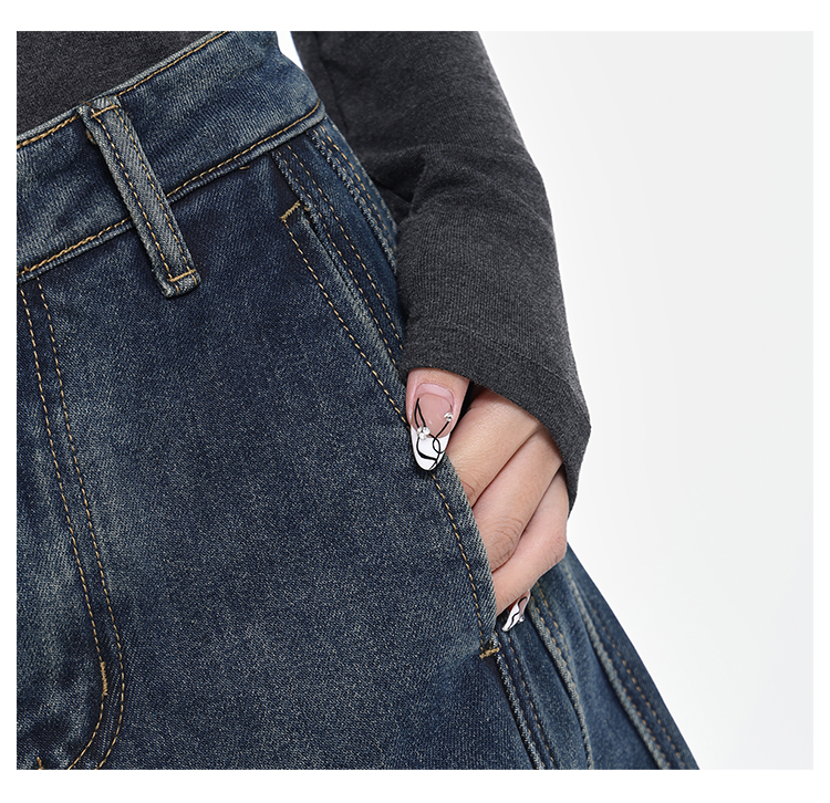 Ken Studio Autumn and Winter Fleece-Lined High-Street Design Scimitar Jeans for Women, Loose Wide-Leg Banana Pants, Sickle Pants