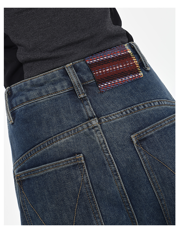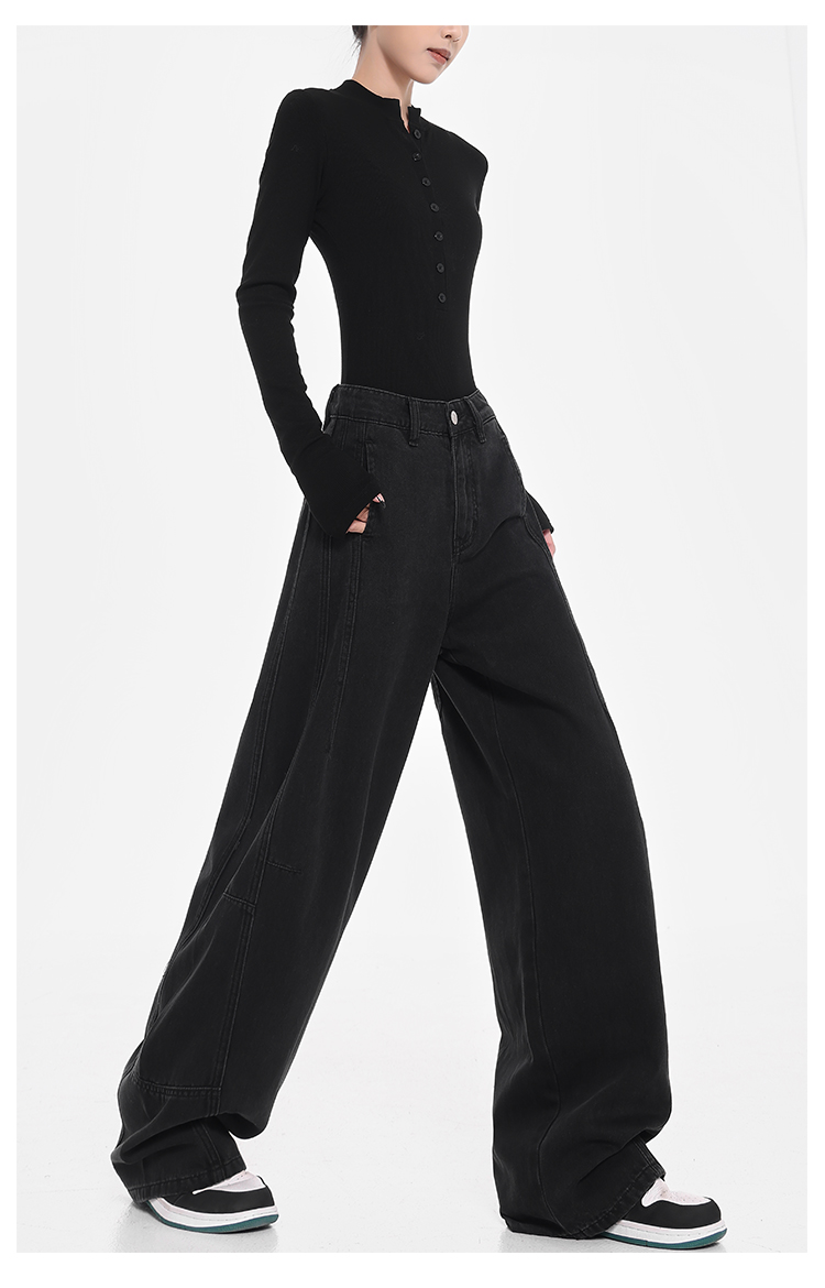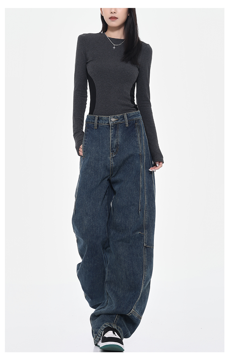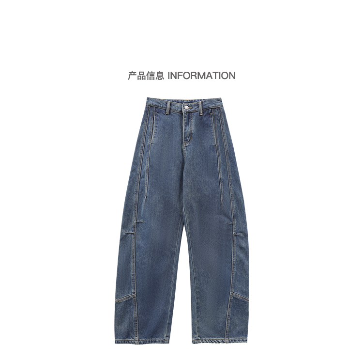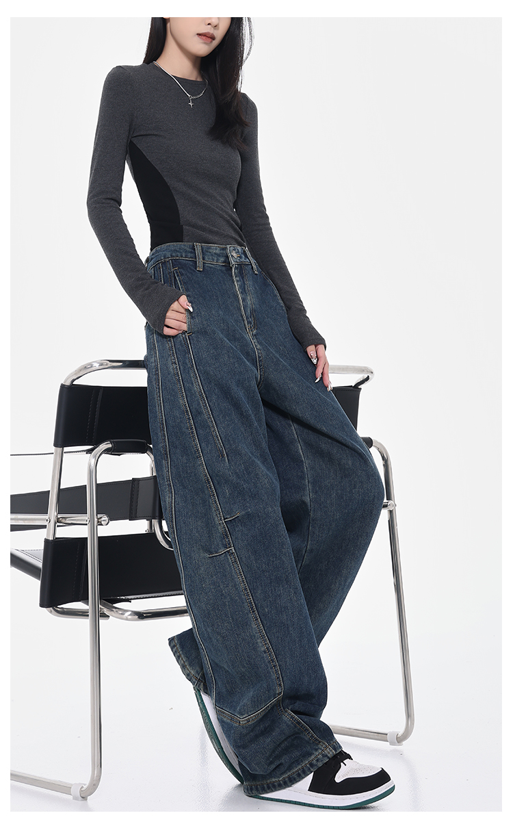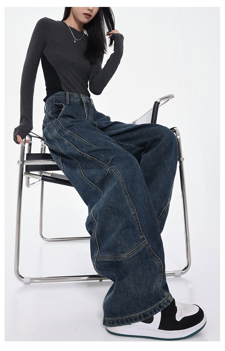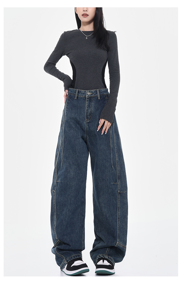 Ken Studio Autumn and Winter Fleece-Lined High-Street Design Scimitar Jeans for Women, Loose Wide-Leg Banana Pants, Sickle Pants