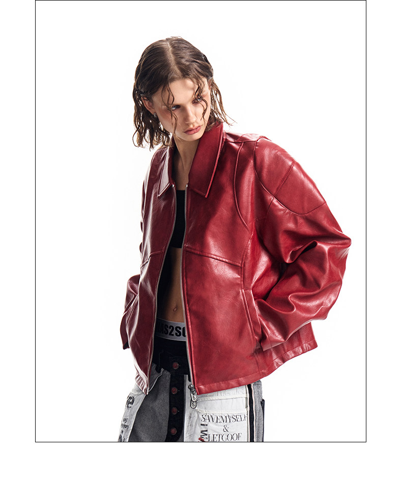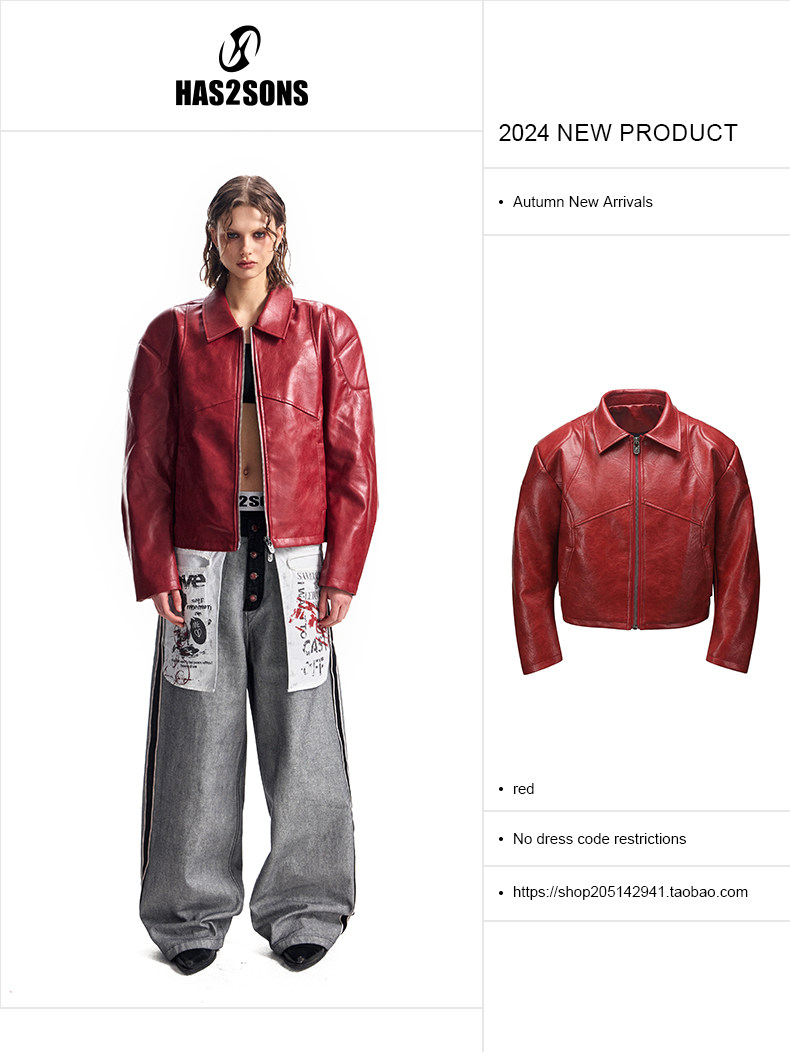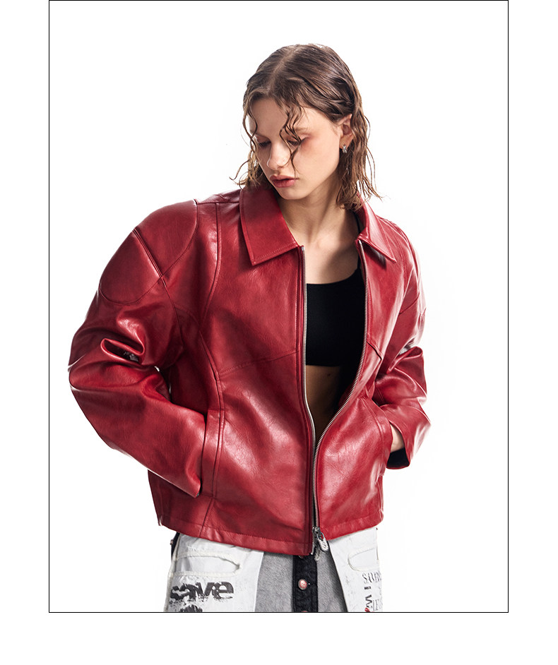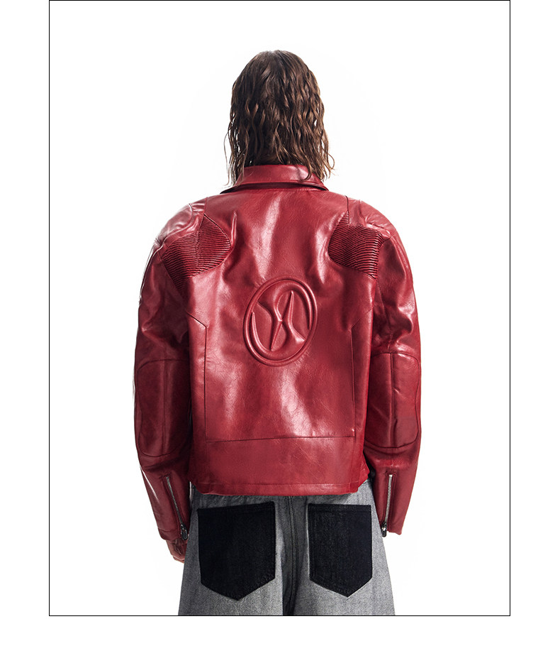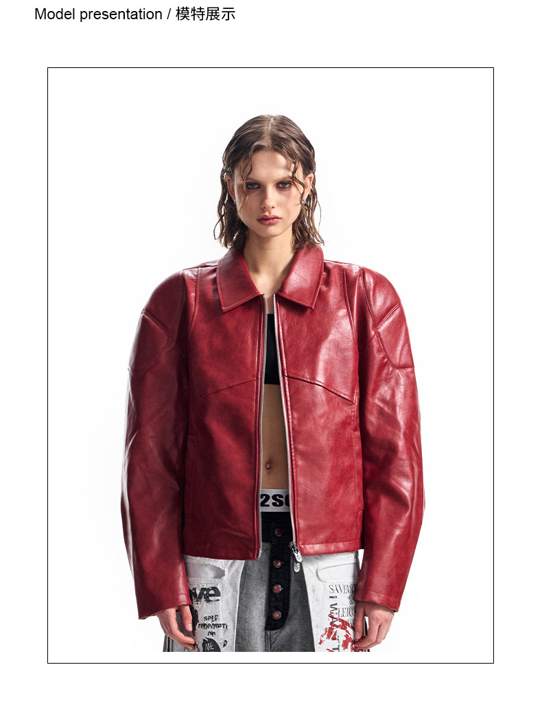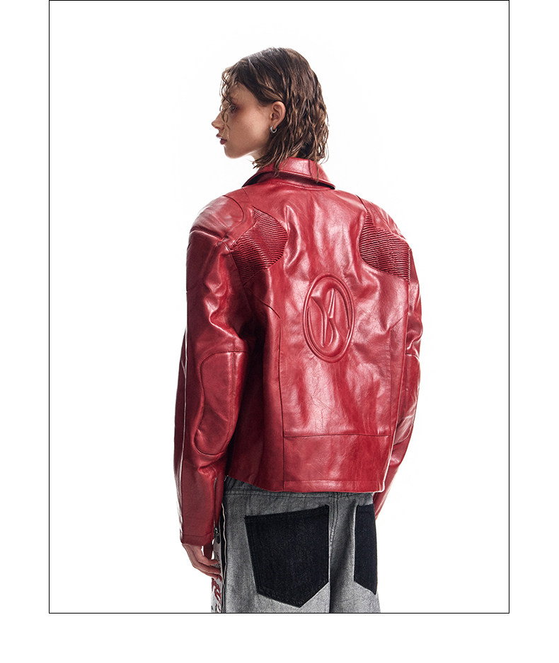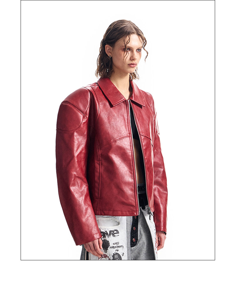 Has2Sons Red Scimitar Sleeve Pu Leather Jacket Washed Silhouette Short Coat with Lapel Air Pressure 3D Filling Process