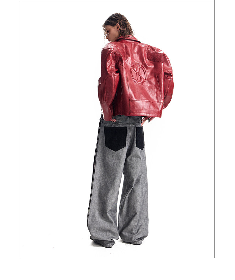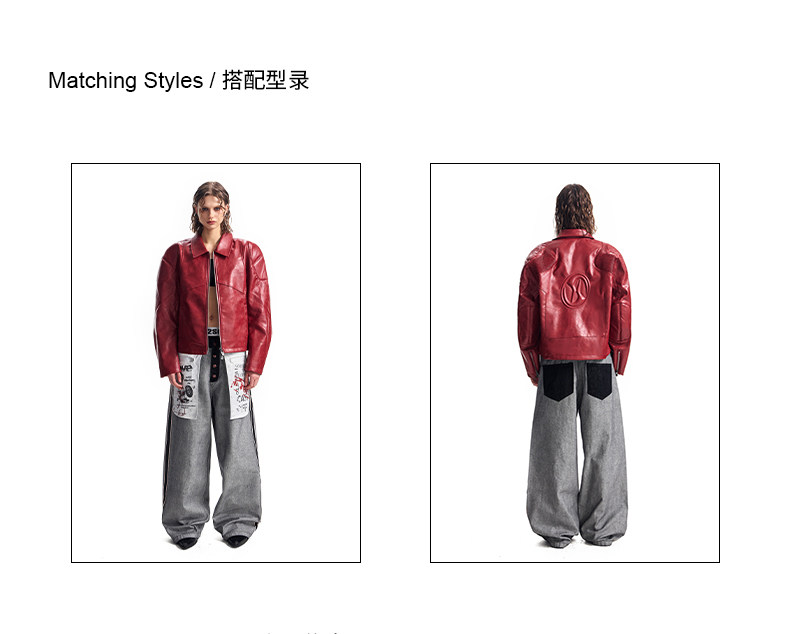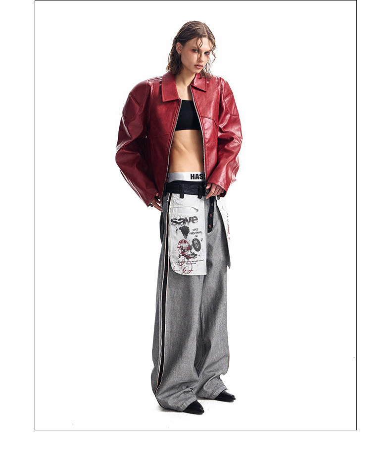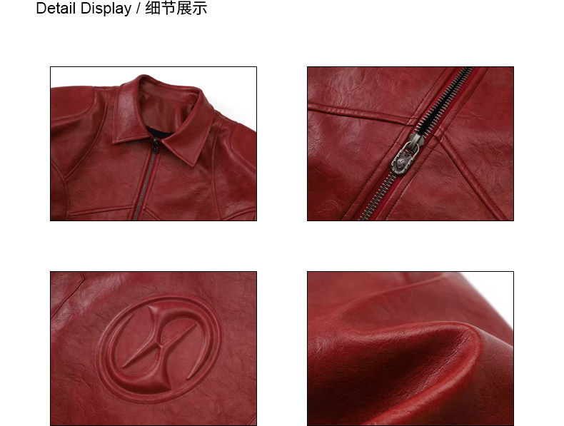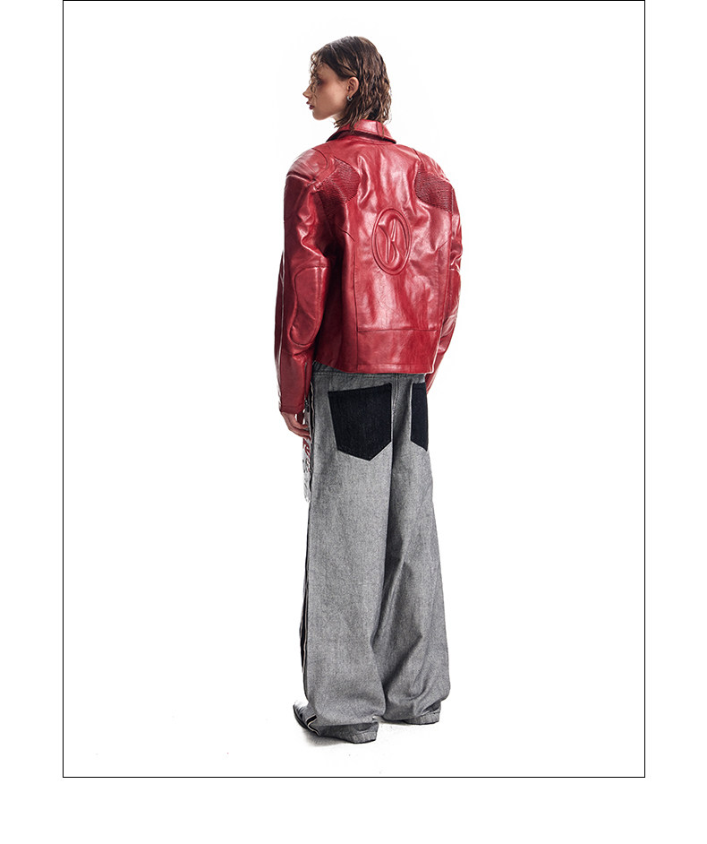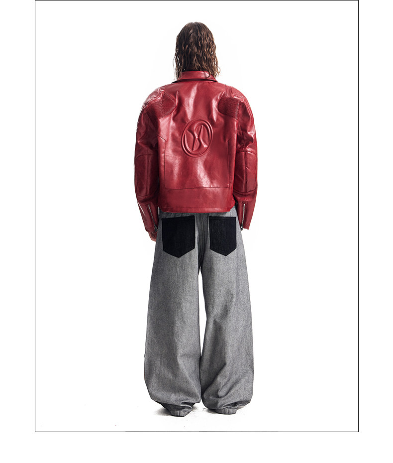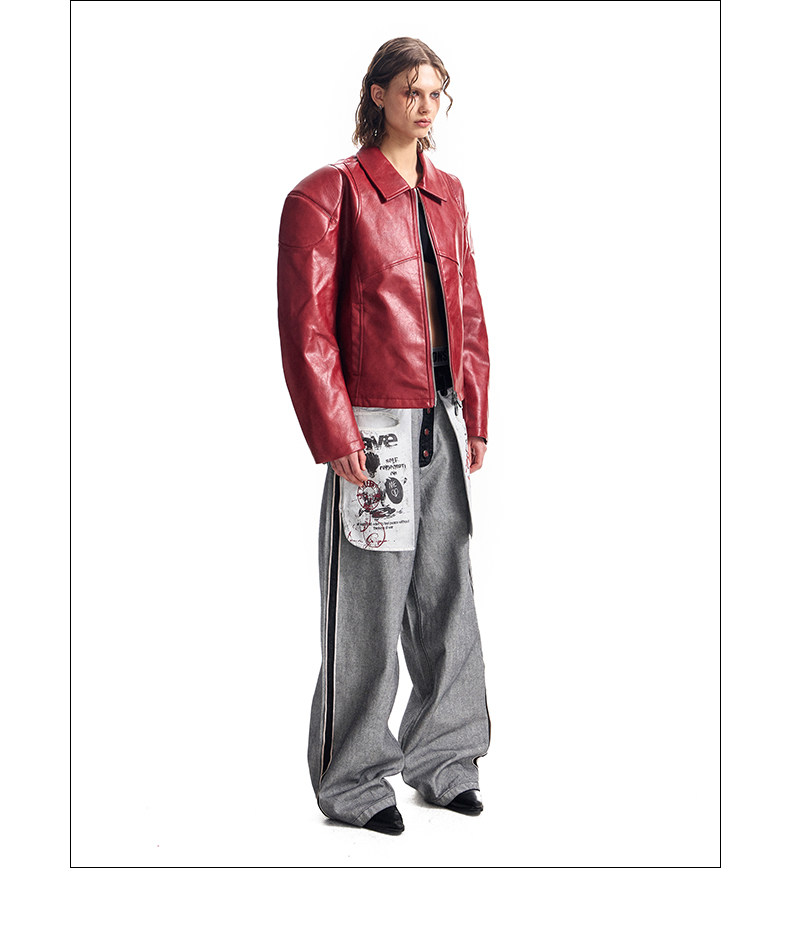 Has2Sons Red Scimitar Sleeve Pu Leather Jacket Washed Silhouette Short Coat with Lapel Air Pressure 3D Filling Process