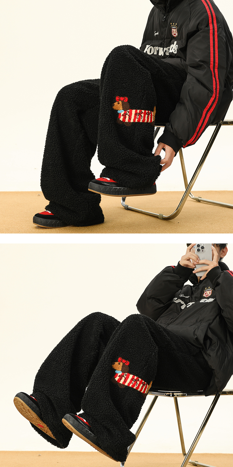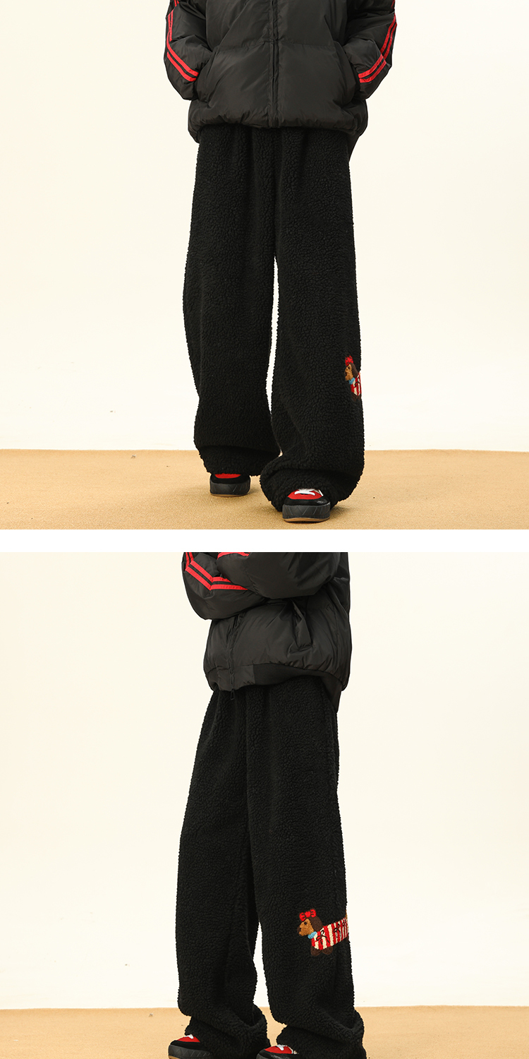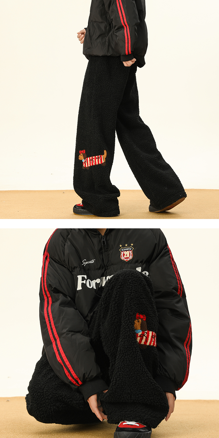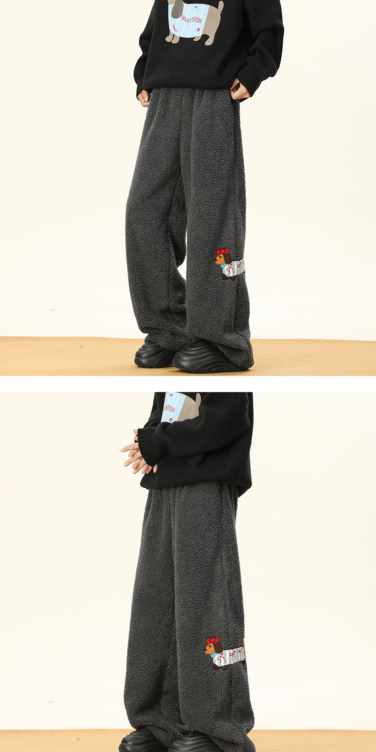 Bwka Dachshund Embroidered Lamb Velvet Warm Cotton Pants for Women and Men in Winter Fleece-Lined and Thickeneded Cold-Proof Wide-Leg Casual Pants