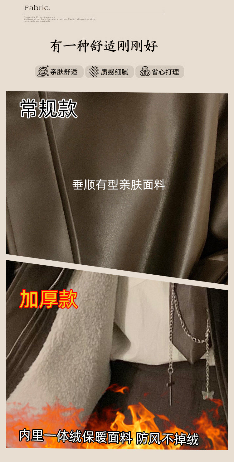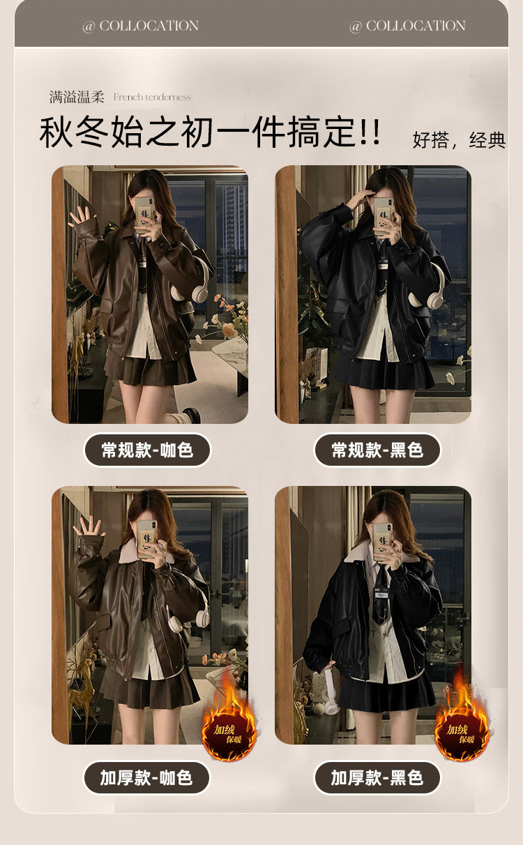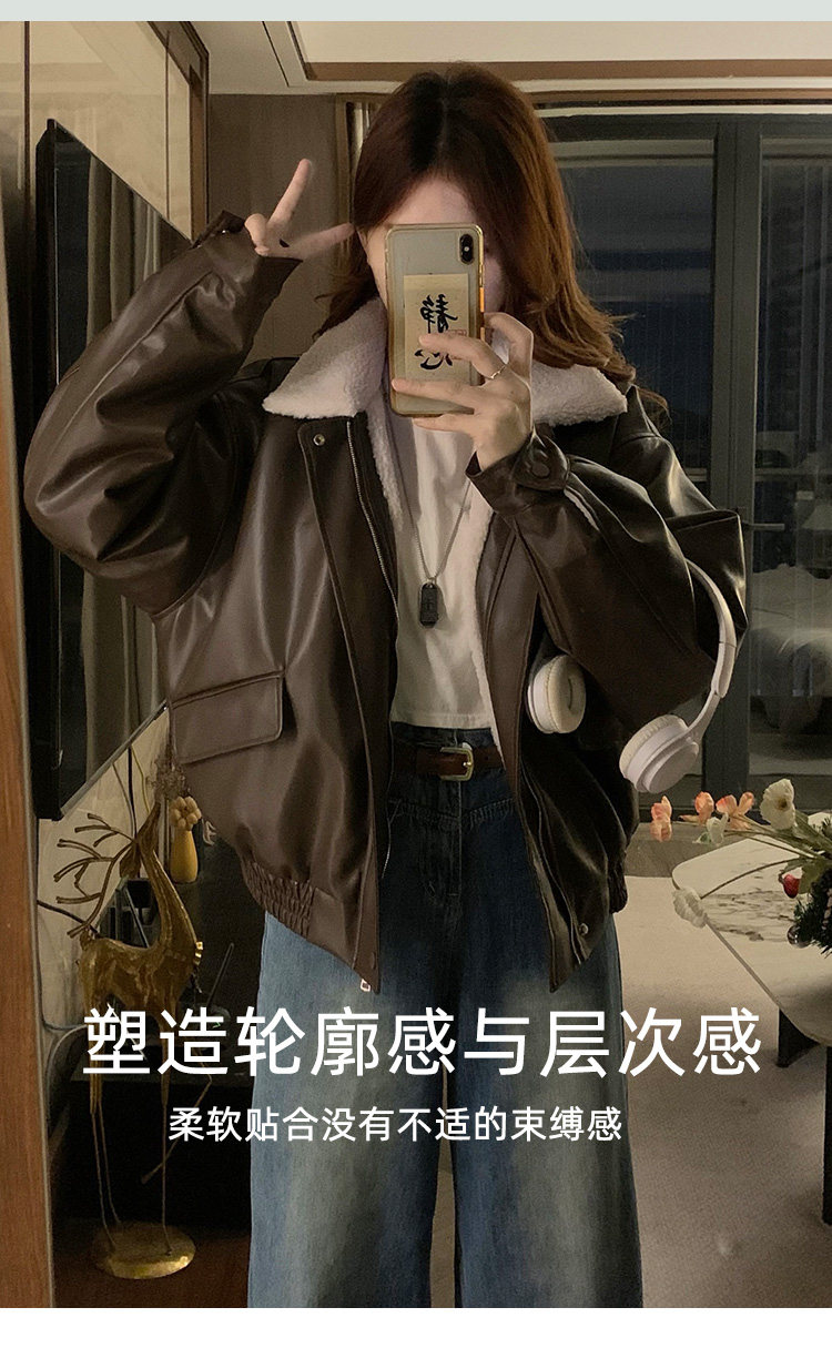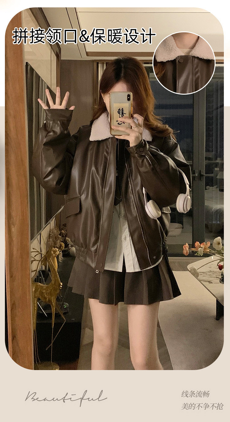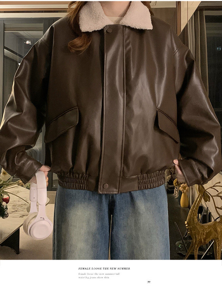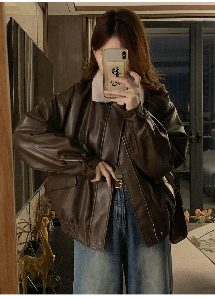 Maillard Brown Motorcycle Pu Leather Jacket with Fleece Lining, Thickened Coat for Women, Winter 2025, American Retro Loose Cotton Coat