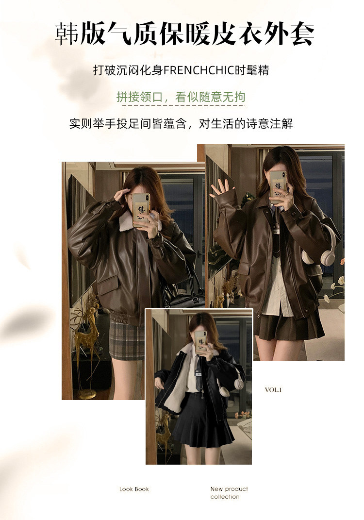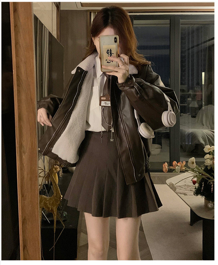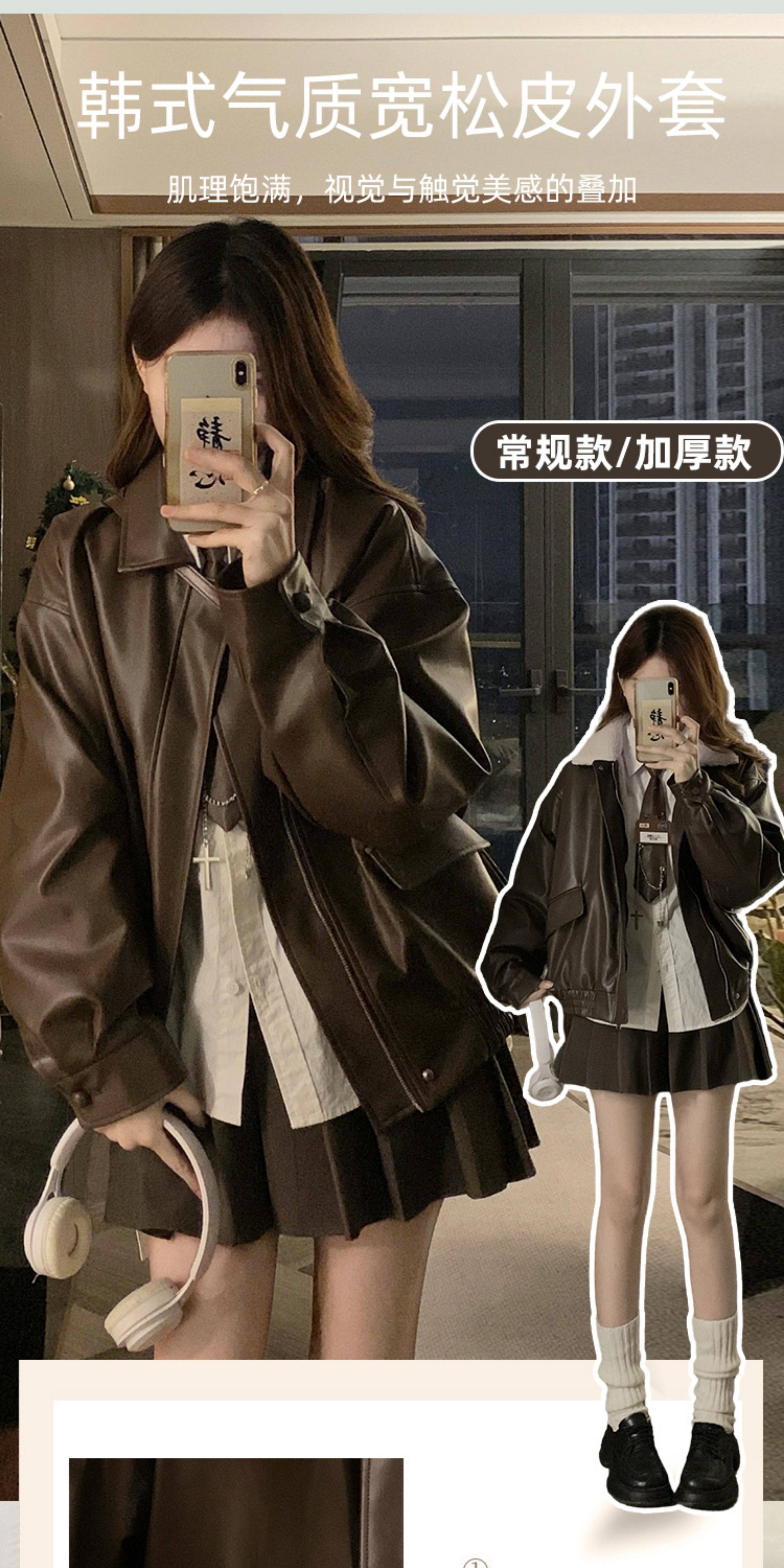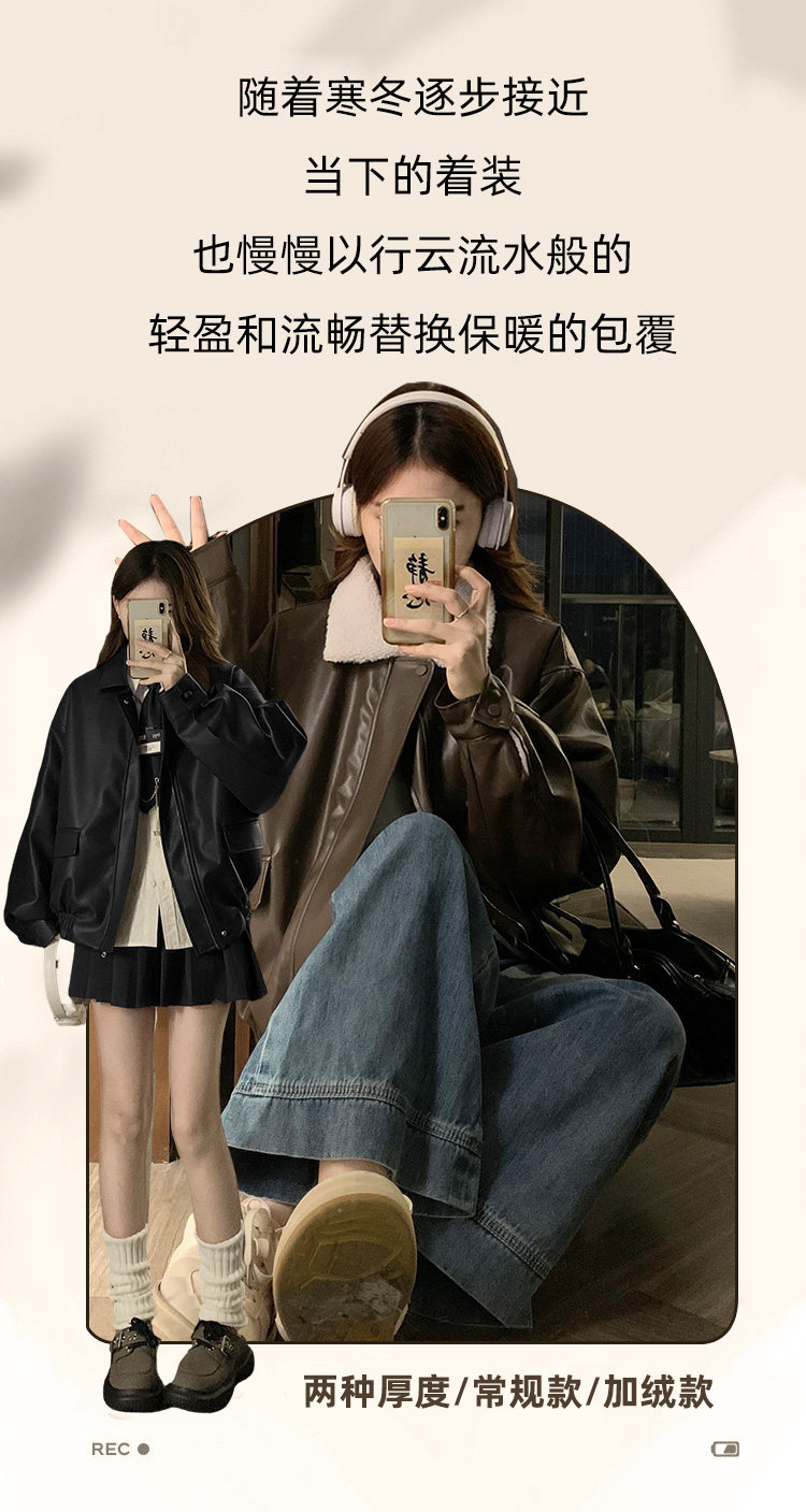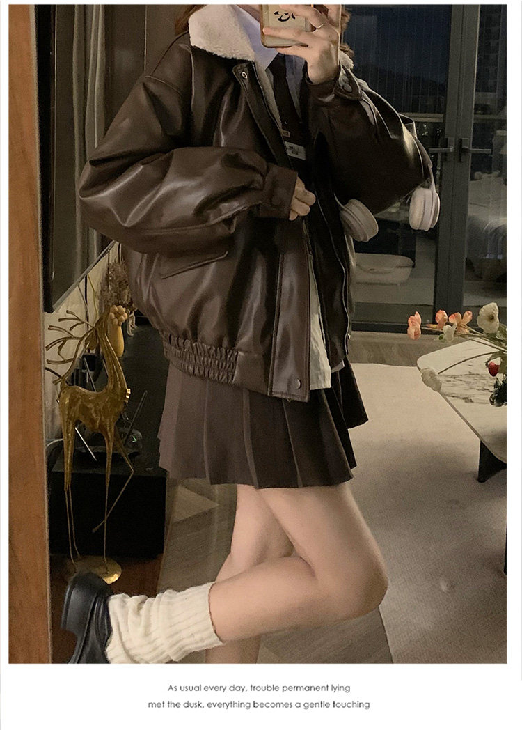 Maillard Brown Motorcycle Pu Leather Jacket with Fleece Lining, Thickened Coat for Women, Winter 2025, American Retro Loose Cotton Coat