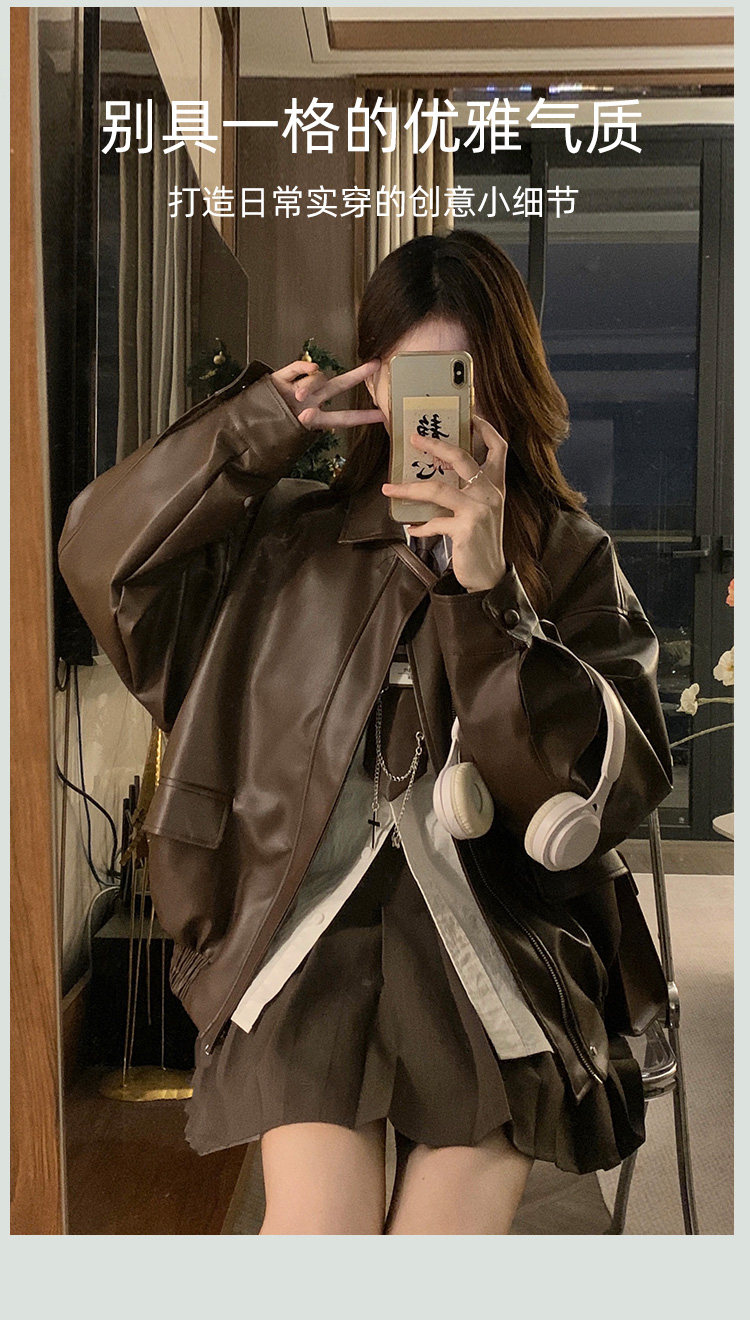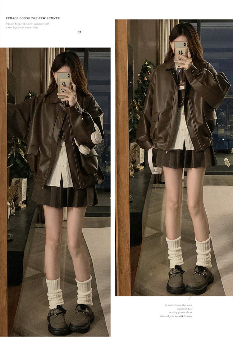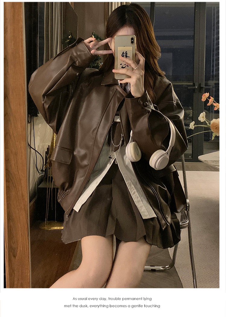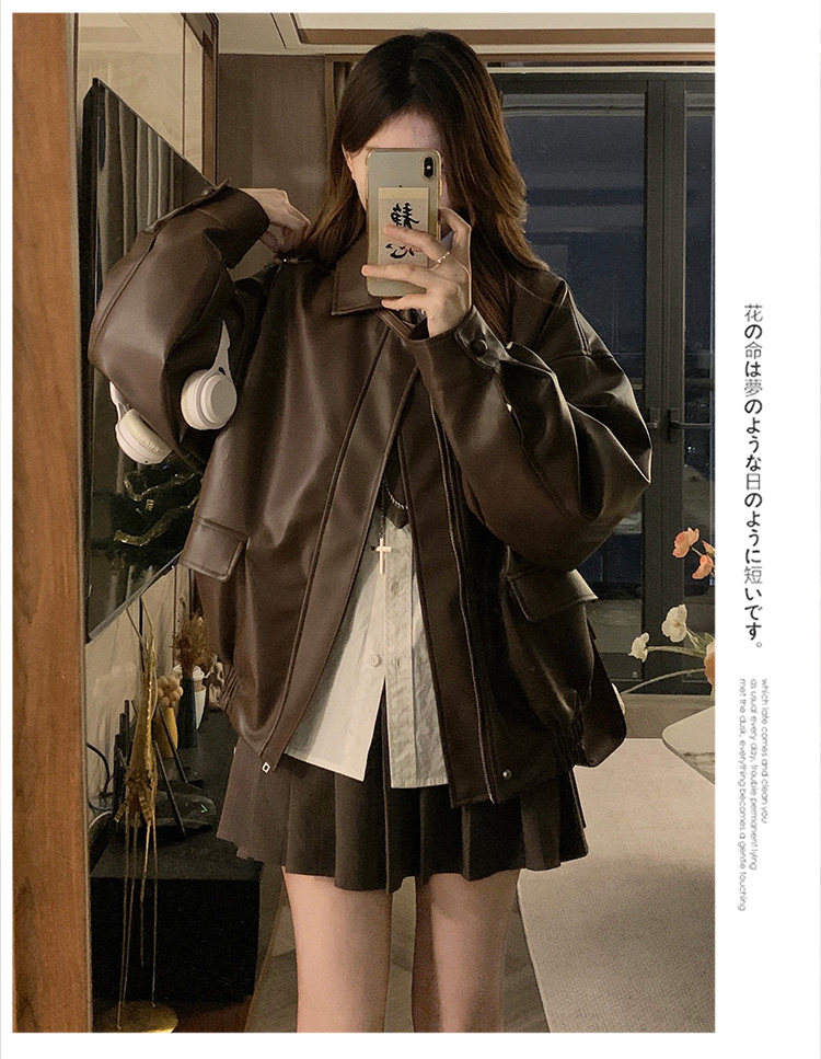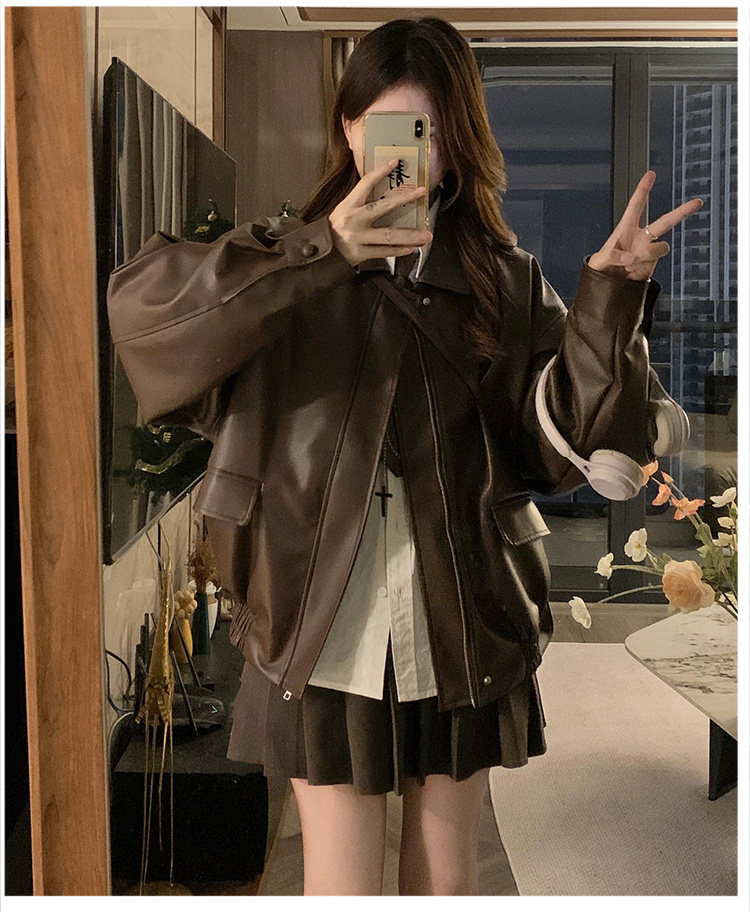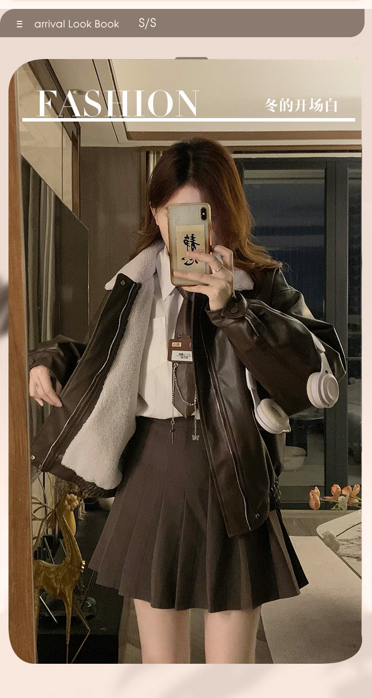 Maillard Brown Motorcycle Pu Leather Jacket with Fleece Lining, Thickened Coat for Women, Winter 2025, American Retro Loose Cotton Coat