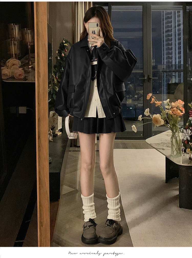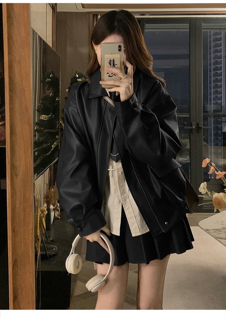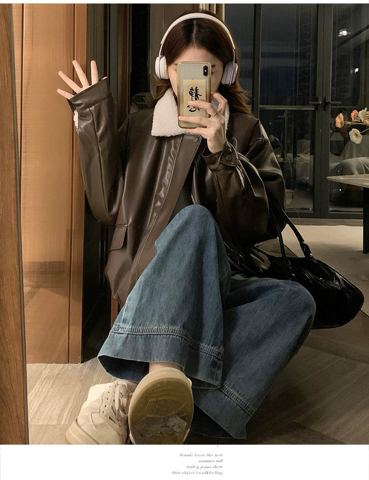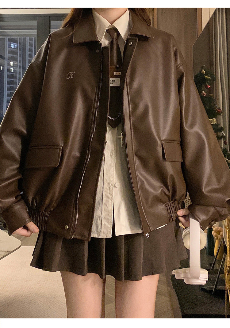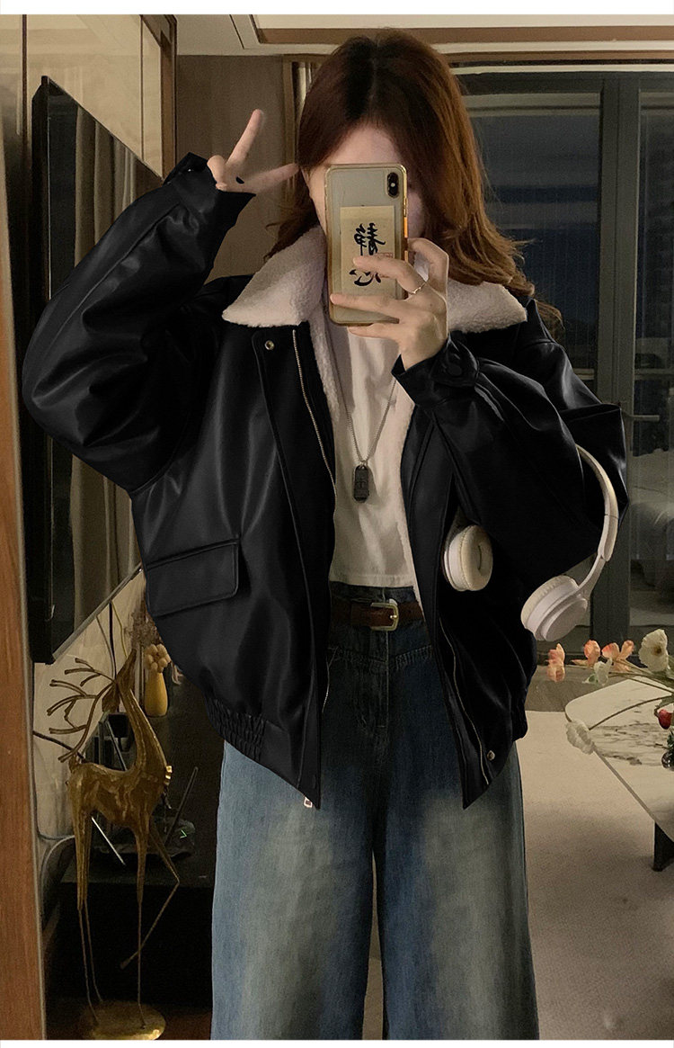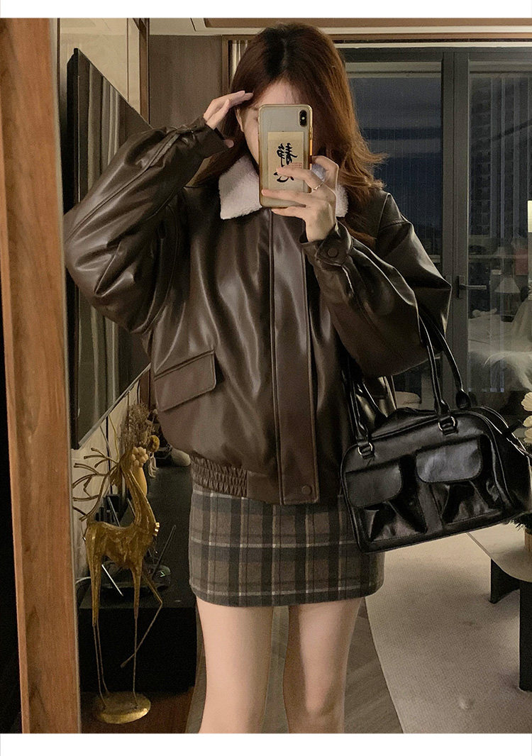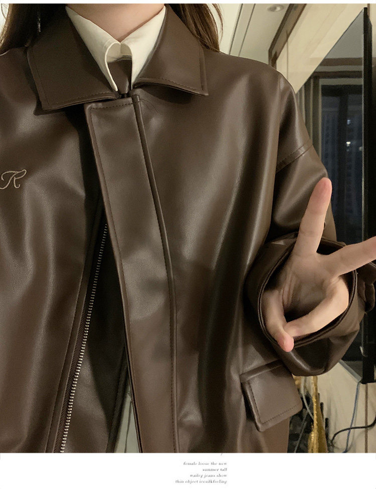 Maillard Brown Motorcycle Pu Leather Jacket with Fleece Lining, Thickened Coat for Women, Winter 2025, American Retro Loose Cotton Coat