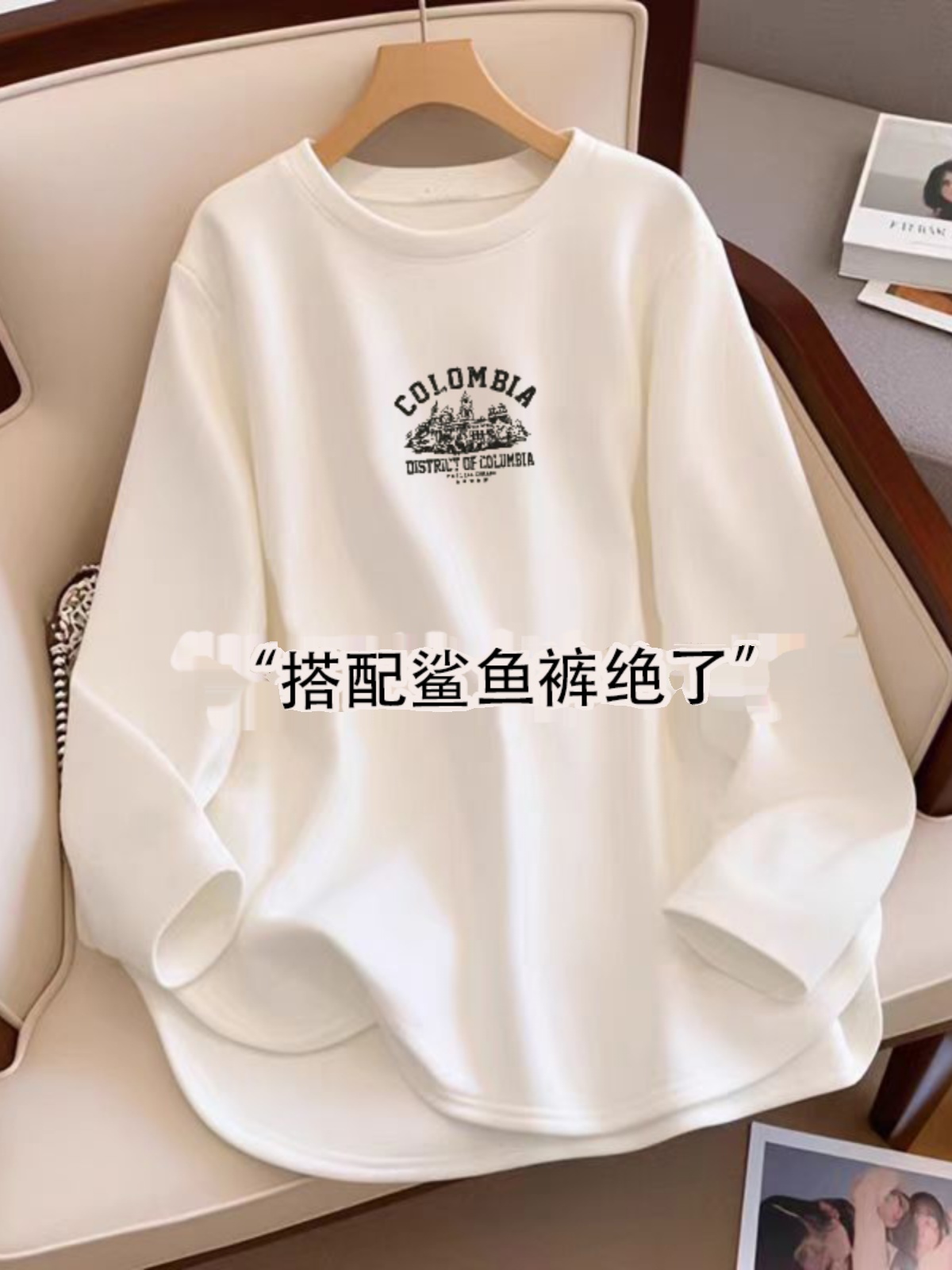 European-Style White Fleece-Lined Long-Sleeve Base Shirt for Women, 2025 Autumn and Winter New Loose Fit, Paired with Shark Pants, Trendy Top