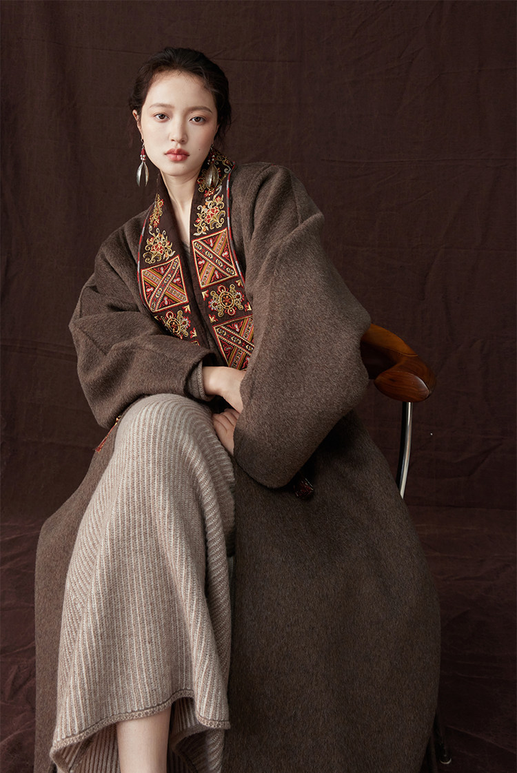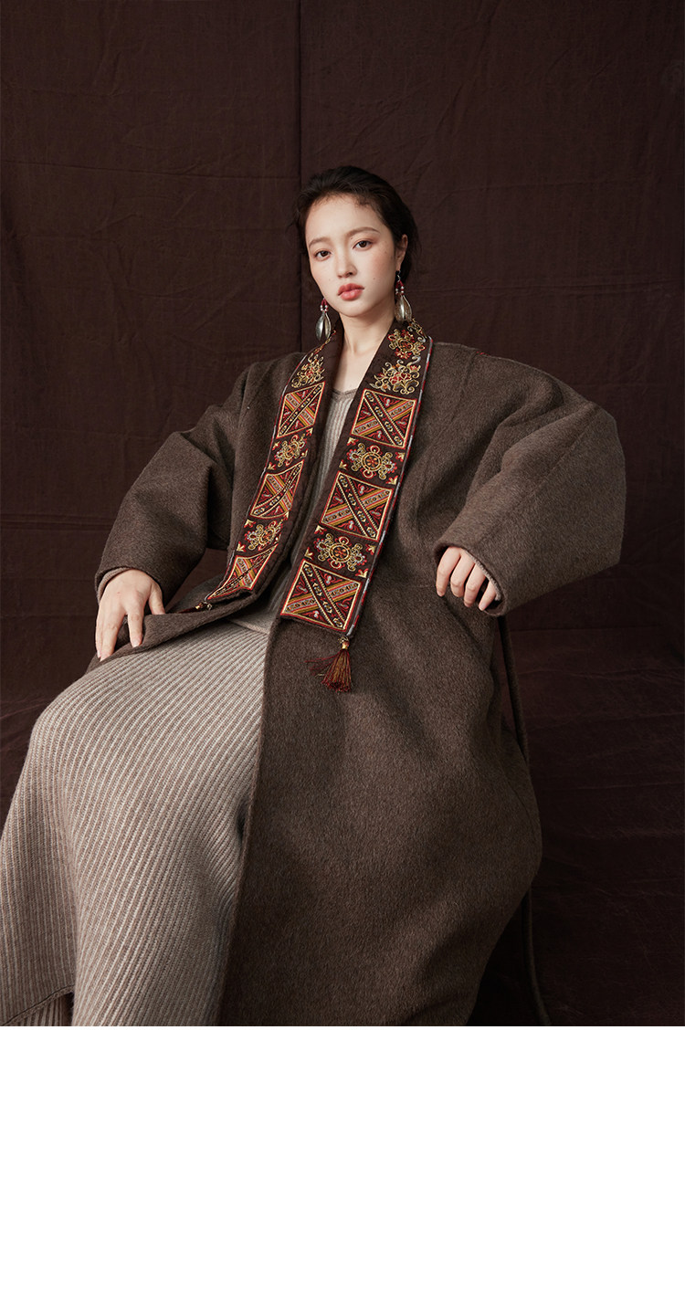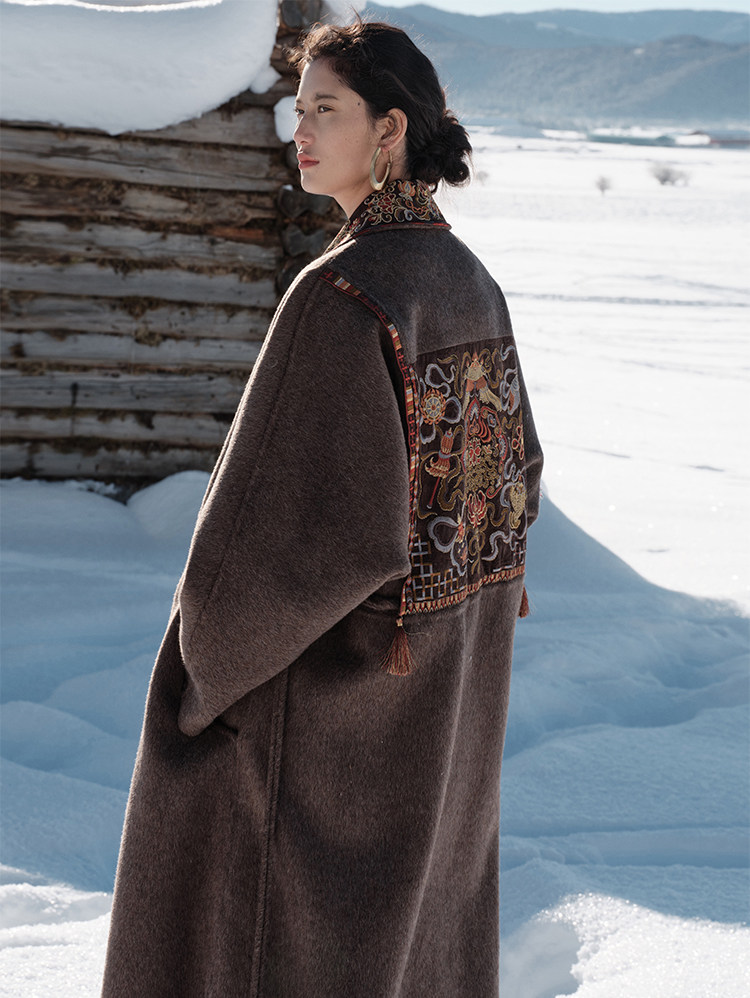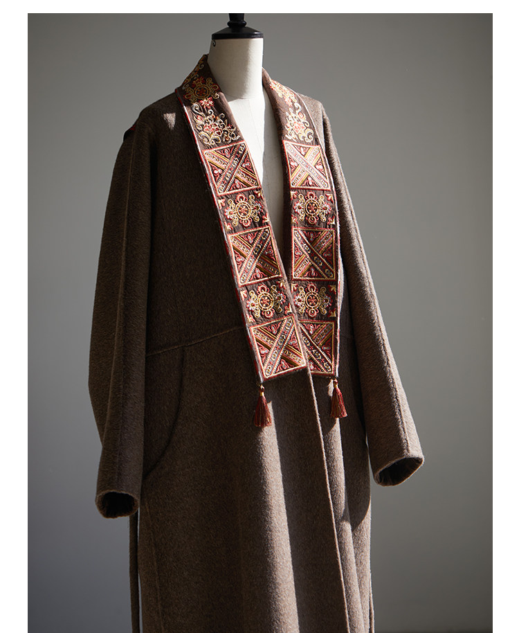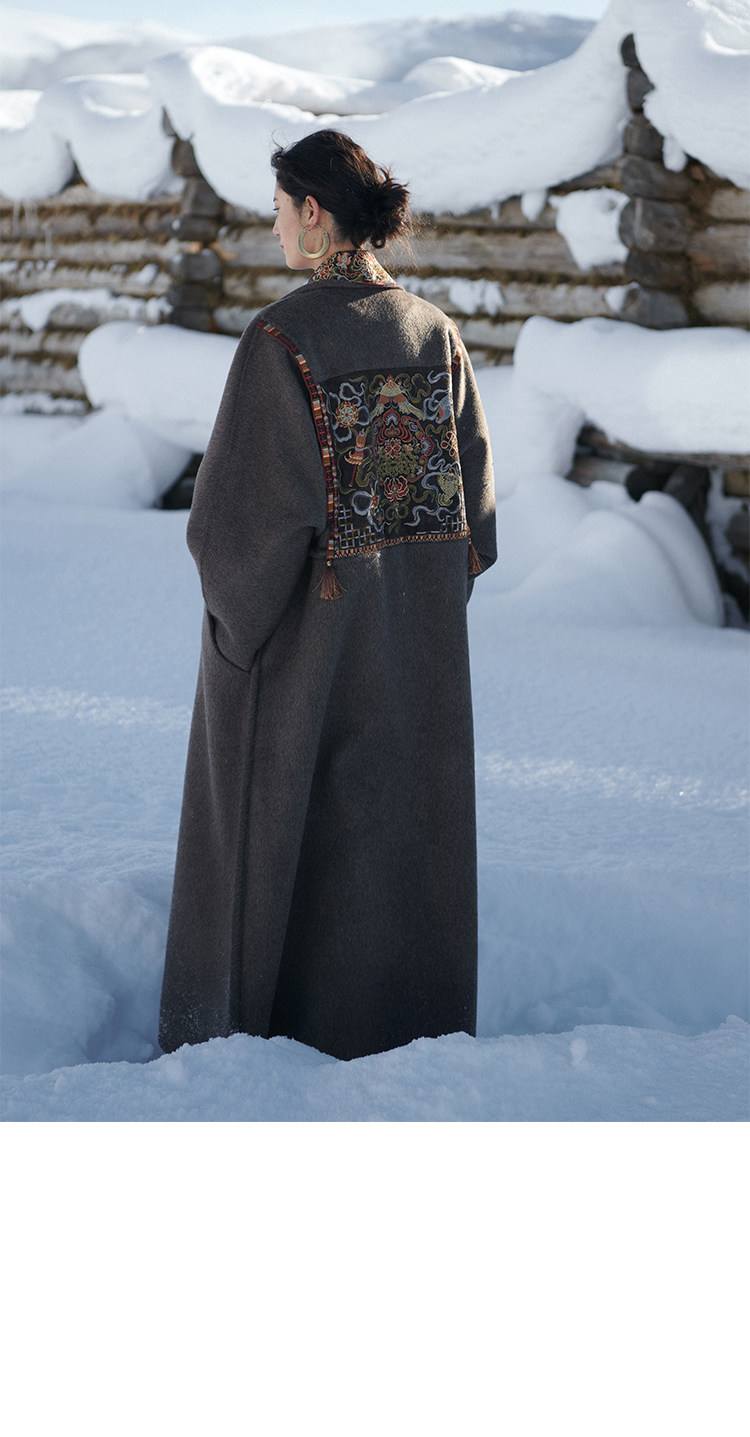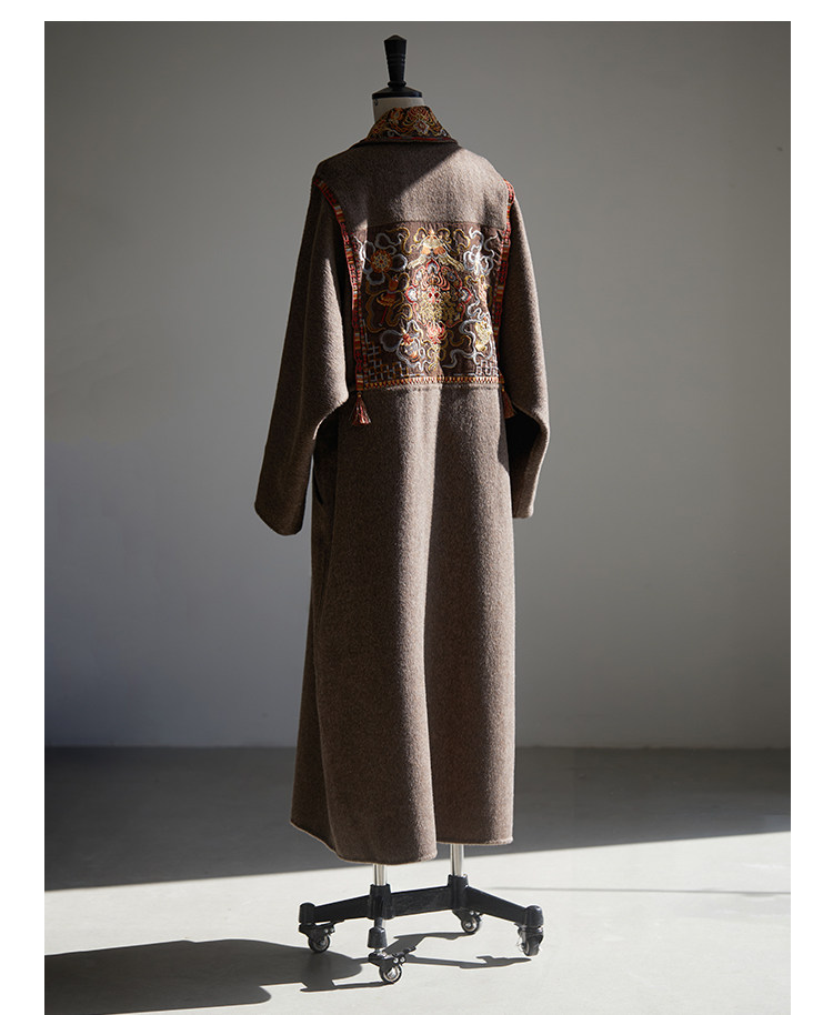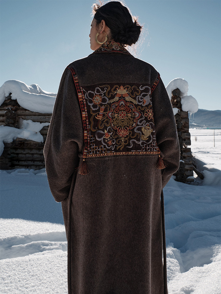 Tibetan Style Embroidery | Wool and Mulberry Silk Handmade Double-Sided Woolen Long Coat