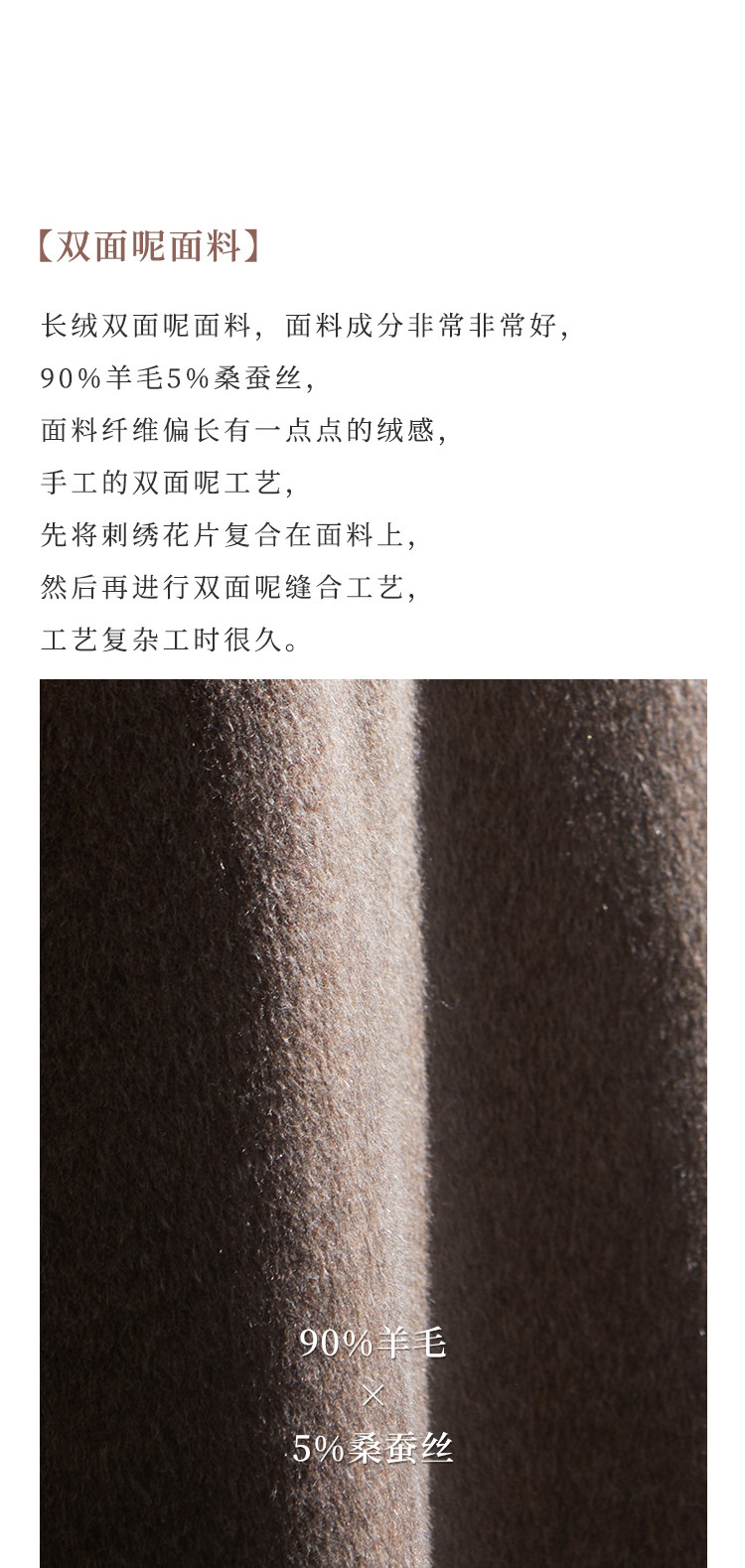 成分: 面料1:90%羊毛 5%桑蚕丝5%特种动物纤维 面料2:52%粘胶纤维43%莱赛尔纤维5%亚麻