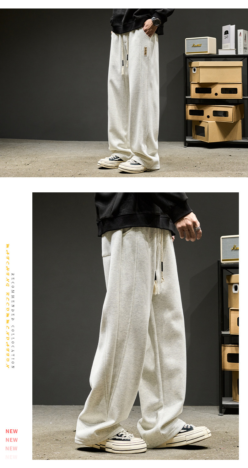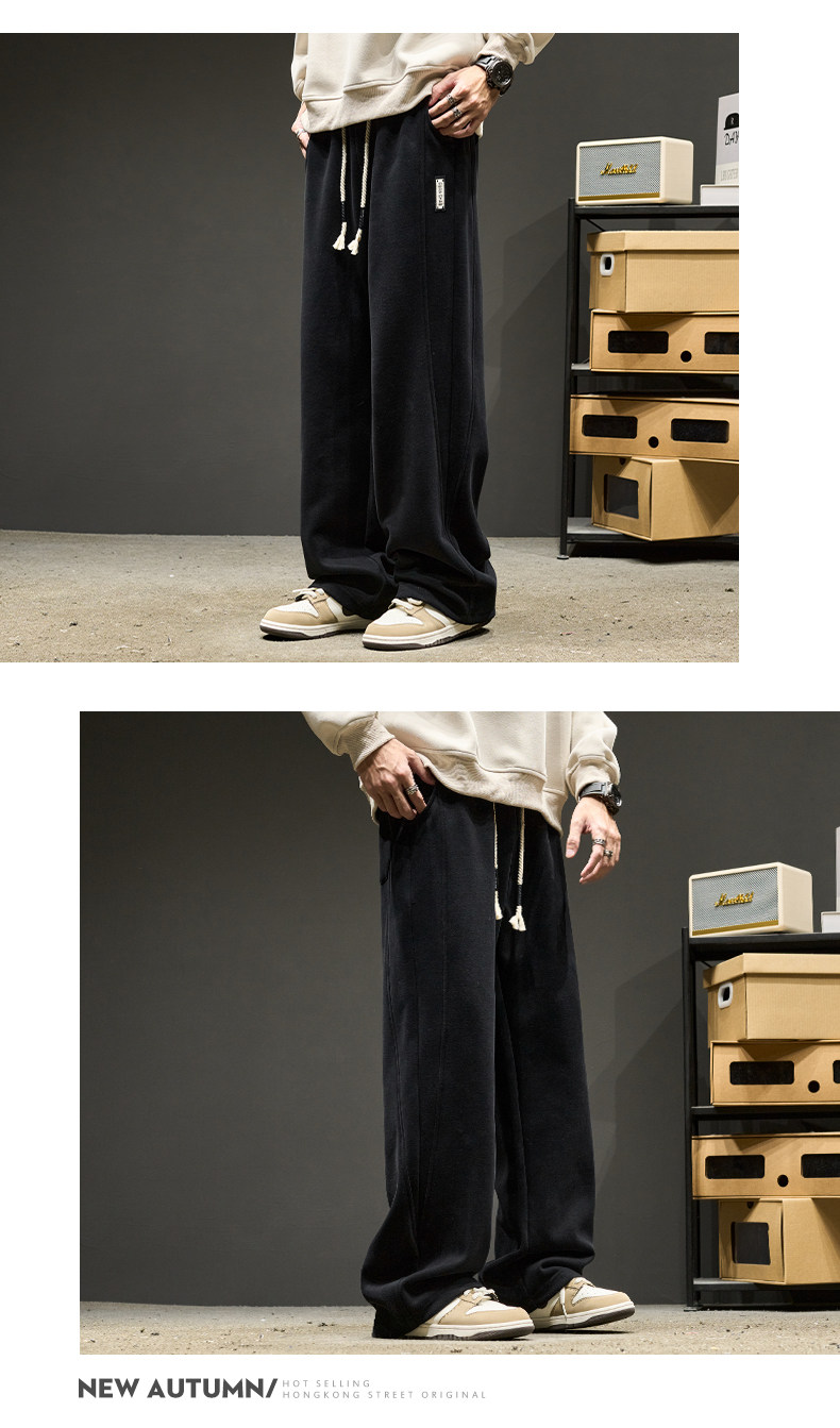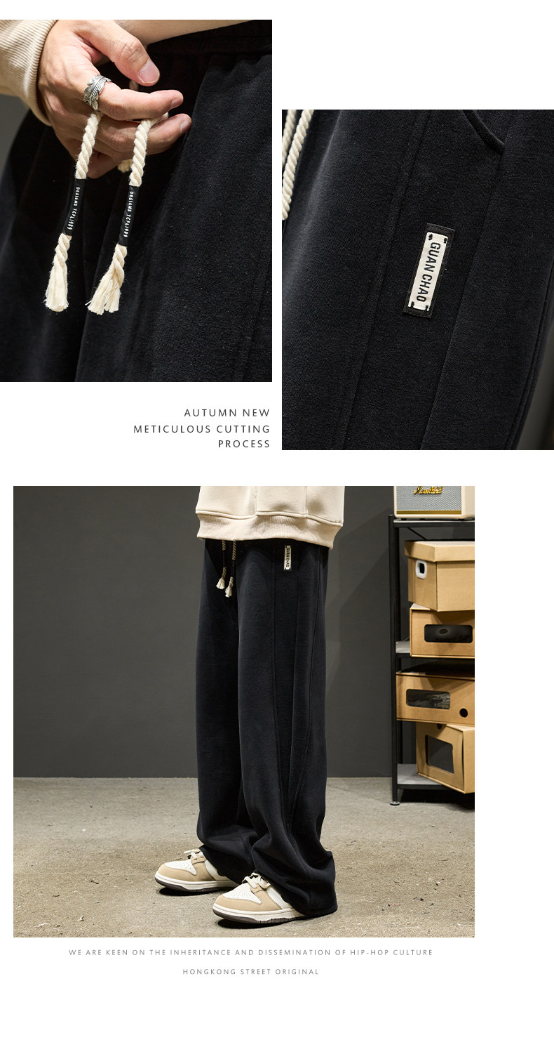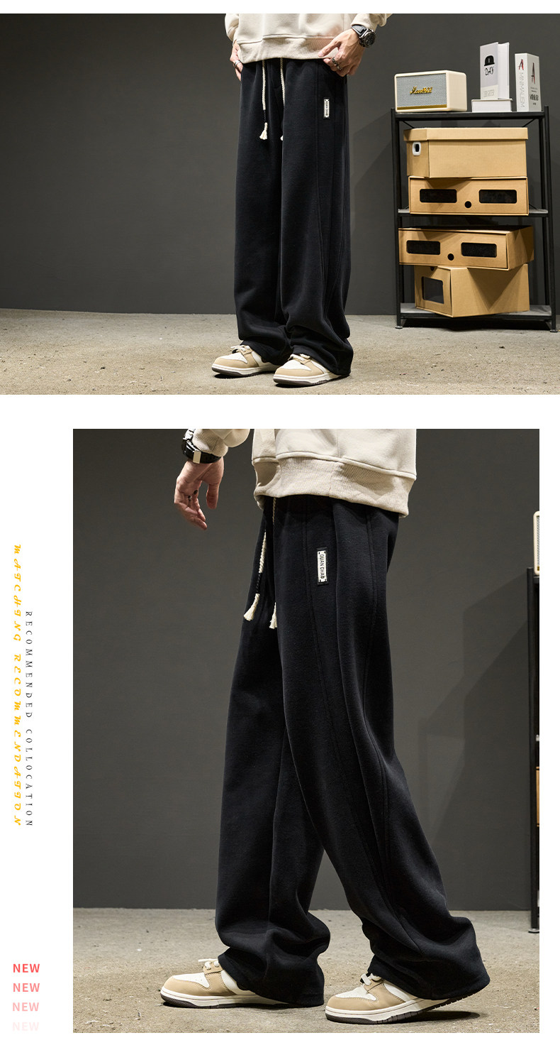 Men's Sweatpants, New Autumn and Winter Style, Fleece-Lined, American Heavy-Duty Patchwork Deconstructed Straight-Leg Pants, Black Loose-Fitting Sports Casual Pants