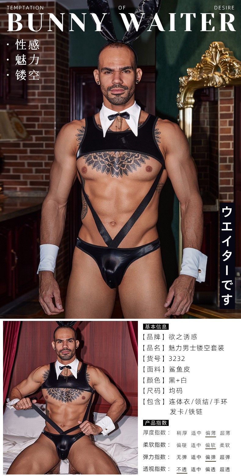 Foreign Trade European and American New Nightclub Rabbit Suit Patent Leather Thong Low Sexy Maid Uniform Sexy Macho Black