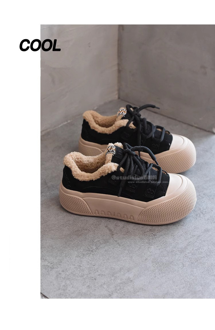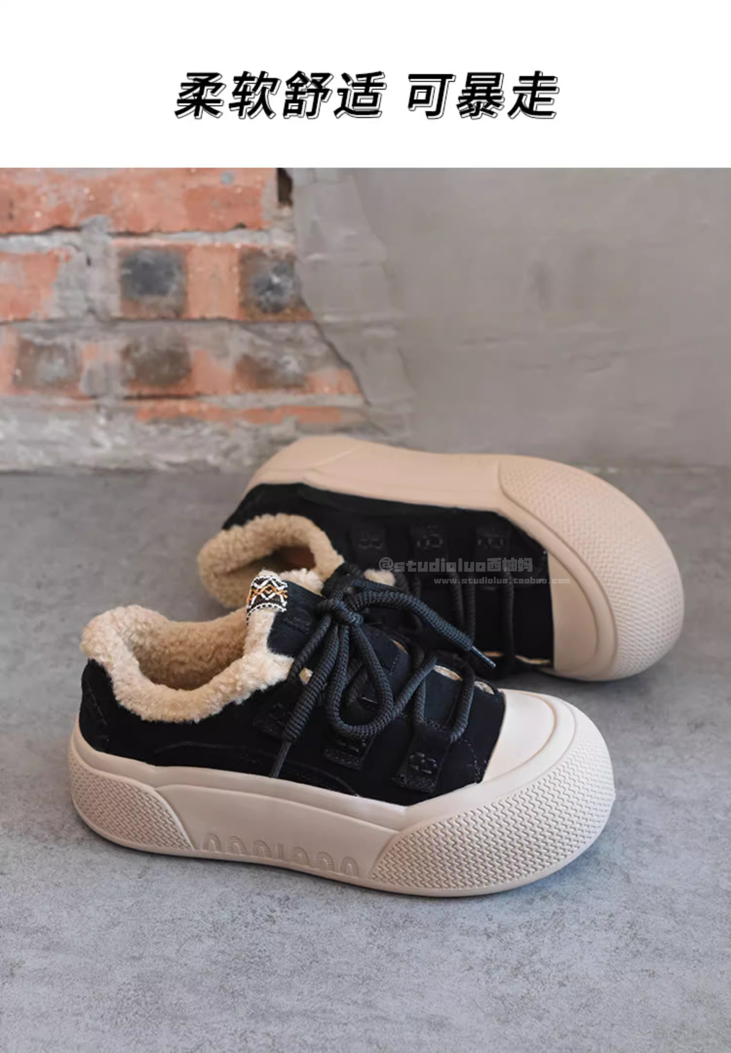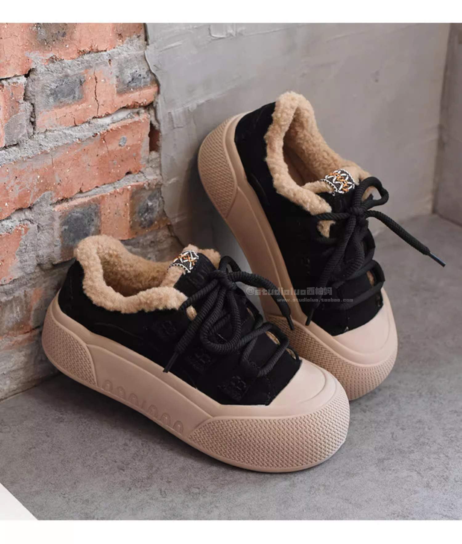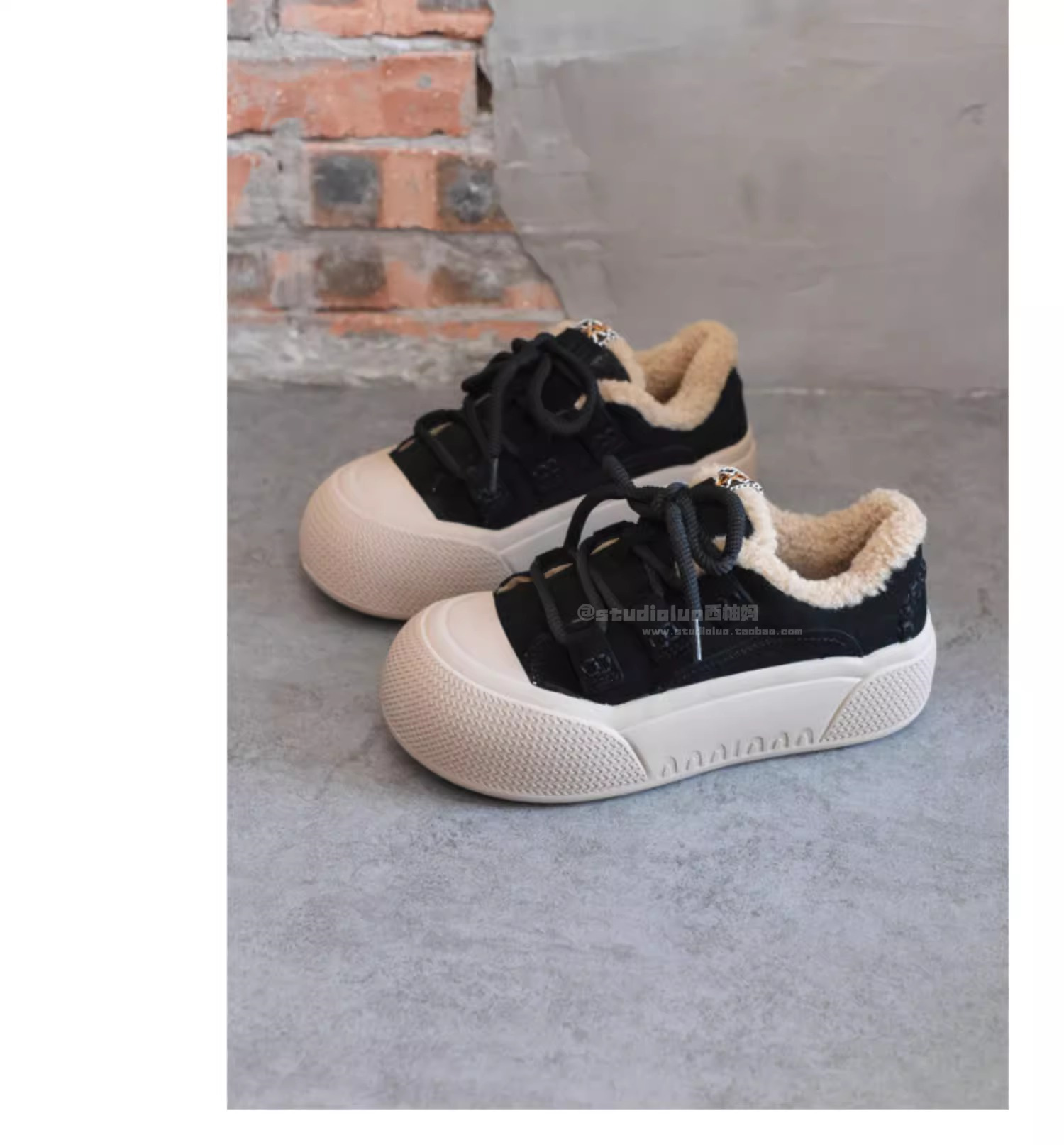 Hong Kong Style Cute Big-Head Loafers for Women, Fleece-Lined and Warm, 2025 Winter New Casual Soft-Soled Furry Sneakers
