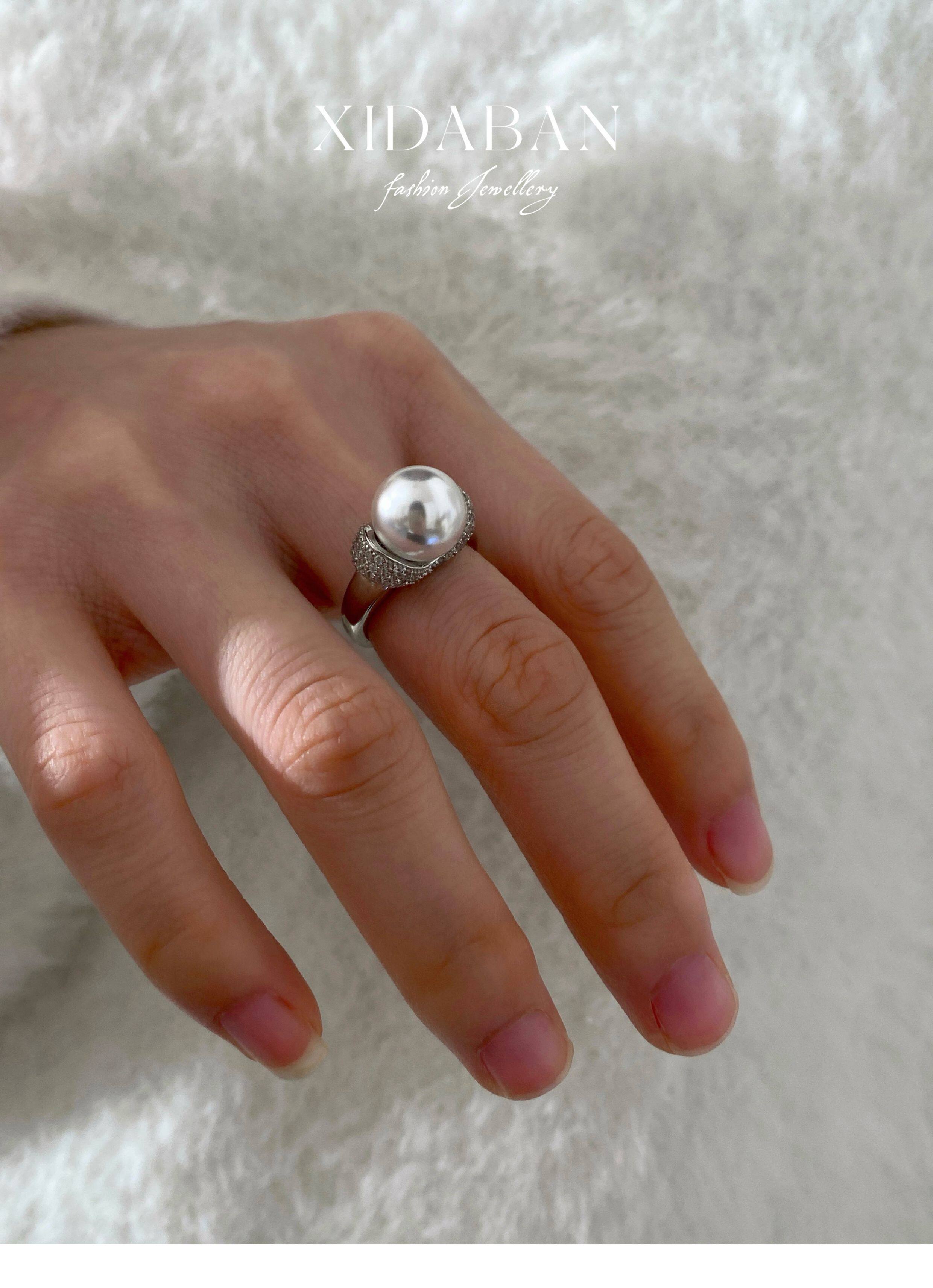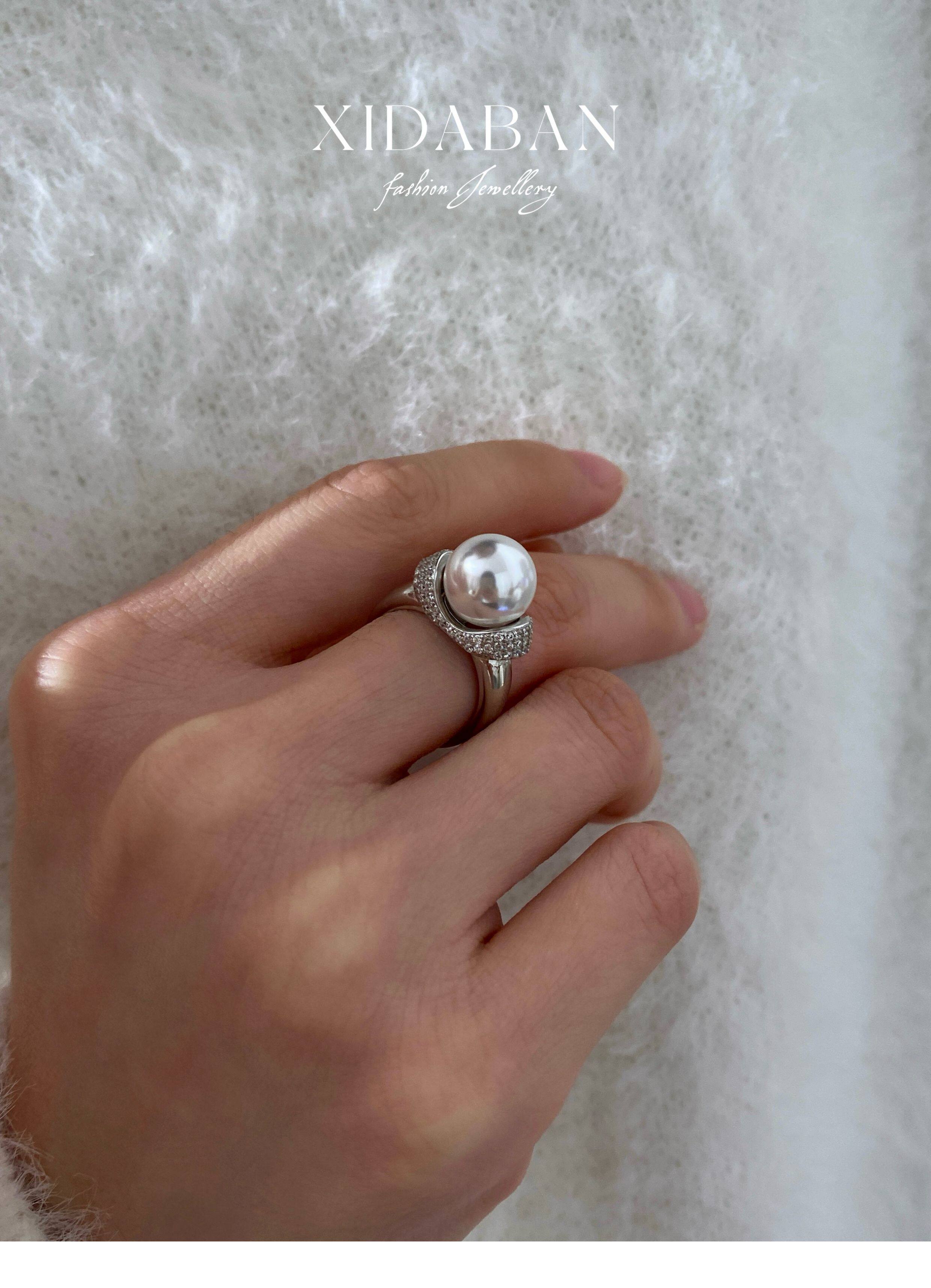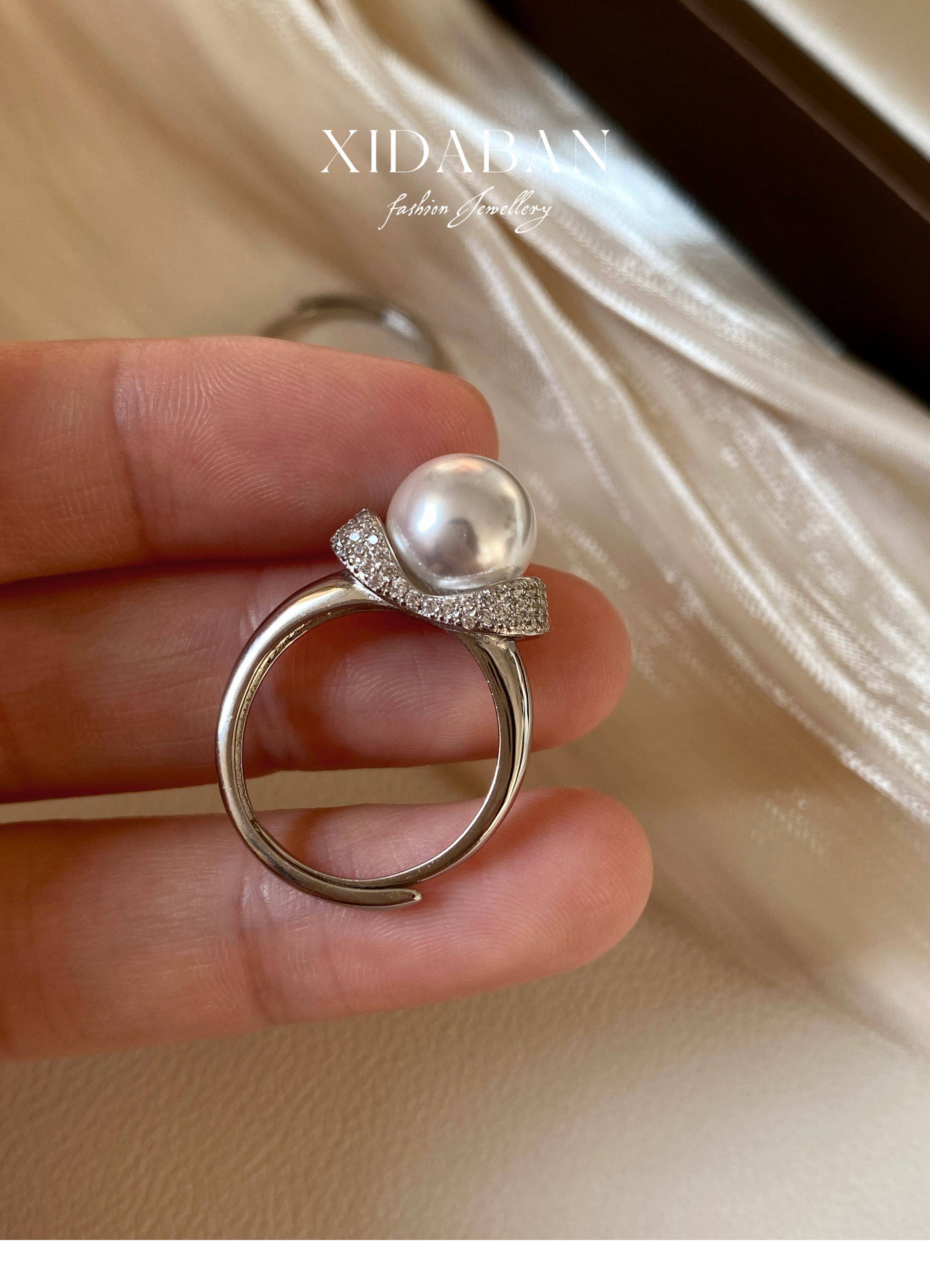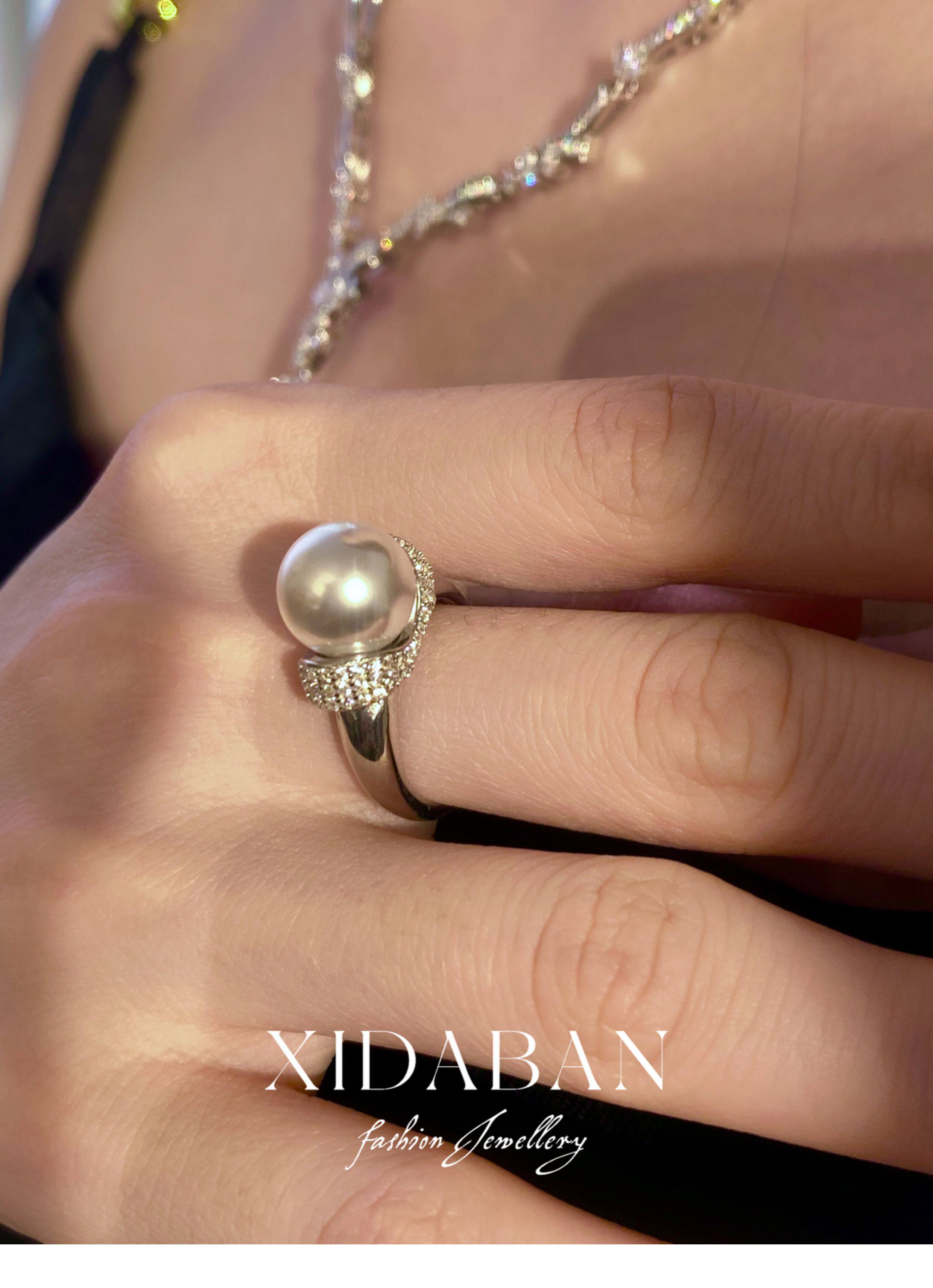 Artificial Australian White Pearl Ring for Women, Niche Design, S925 Silver, Zircon Diamond, Light Luxury, High-End Feel, Adjustable Open Ring