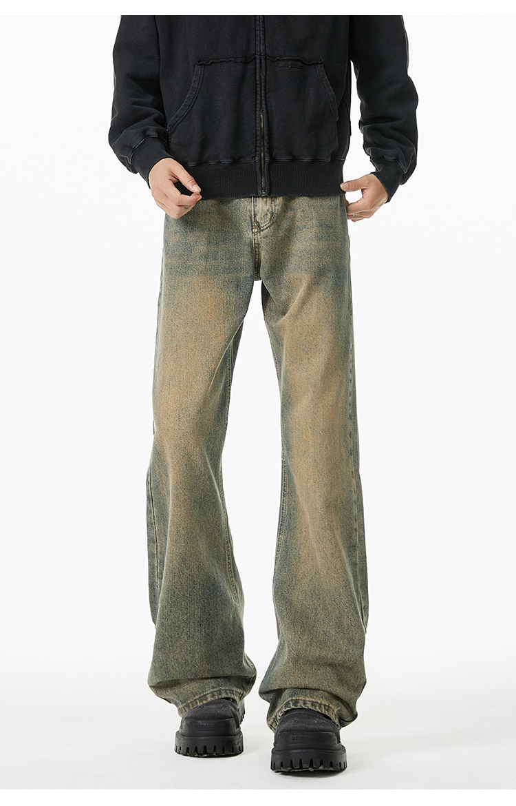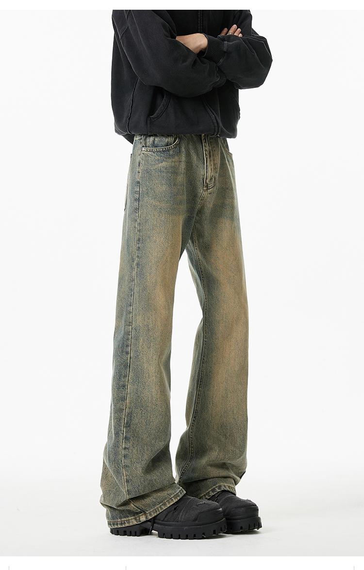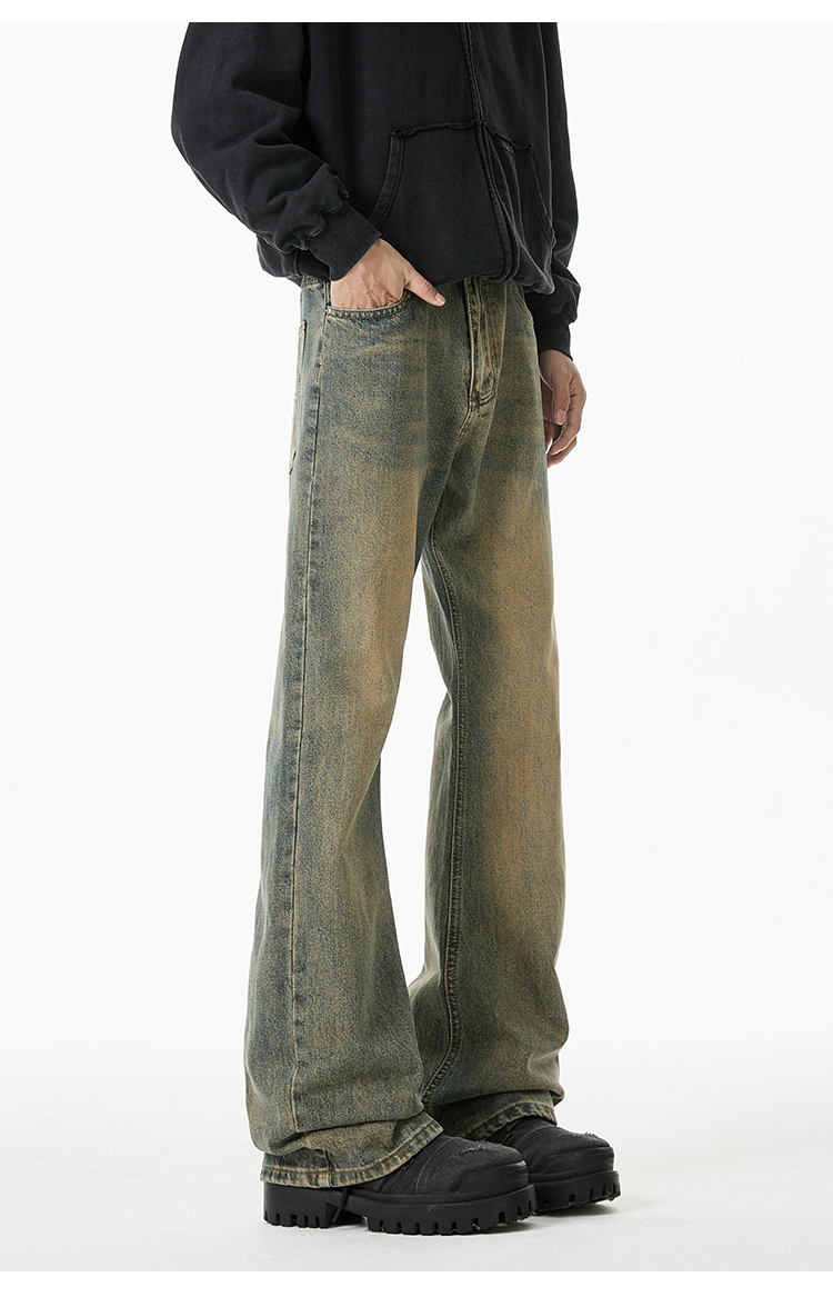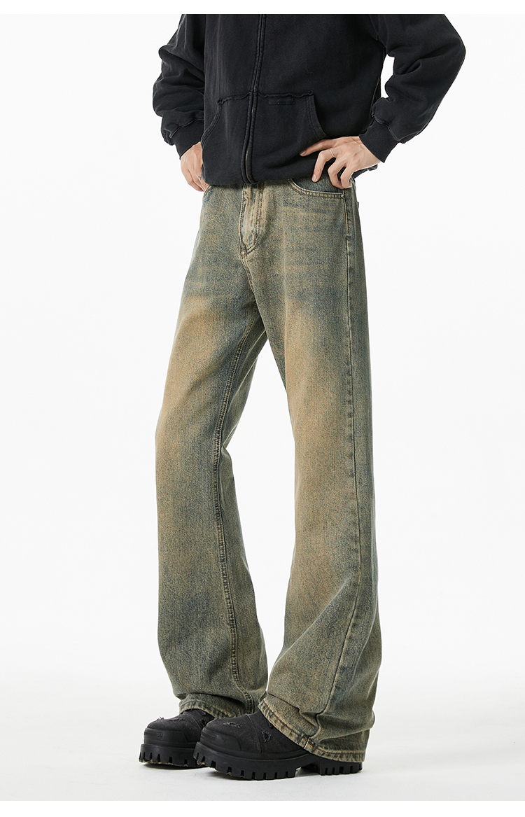 V37 American Retro Black Flared Pants for Men, Autumn High Street Cleanfit Loose Wide-Leg Fleece-Lined Jeans