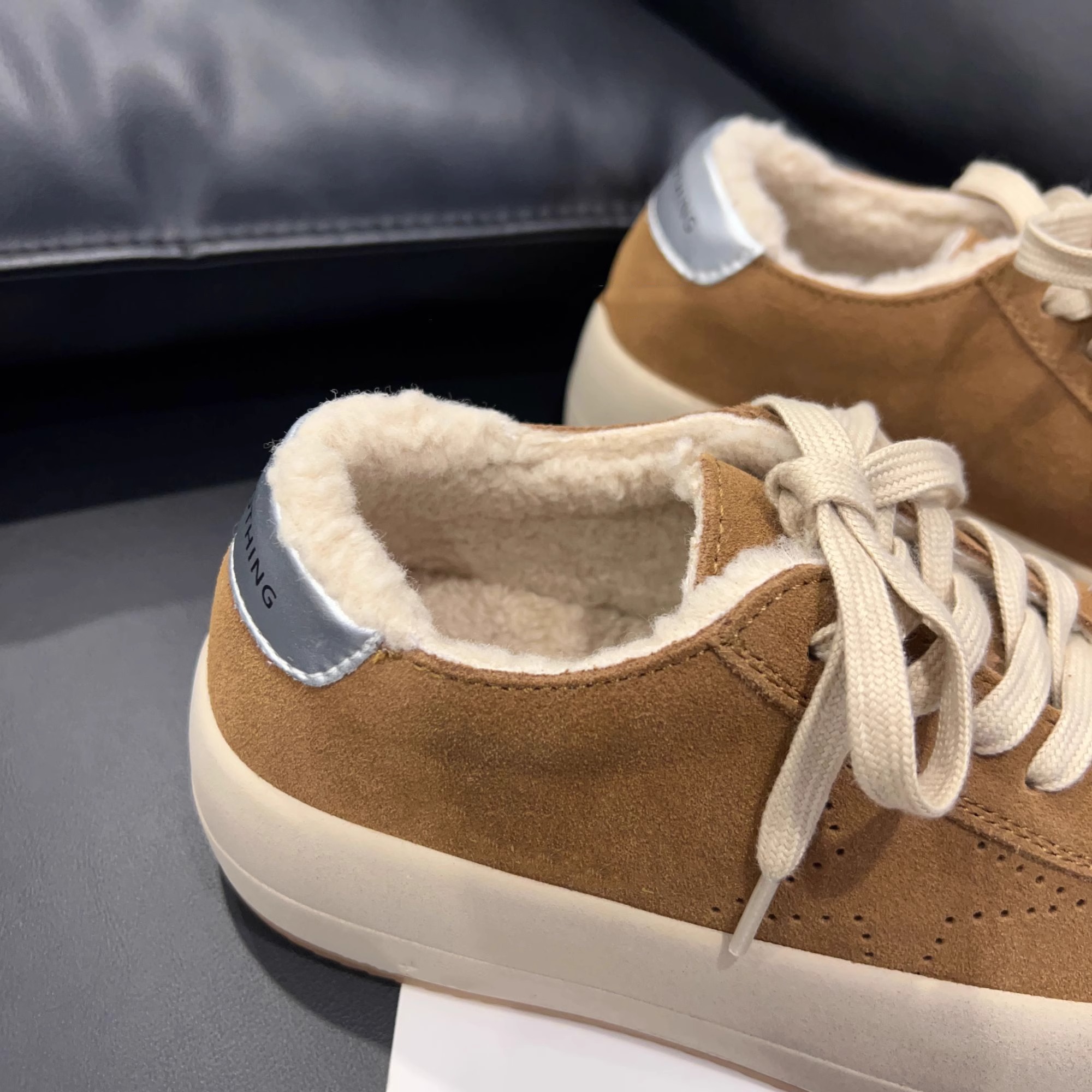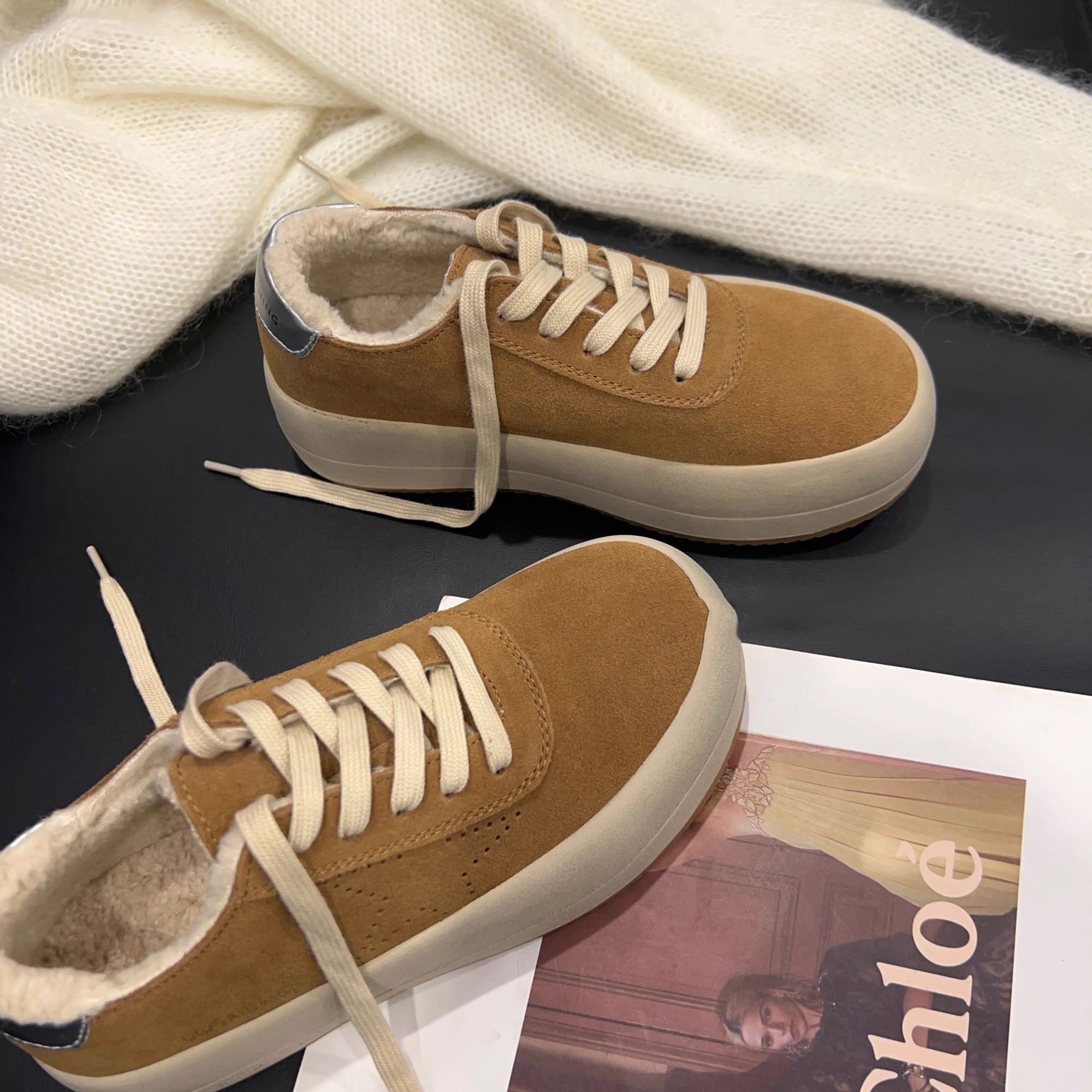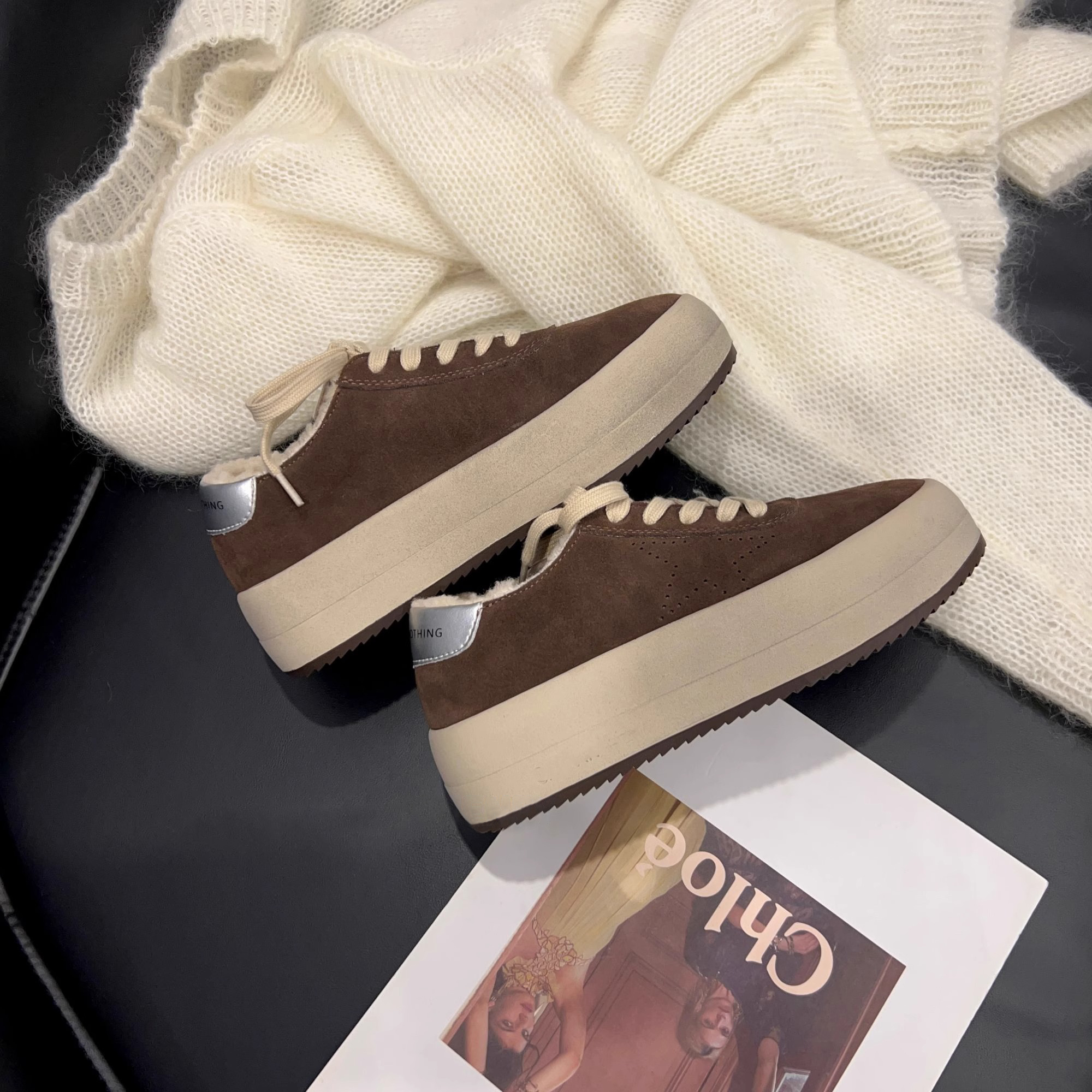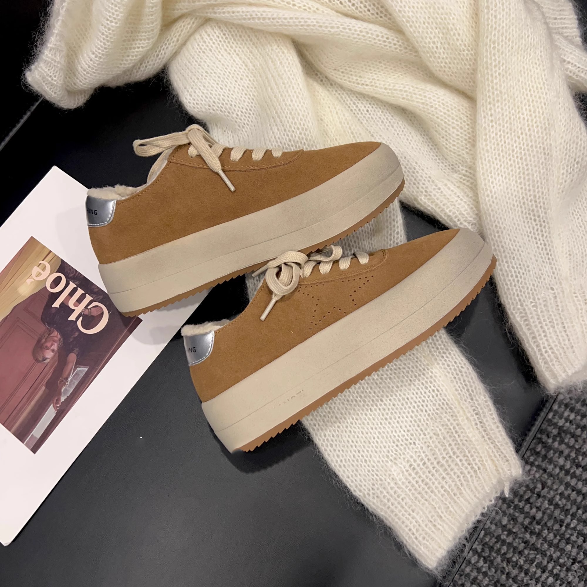 Hong Kong Genuine Leather Thick-Soled Sneakers for Women 2025 New Winter Fleece-Lined Casual Shoes Korean Style Warm Star Sports Cotton Shoes