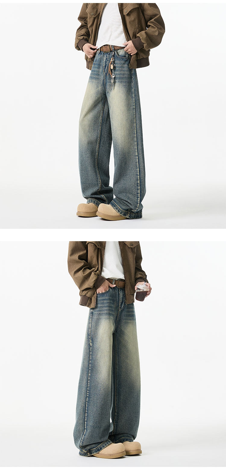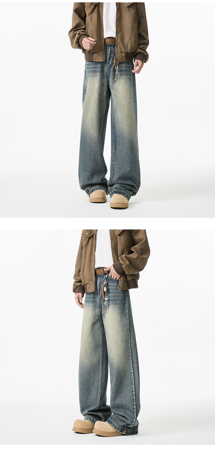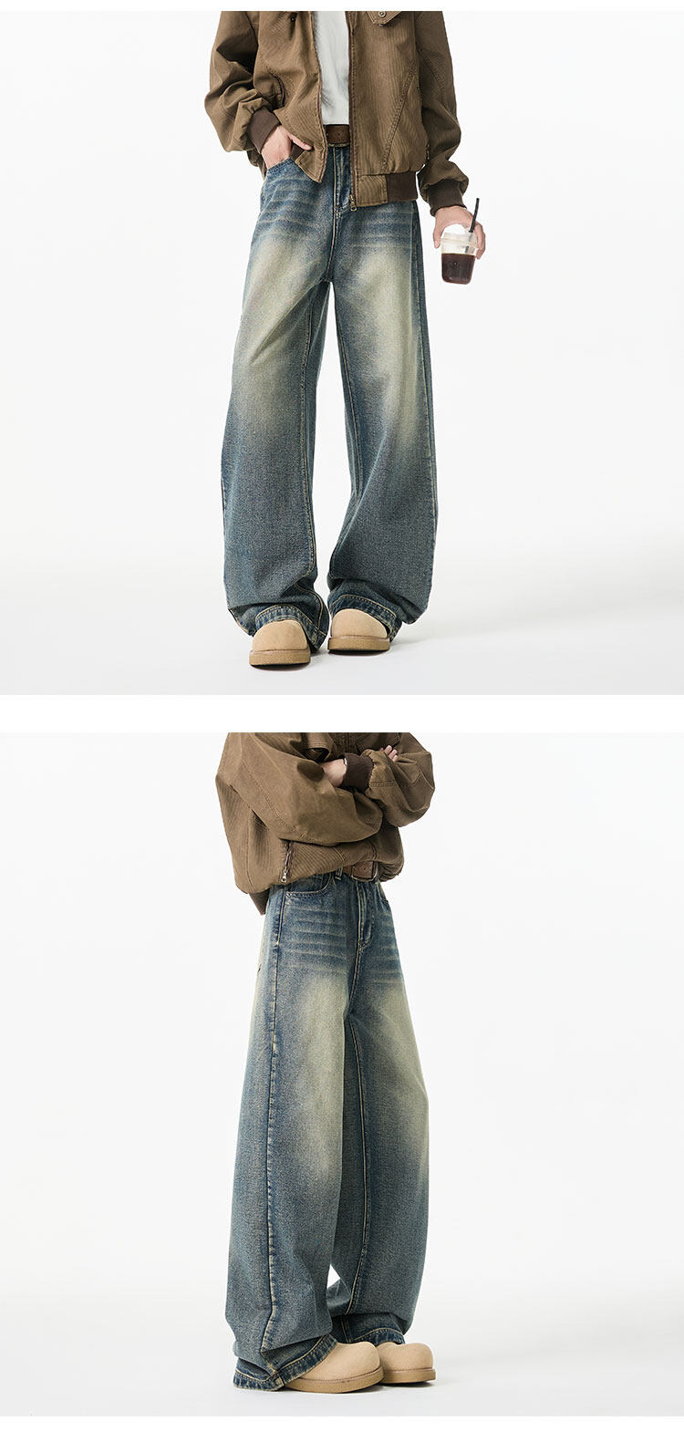 American-Style Whiskered Washed Vintage Jeans for Men, Loose Fit, Retro Design, Cleanfit Straight-Leg Wide-Leg Long Pants